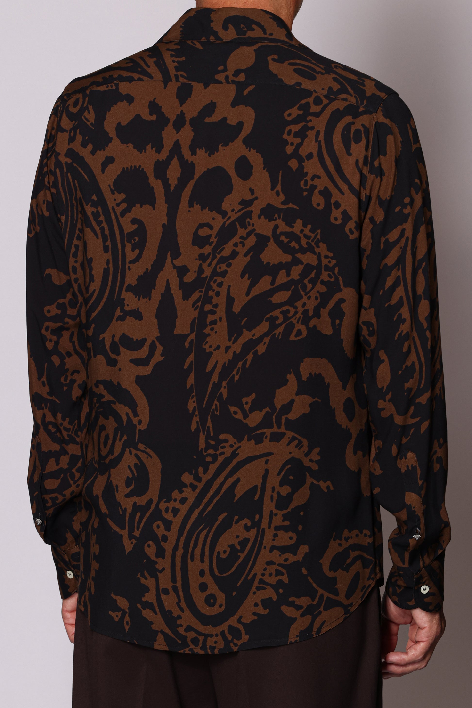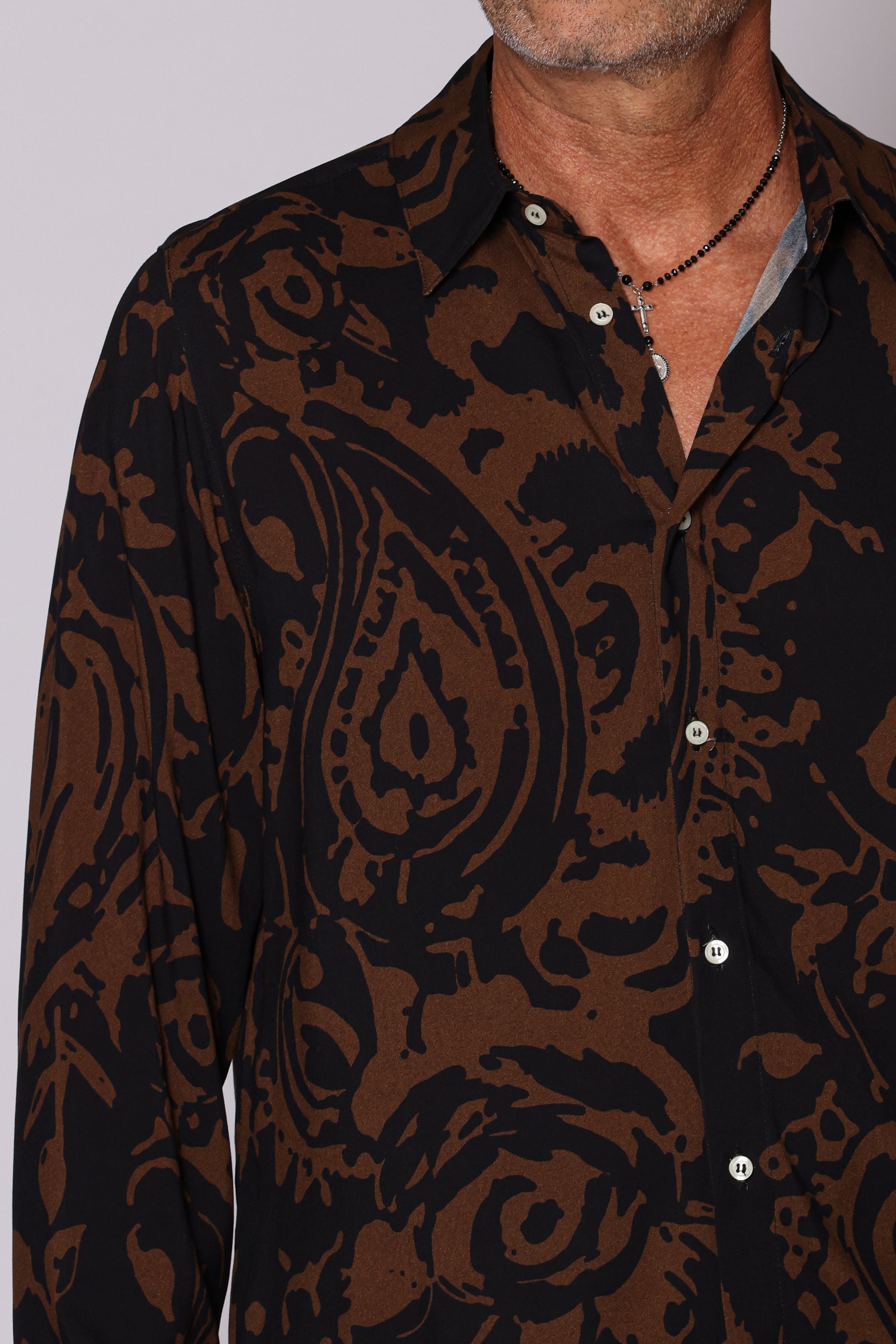 Camicia fantasia, chiusura centrale con bottoni, fondo leggermente stondato. Composizione: 100% viscosa. Il modello è alto 178 cm pesa 74 kg indossa taglia M.