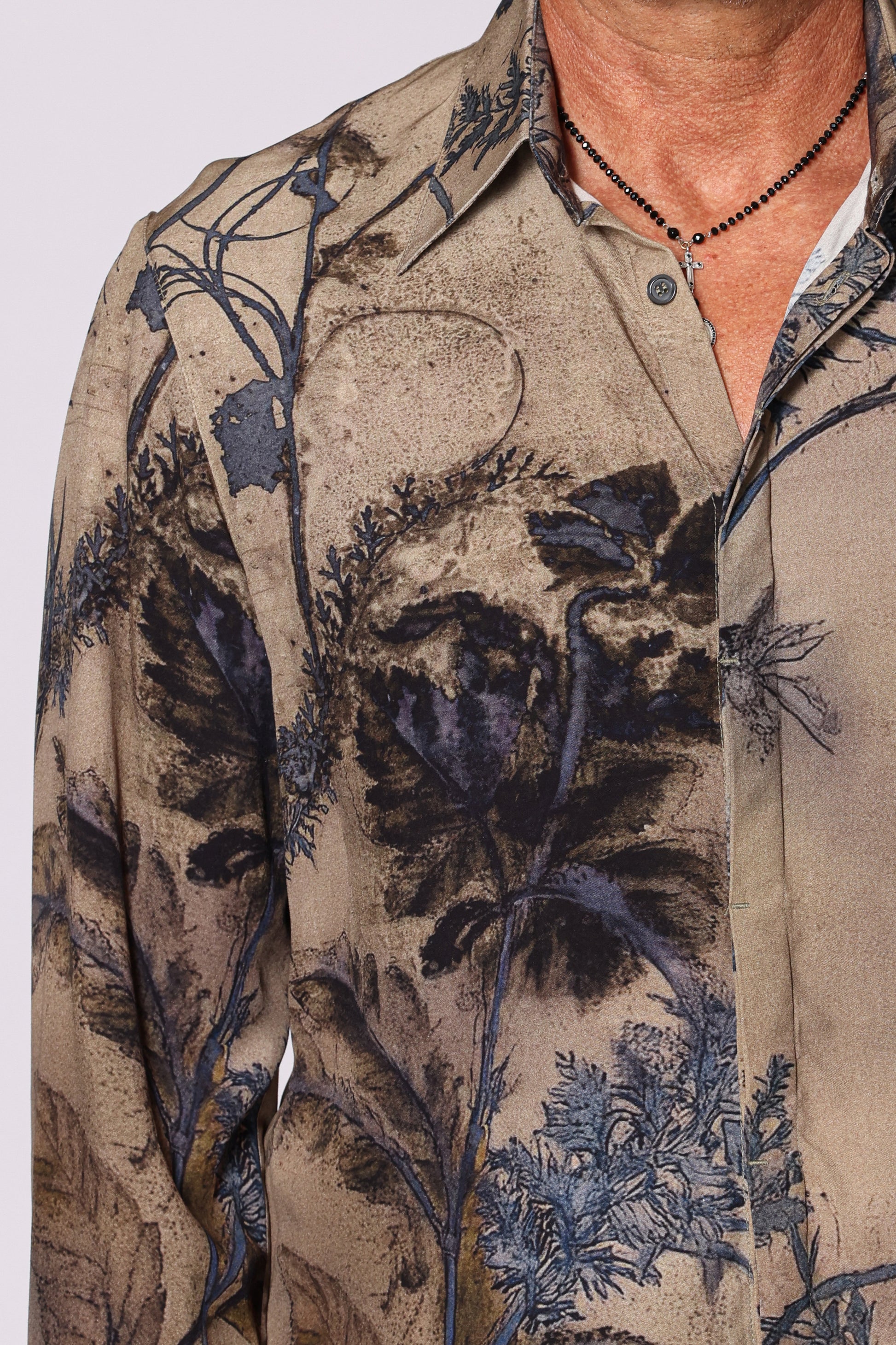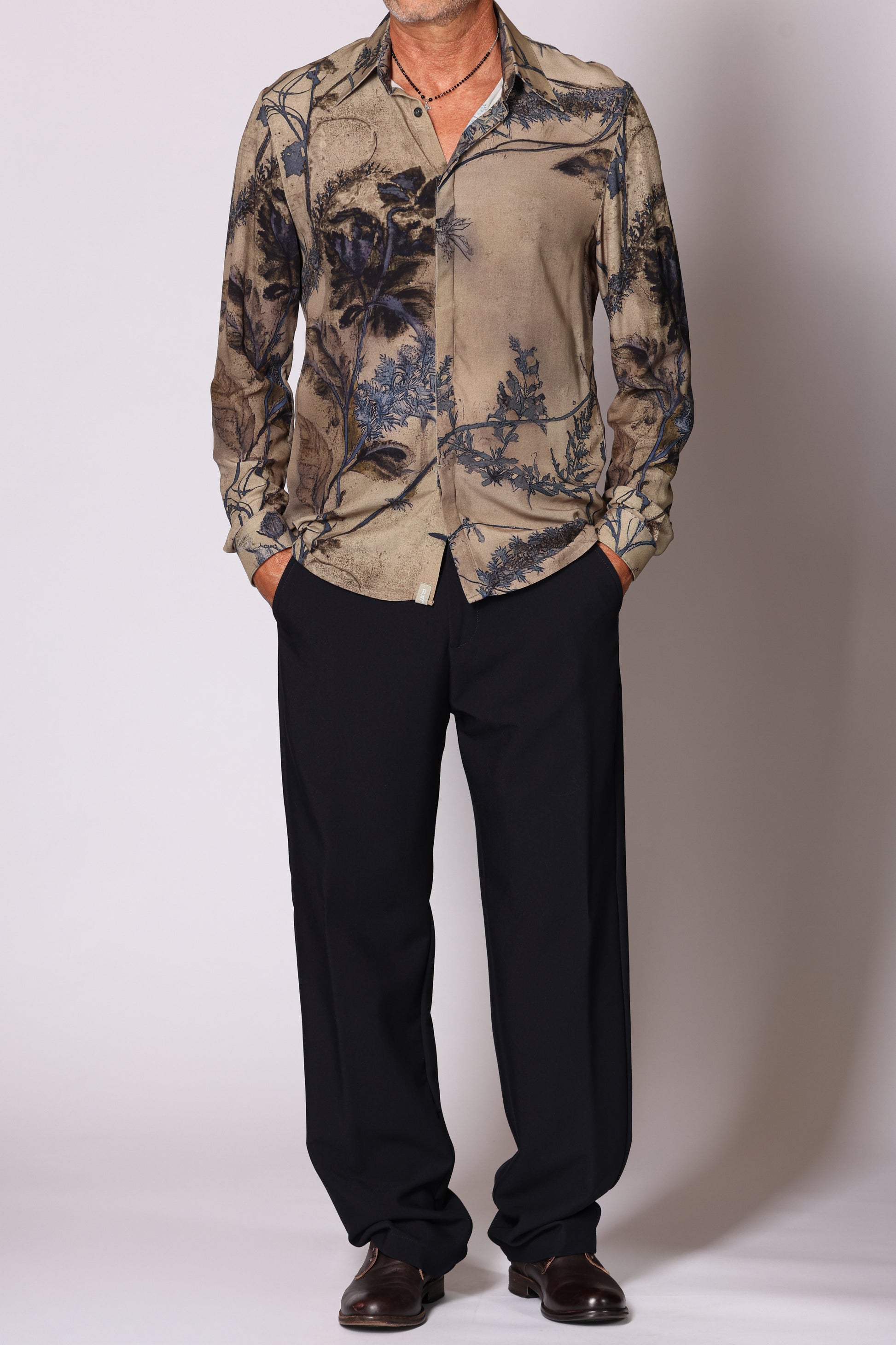Camicia fantasia, chiusura centrale con bottoni a scomparsa, fondo leggermente stondato. Composizione: 100% viscosa. Il modello è alto 180 cm pesa 74 kg indossa taglia L.