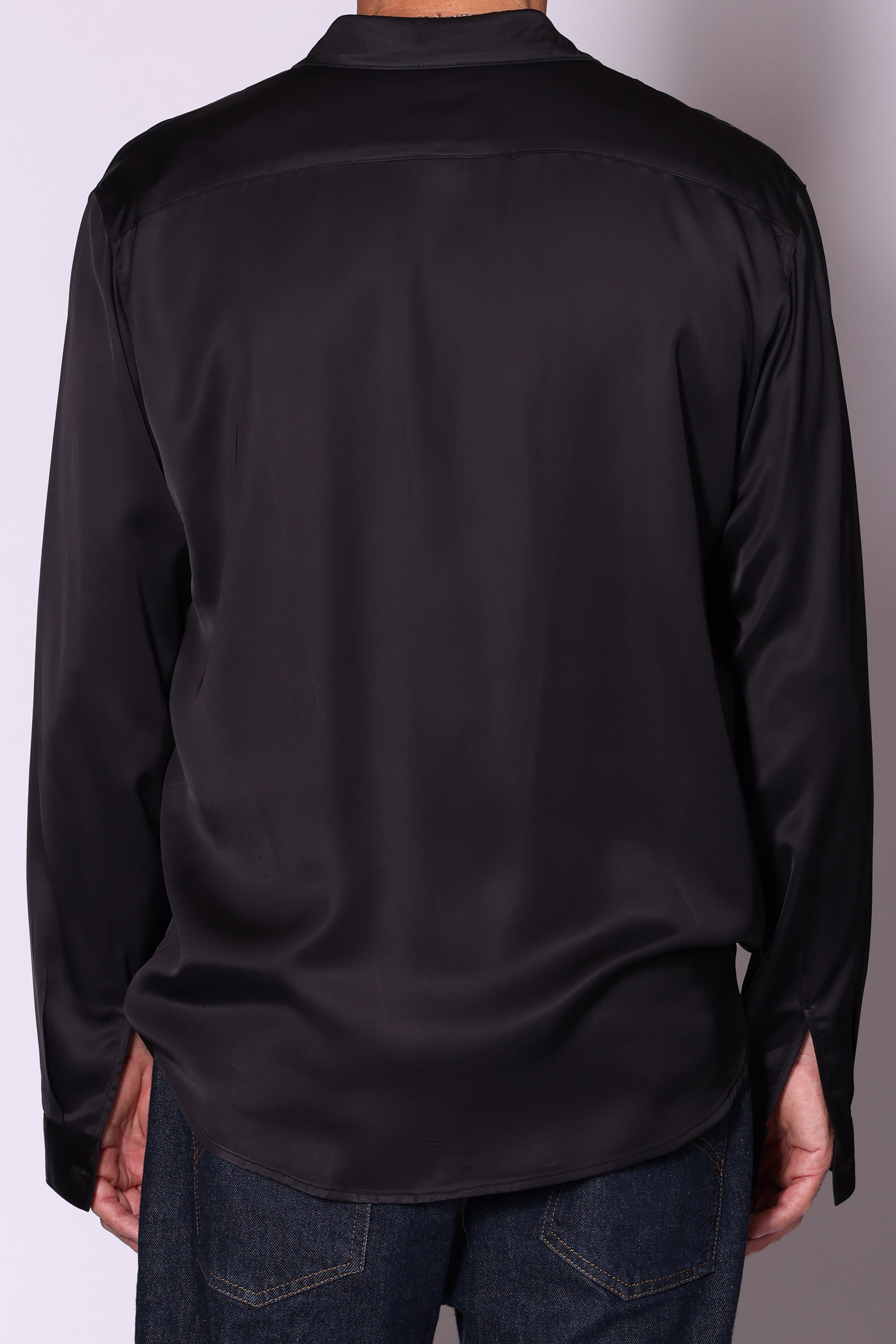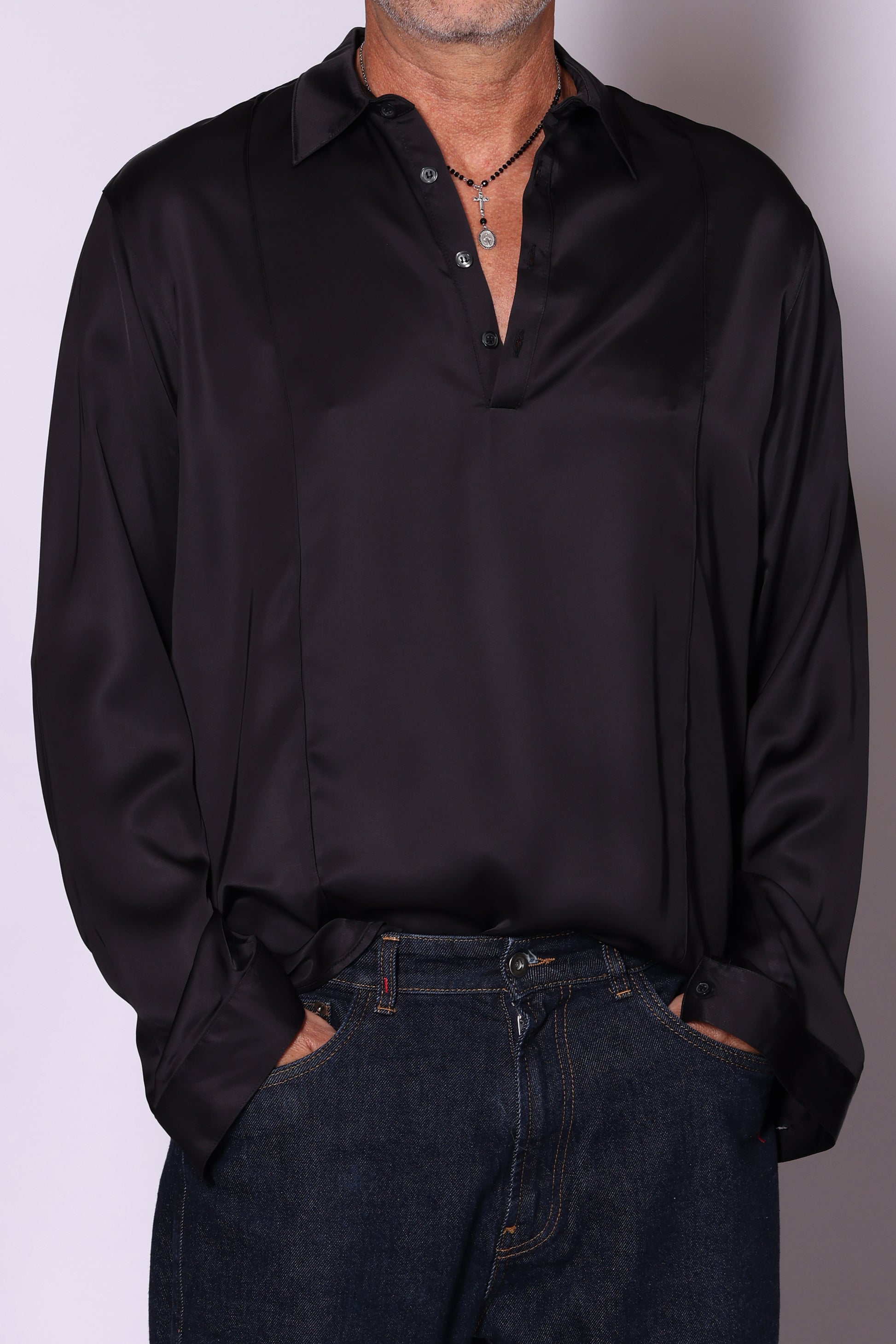 Camicia simil raso serafino, fondo leggermente stondato. Composizione: 100% viscosa. Il modello è alto 180 cm pesa 74 kg indossa taglia L.