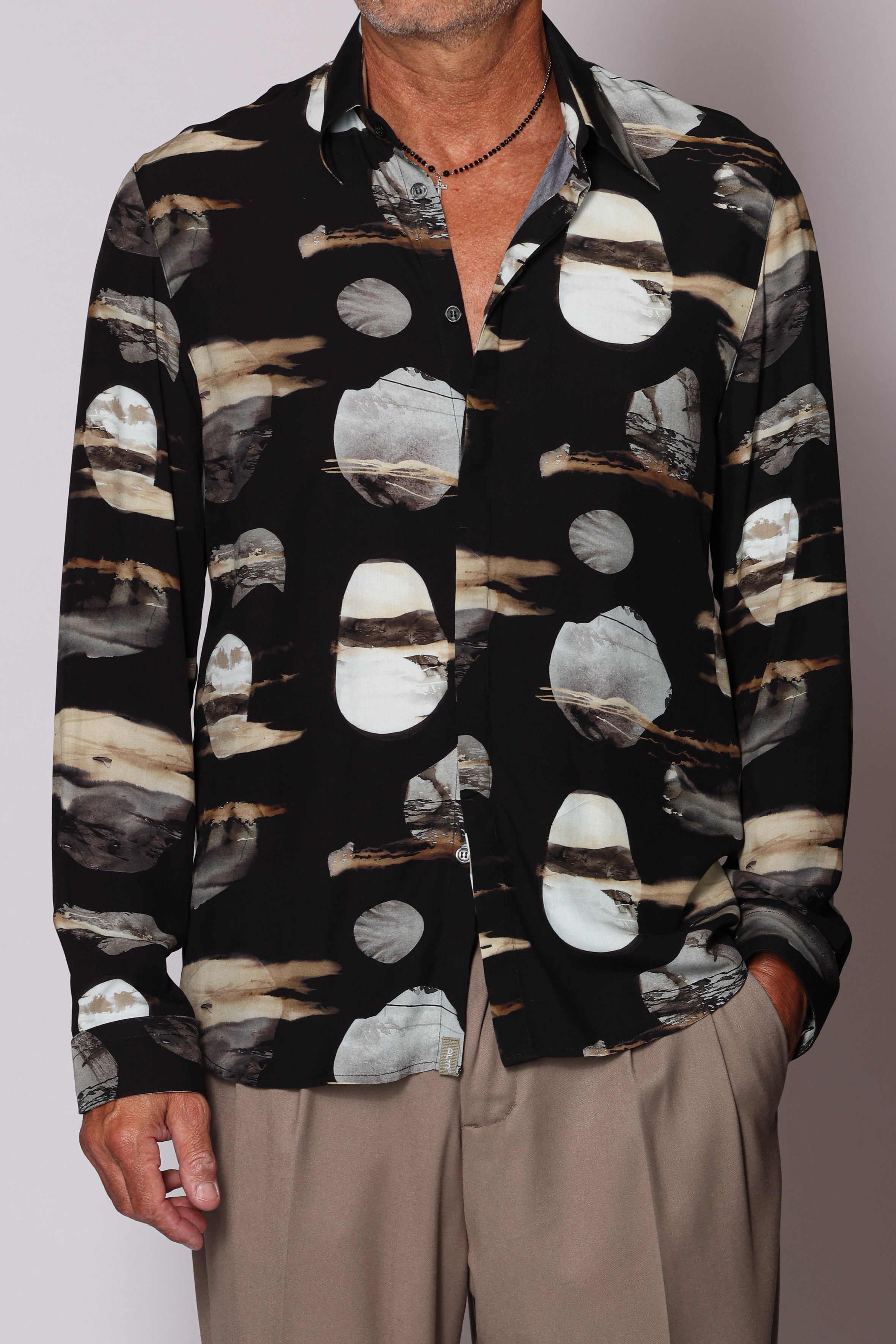 Camicia fantasia, chiusura centrale con bottoni a scomparsa, fondo leggermente stondato. Composizione: 100% viscosa. Il modello è alto 180 cm pesa 74 kg indossa taglia L.