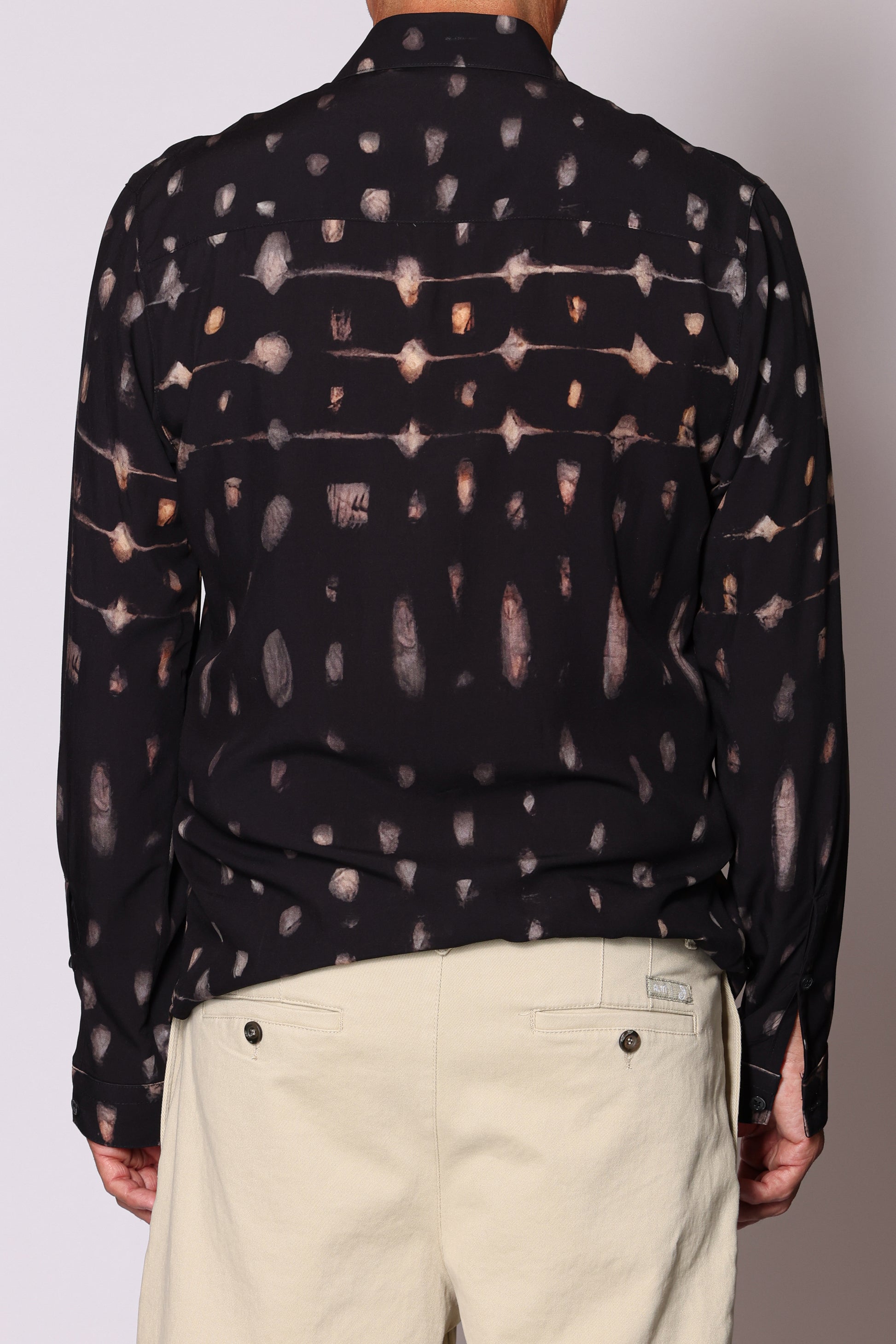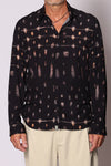 Camicia fantasia, chiusura centrale con bottoni a scomparsa, fondo leggermente stondato. Composizione: 100% viscosa. Il modello è alto 180 cm pesa 74 kg indossa taglia L.