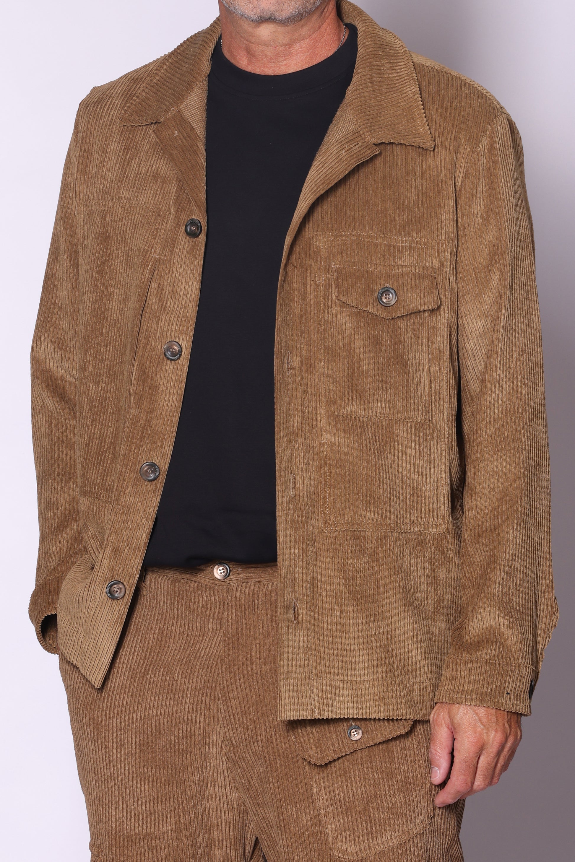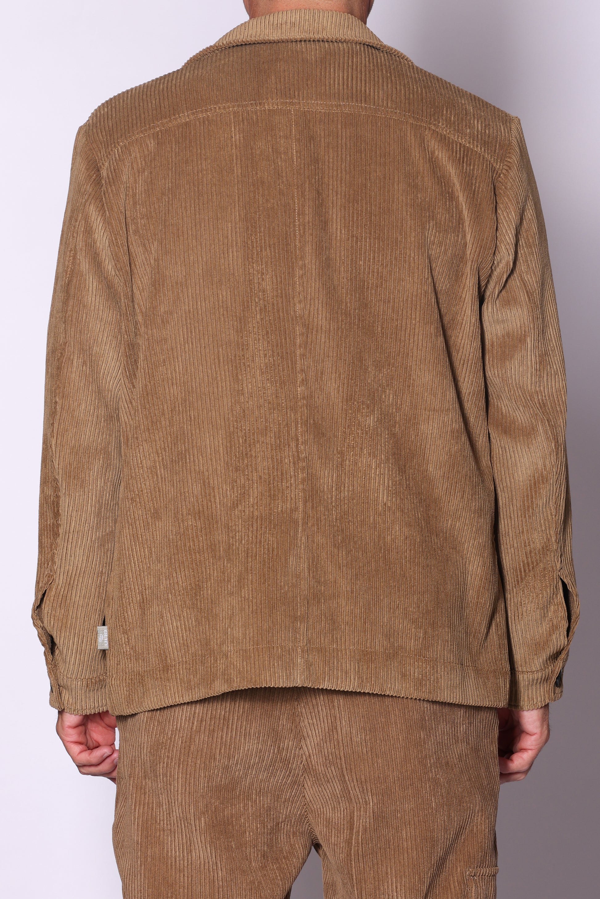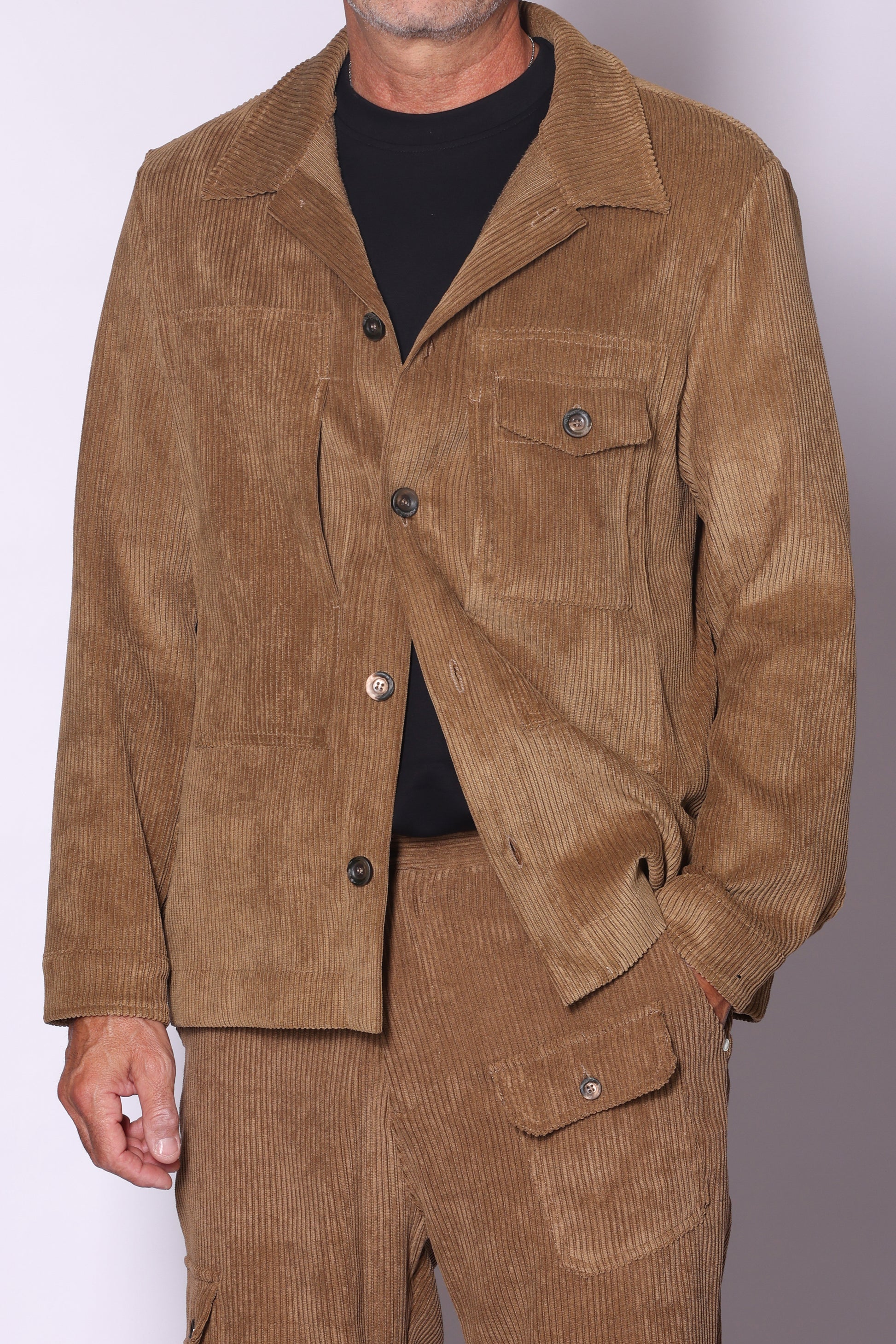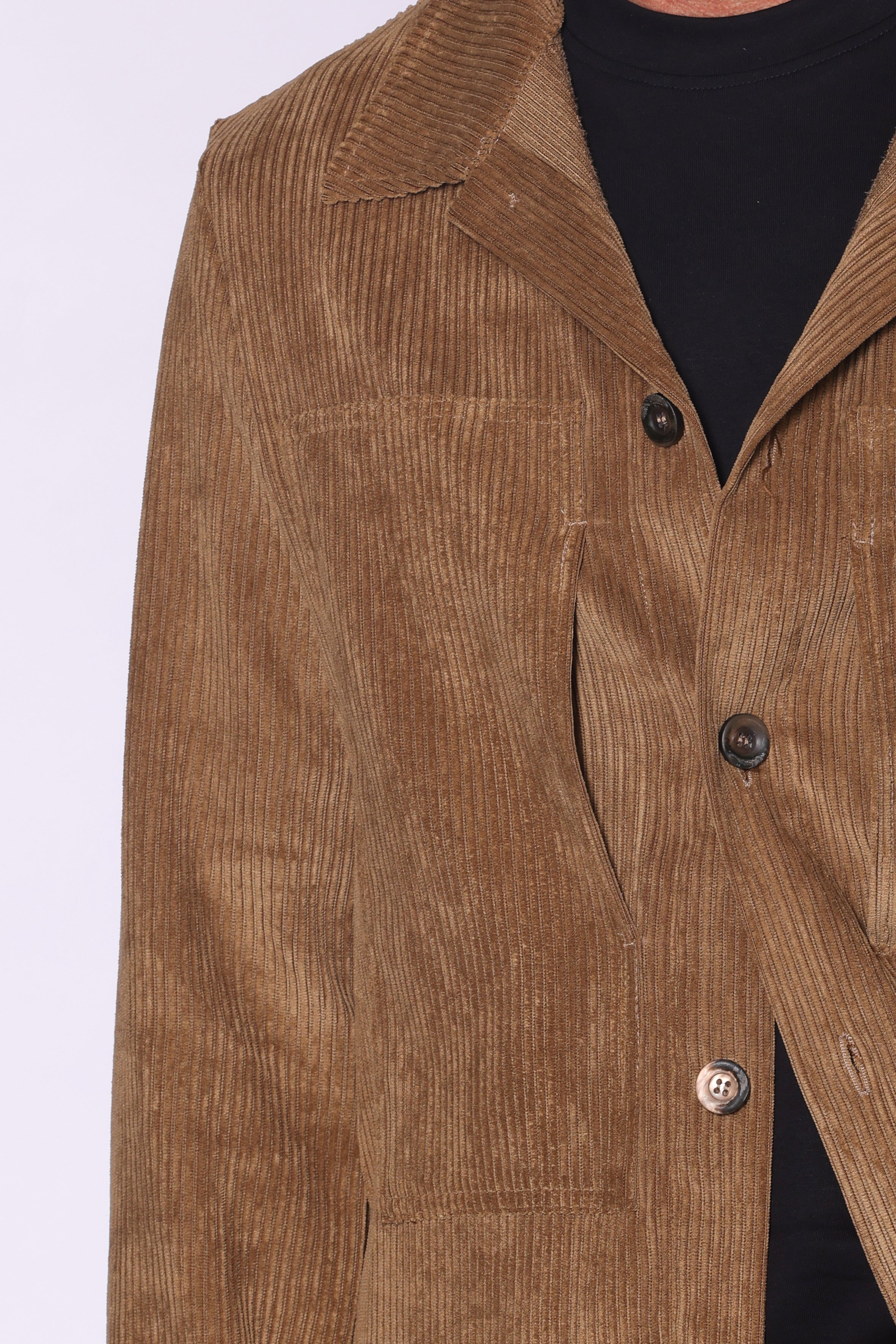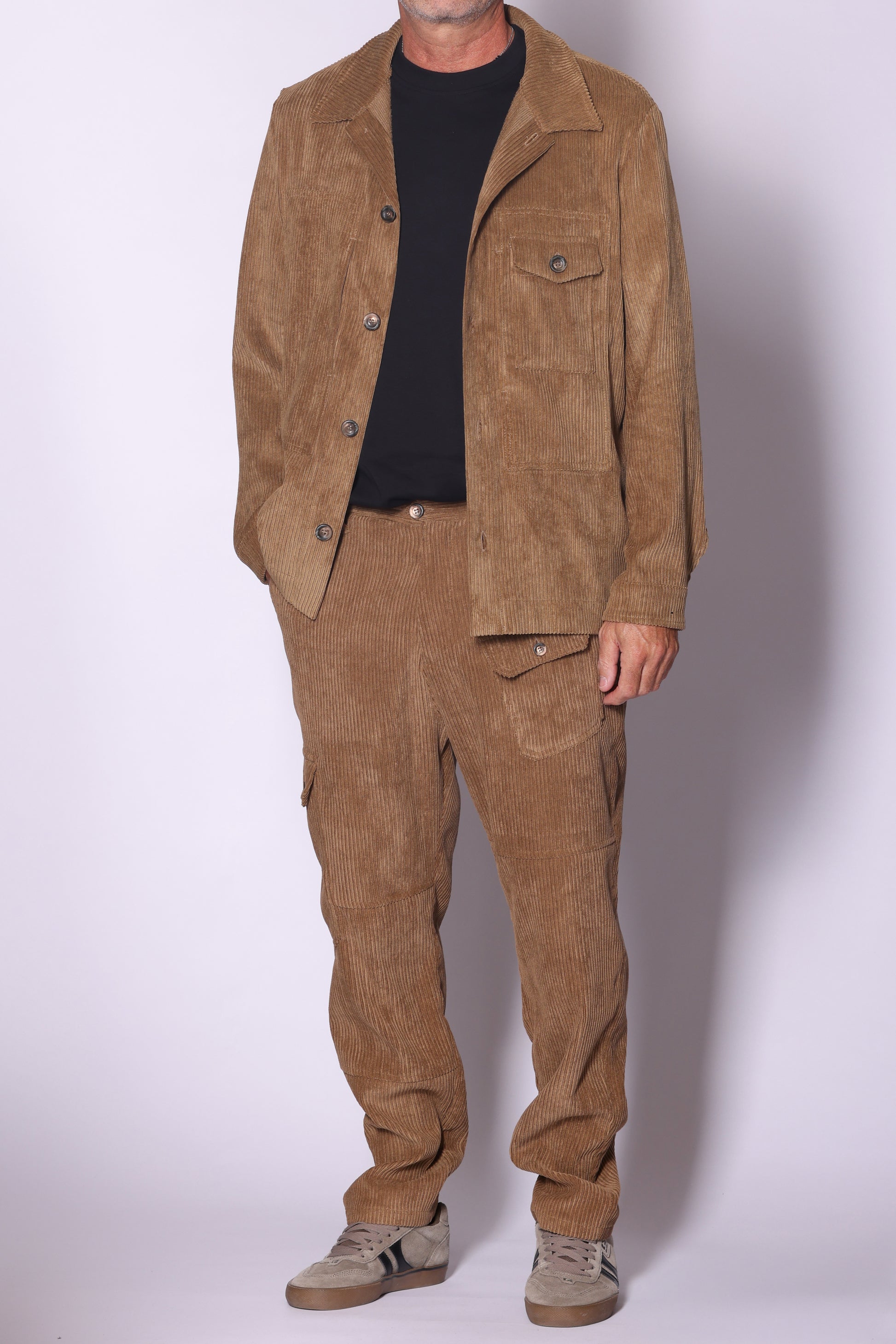 Camicione in velluto a coste, chiusura centrale con bottoni, tasche a toppa sul davanti. Composizione: 90% poliestere, 8% nylon, 2% elastam. Il modello è alto 180 cm pesa 74 kg indossa taglia L.
