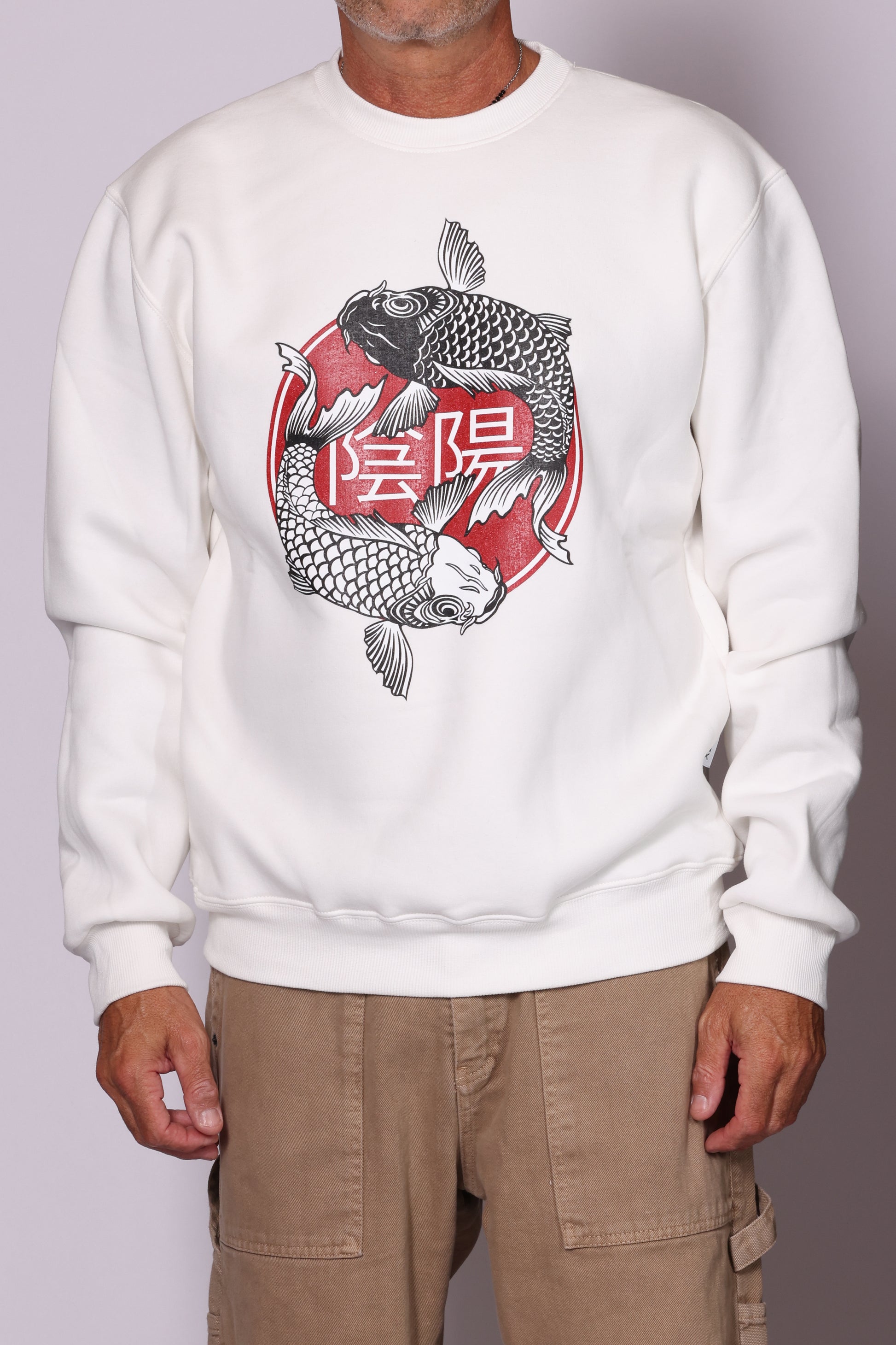 Felpa girocollo con stampa carpa sul davanti. Vestibilità regolare. Interno pile. Composizione: 65% cotone, 35% poliestere. Il modello è alto 180 cm pesa 74 kg indossa taglia L.