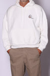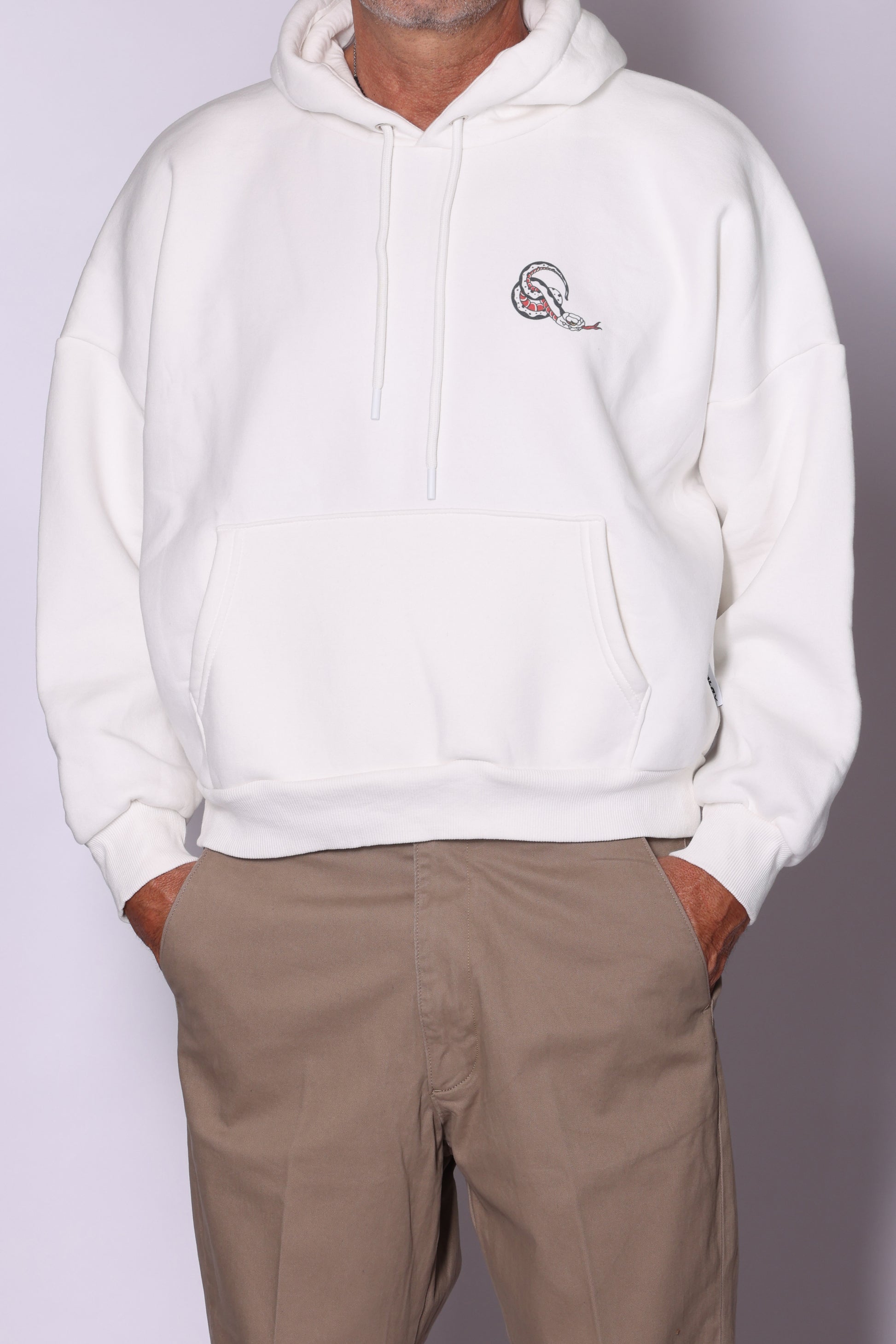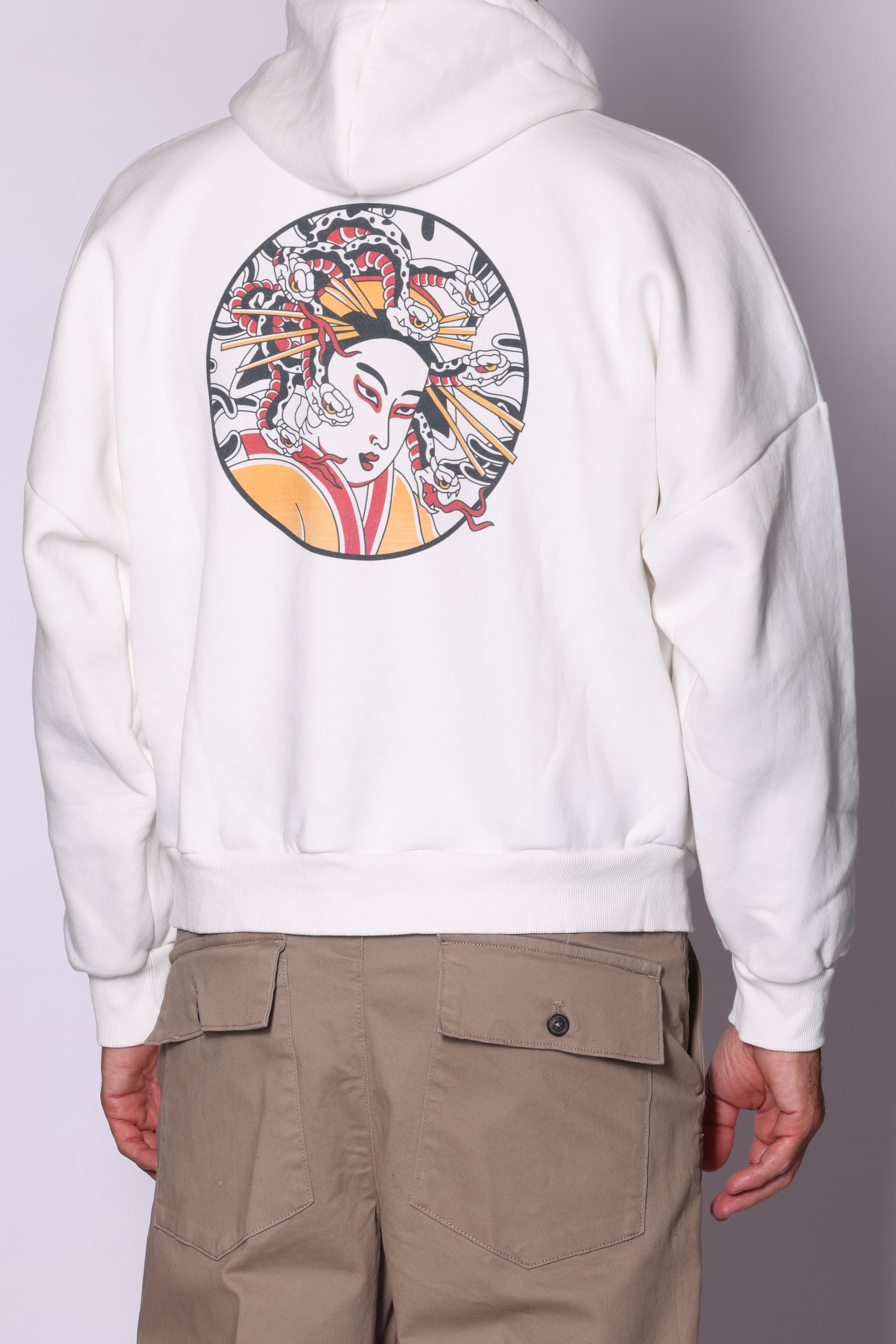 Felpa con cappuccio crop over, stampa fronte e retro.  Interno pile. Composizione: 65% cotone, 35% poliestere. Il modello è alto 180 cm pesa 74 kg indossa taglia L.