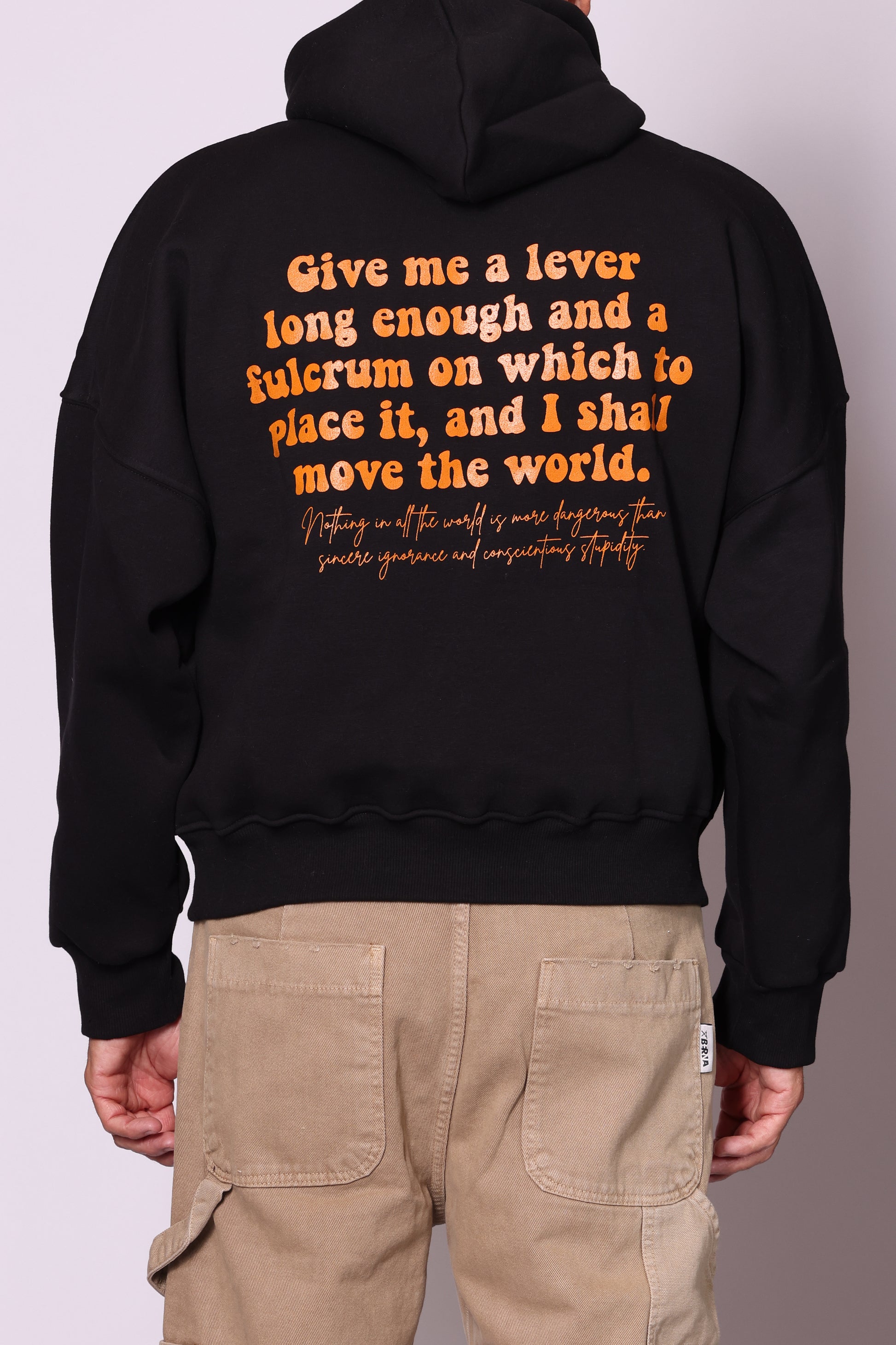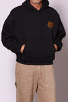 Felpa con cappuccio e tasca a marsupio, stampa fronte e retro. Vestibilità crop over, interno pile. Composizione: 65% cotone, 35% poliestere. Il modello è alto 180 cm pesa 74 kg indossa taglia L.