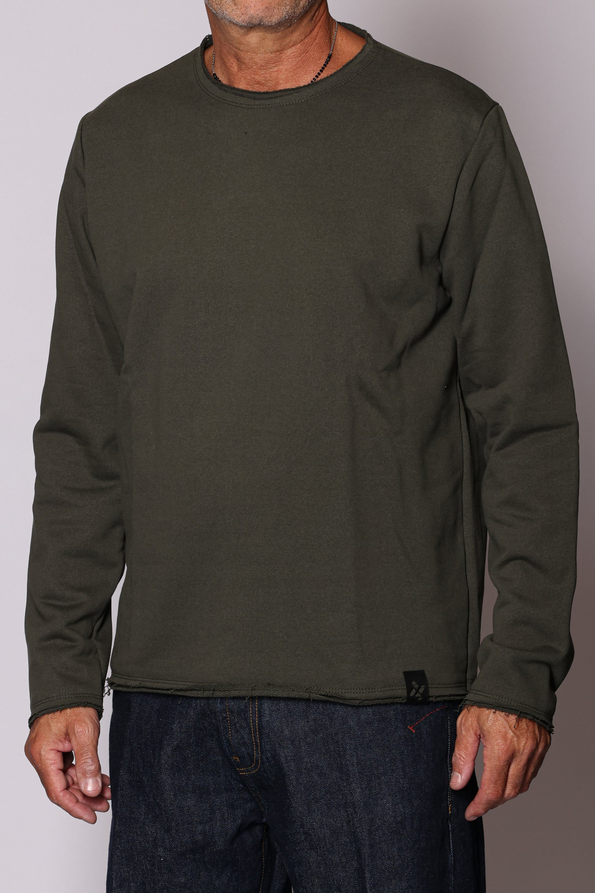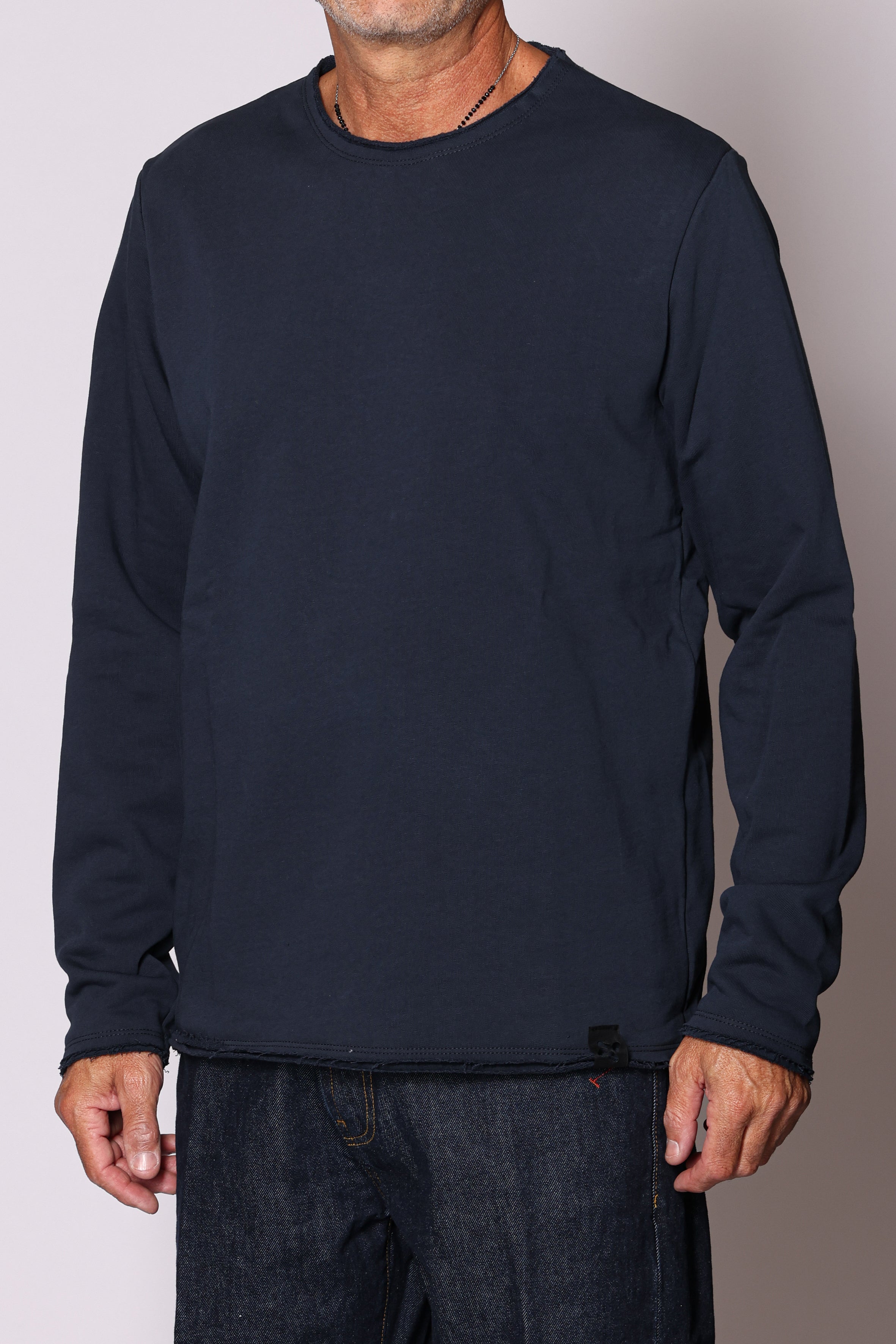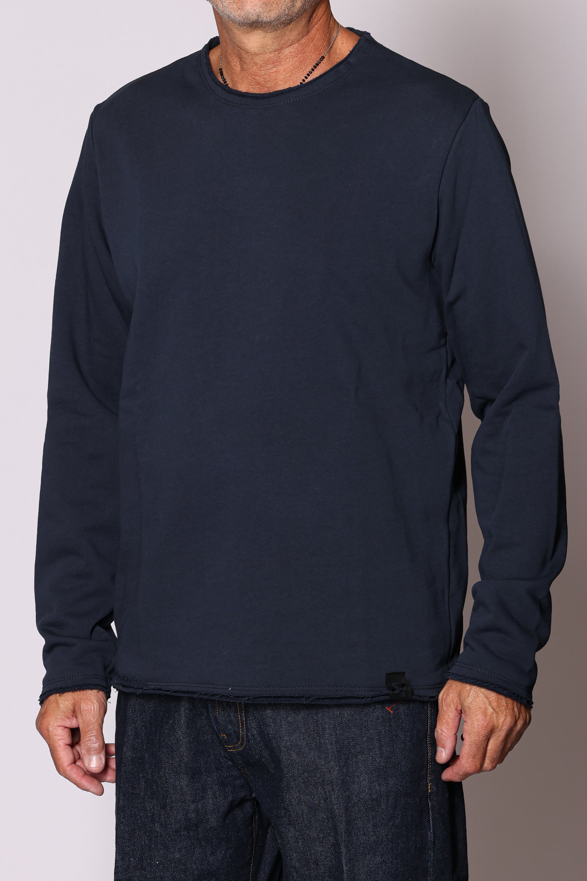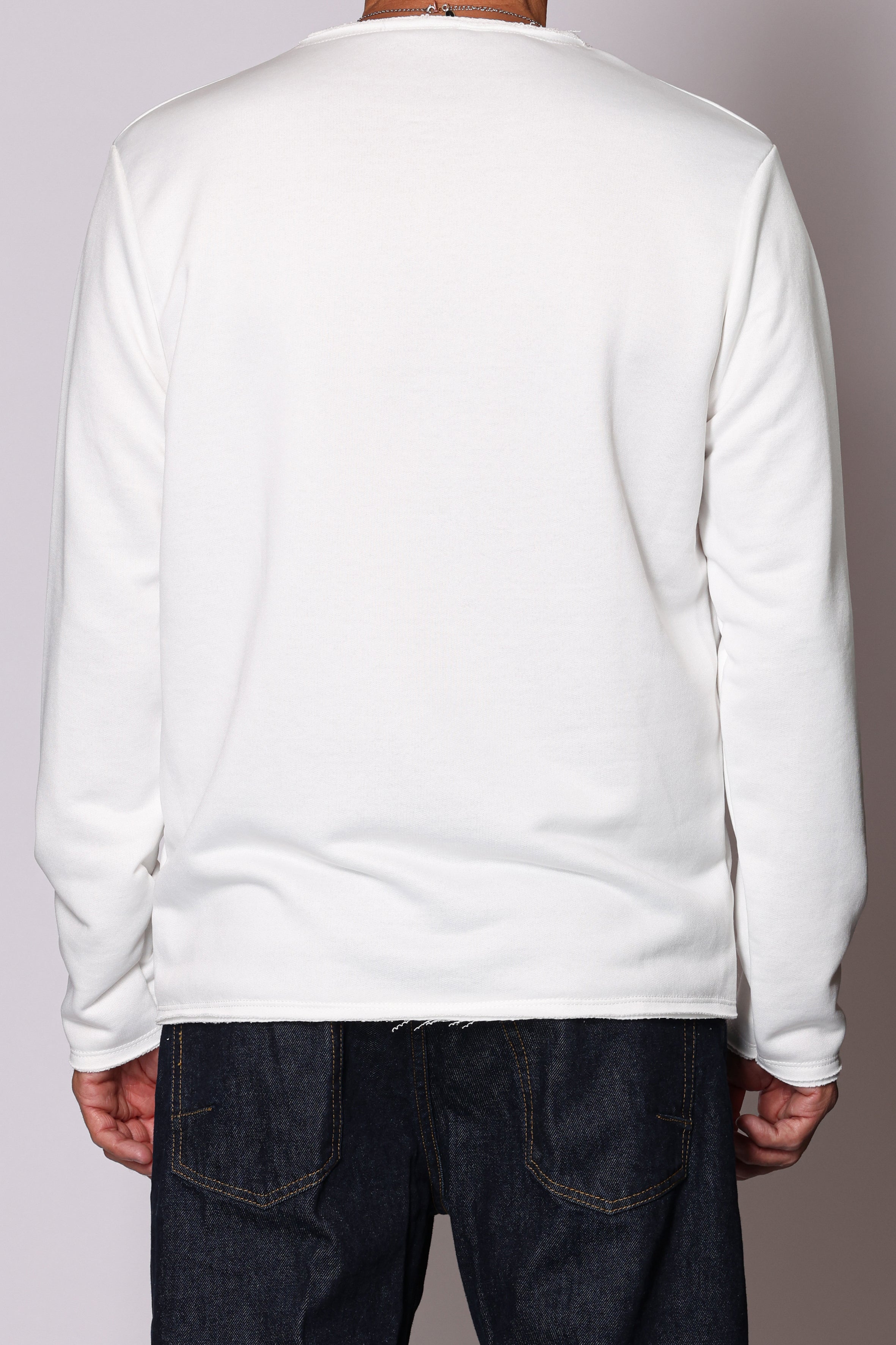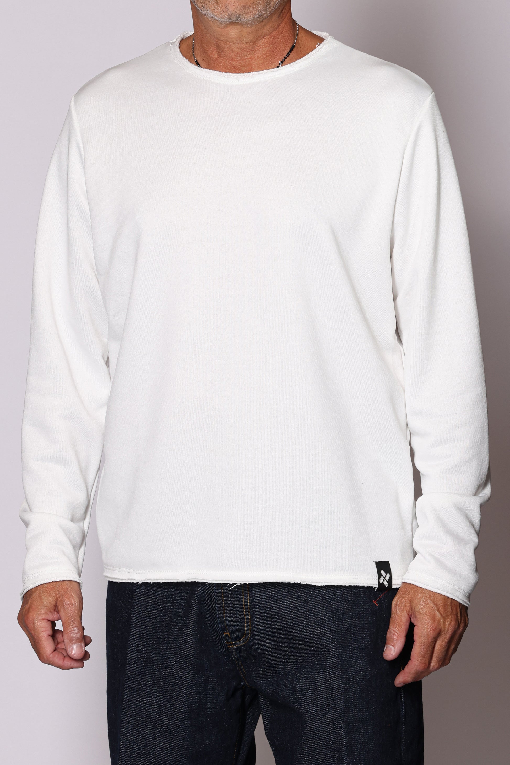 Felpa girocollo con rifiniture taglio vivo. Composizione: 100% cotone. Il modello è alto 180 cm pesa 74 kg indossa taglia L.