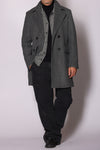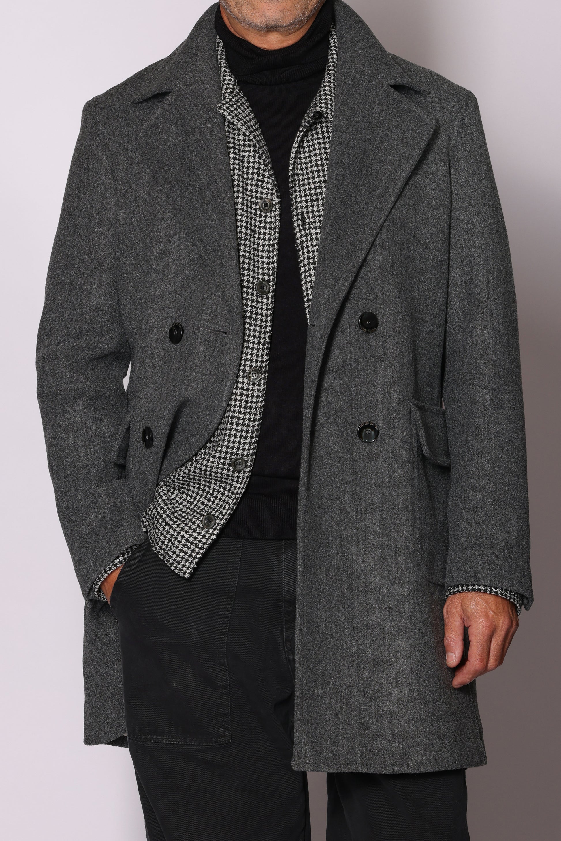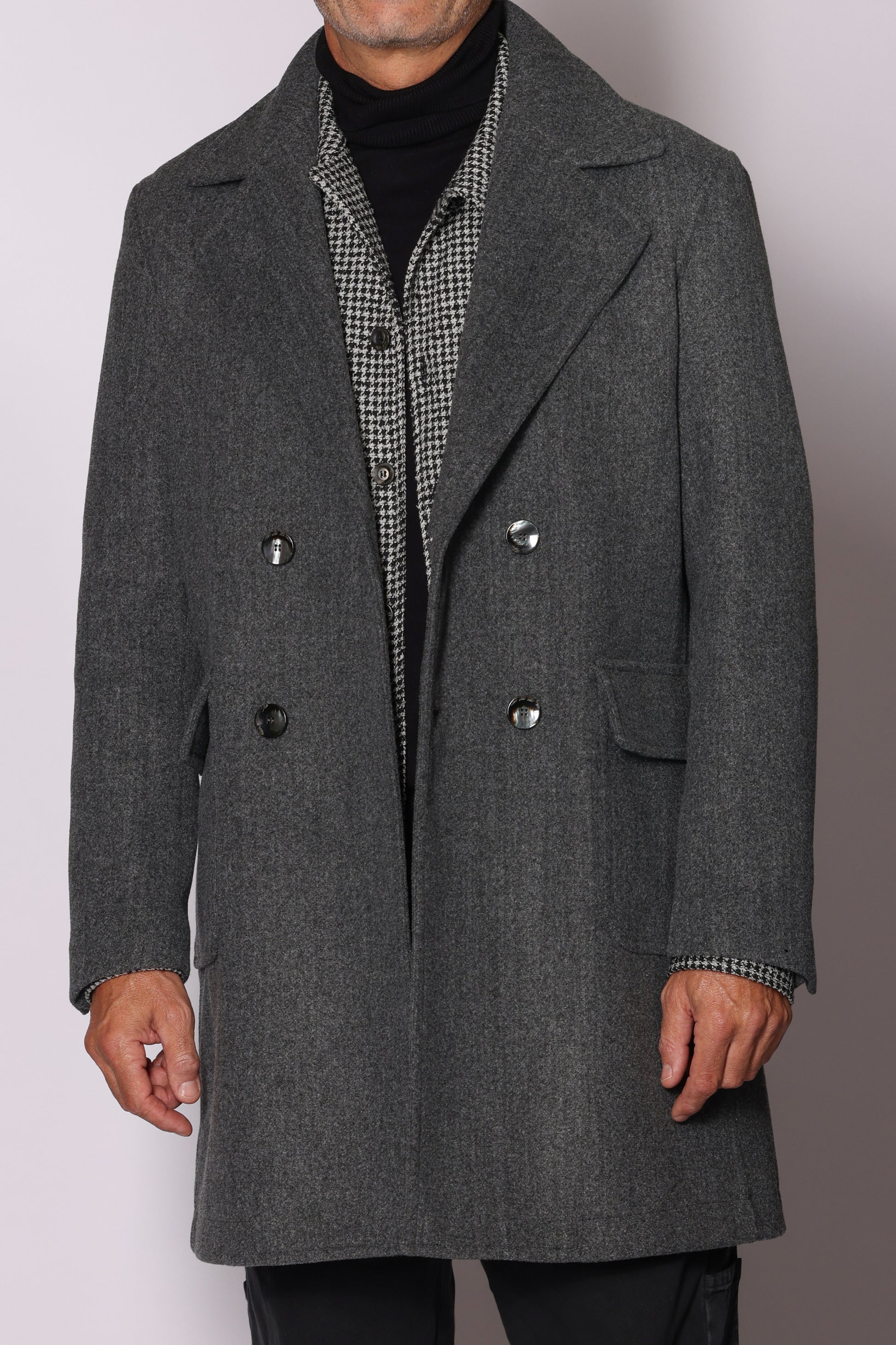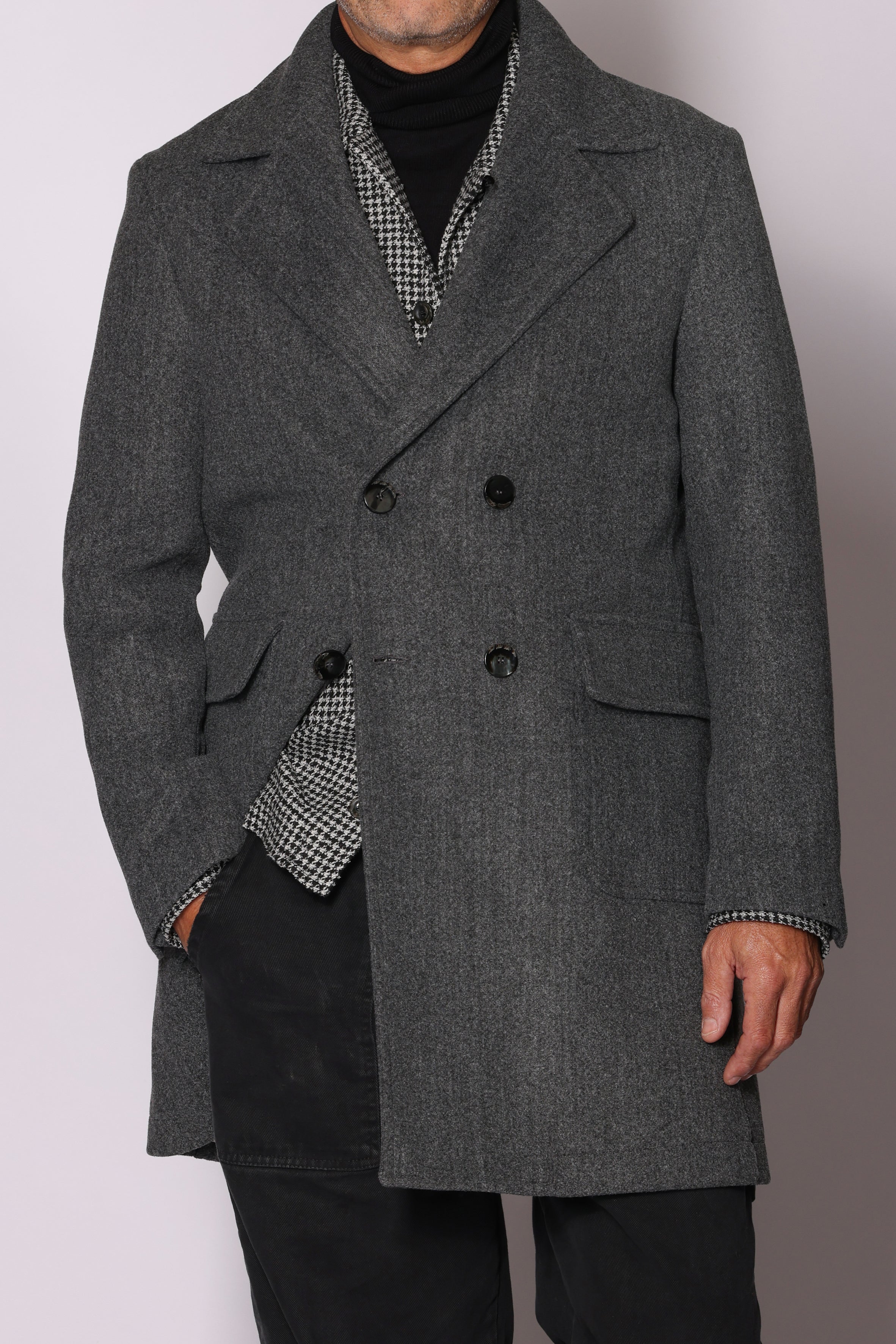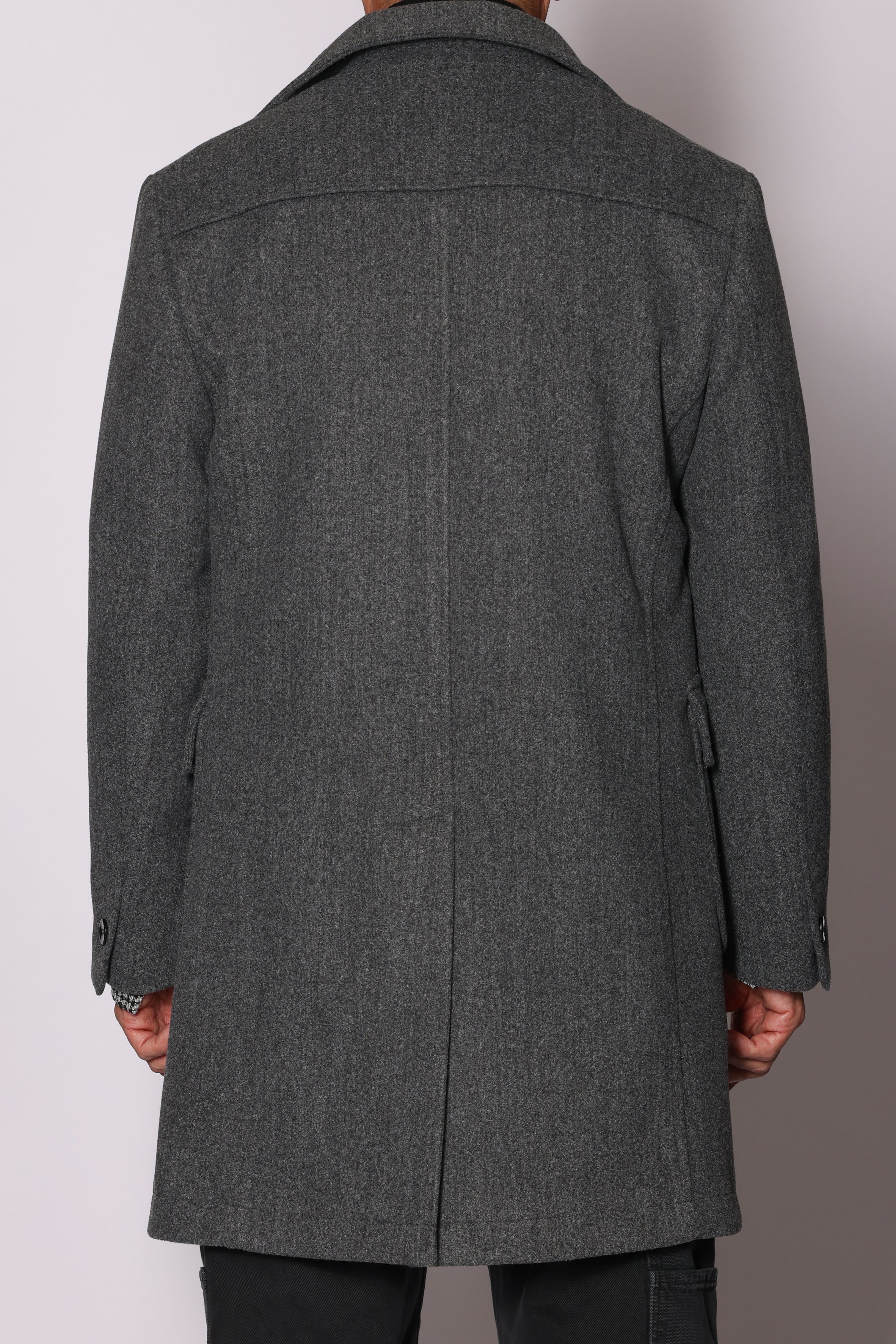 Cappotto doppiopetto, chiusura con bottoni; tasche a toppa con patta sul davanti, spacco centrale sul retro. Composizione: 100% poliestere. Il modello è alto 180 cm pesa 74 kg indossa taglia 48.