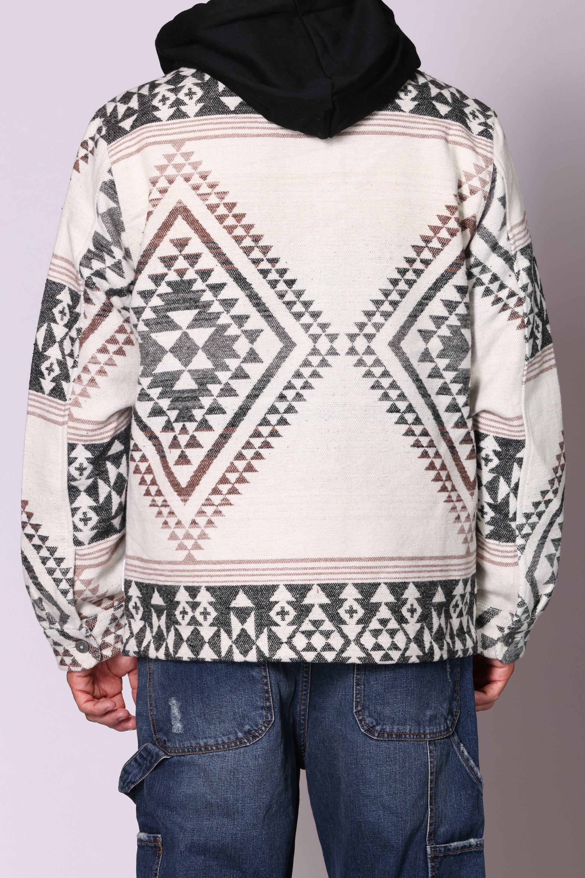 Overshirt azteco, chiusura centrale con bottoni; tasche a filo laterali e a toppa con patta e bottone sul davanti. Cappuccio in felpa removibile. Composizione: 55% cotone, 45% poliestere. Il modello è alto 180 cm pesa 74 kg indossa taglia L.