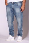 Jeans carrot work, chiusura centrale con bottone e zip, fibbia regolabile sul punto vita. Composizione: 100% cotone. Il modello è alto 180 cm pesa 74 kg indossa taglia 48.
