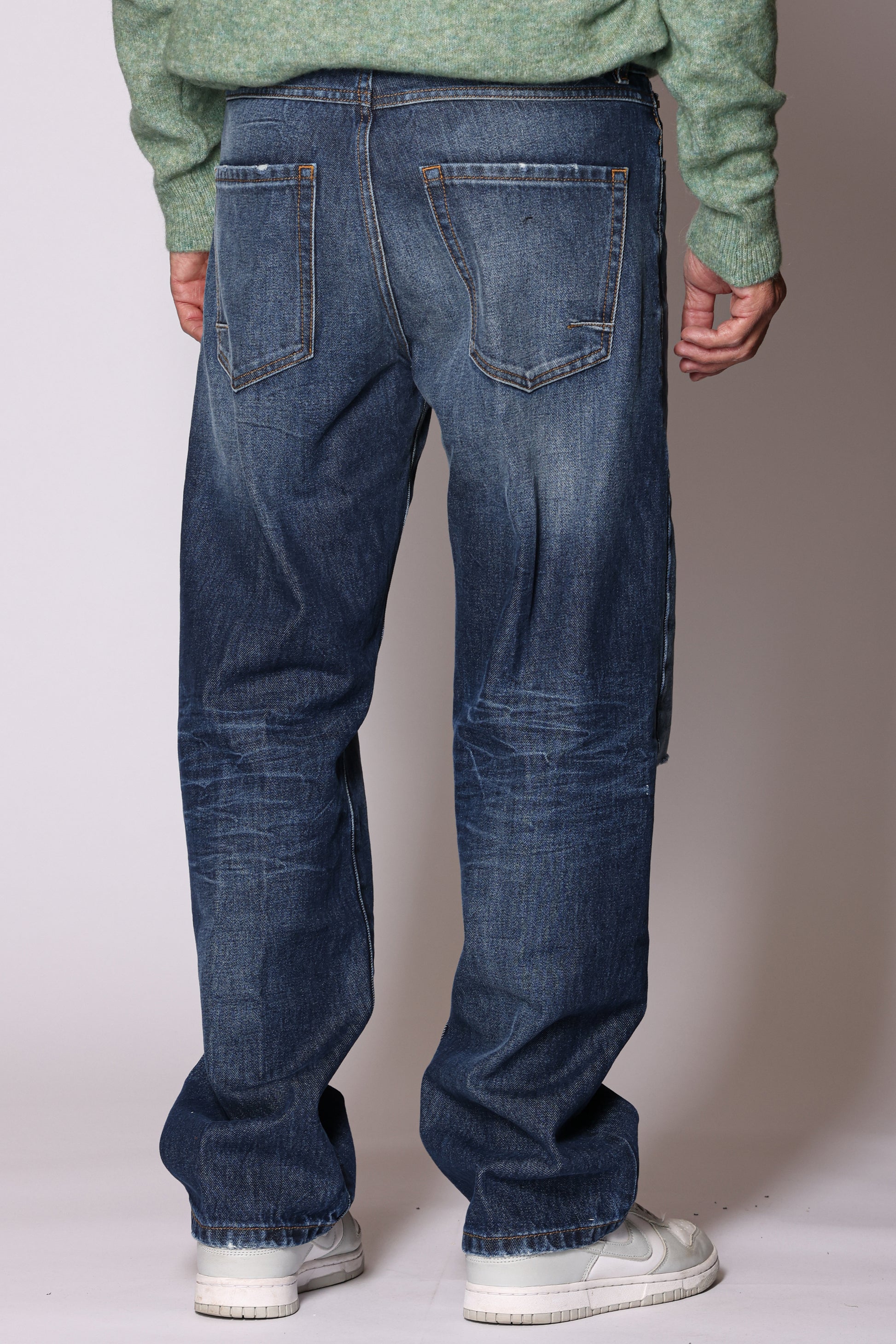 Jeans chiusura con bottoni, piccole rotture sul davanti. Fondo ampio. Composizione: 100% cotone. Il modello è alto 180 cm pesa 74 kg indossa taglia 48.