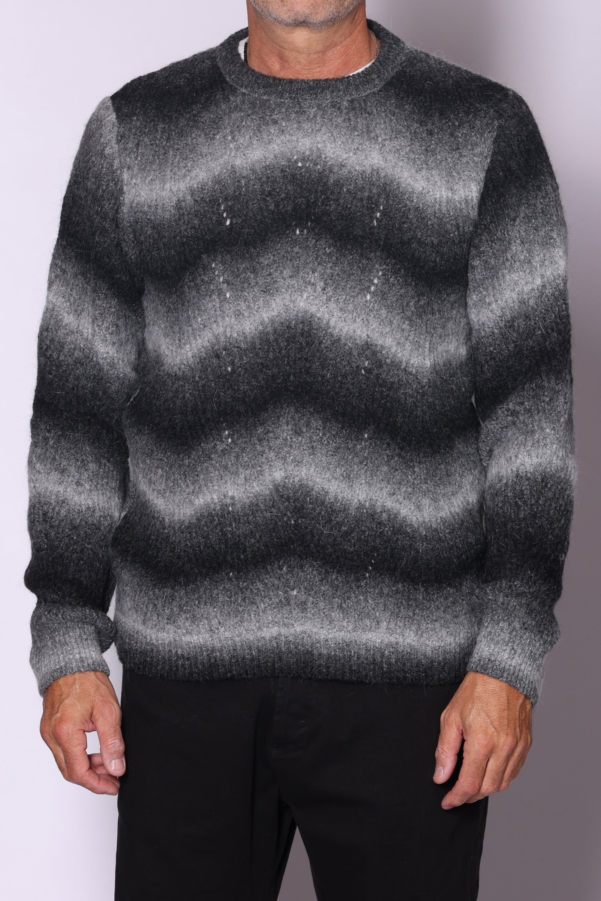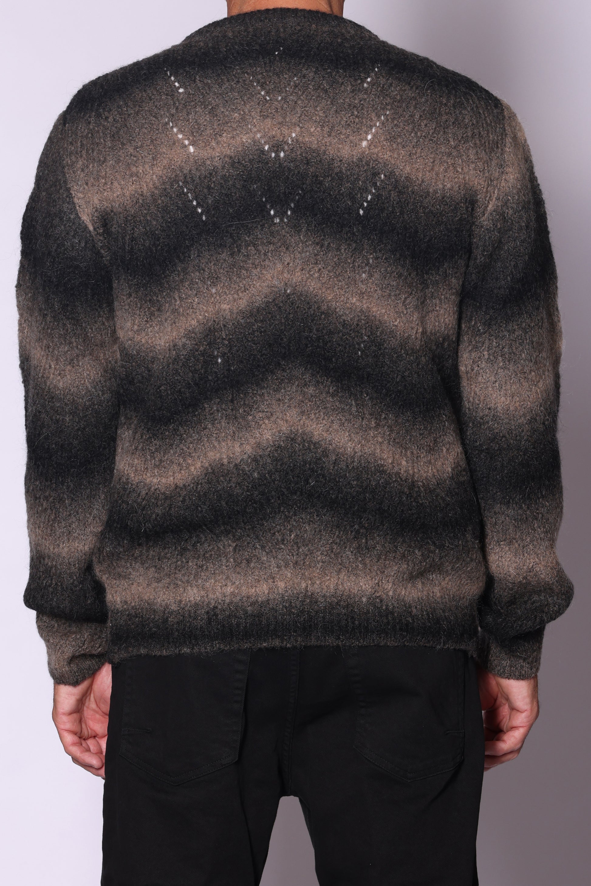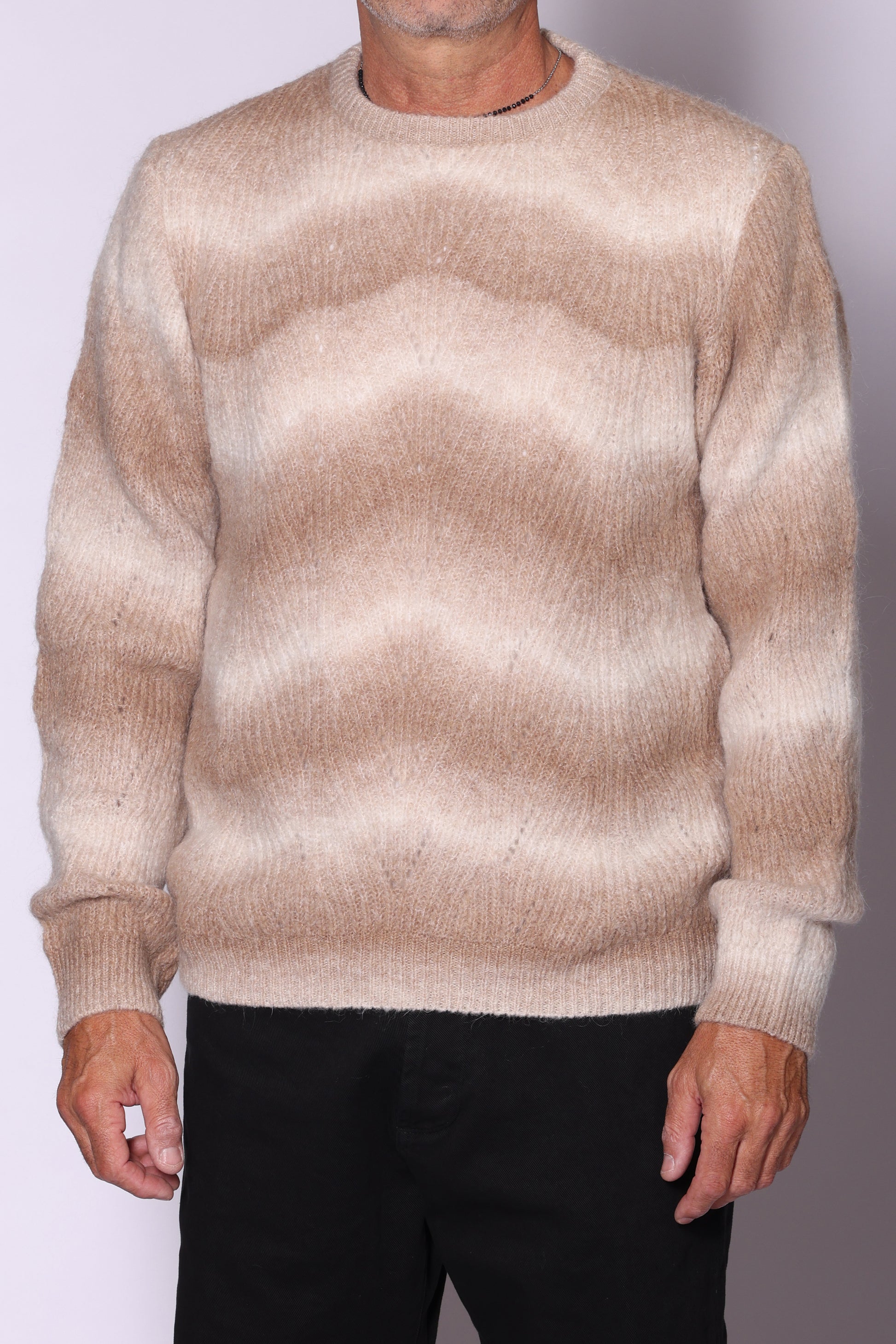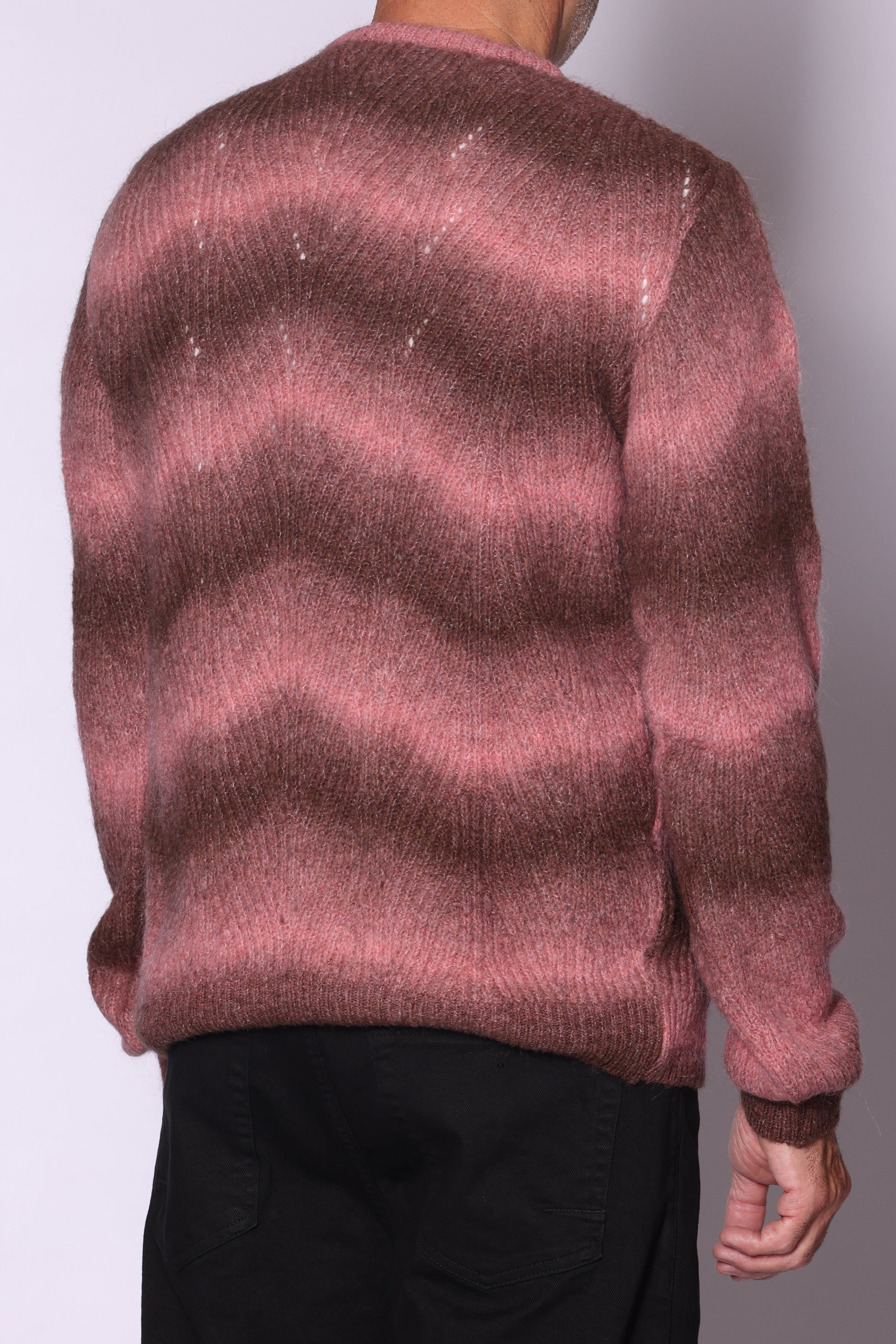 Maglia girocollo sfumata in mohair. Composizione: 40% acrilico, 17% poliamide, 16% mohair, 16% lana, 2% elastam. Il modello è alto 180 cm pesa 74 kg indossa taglia L.