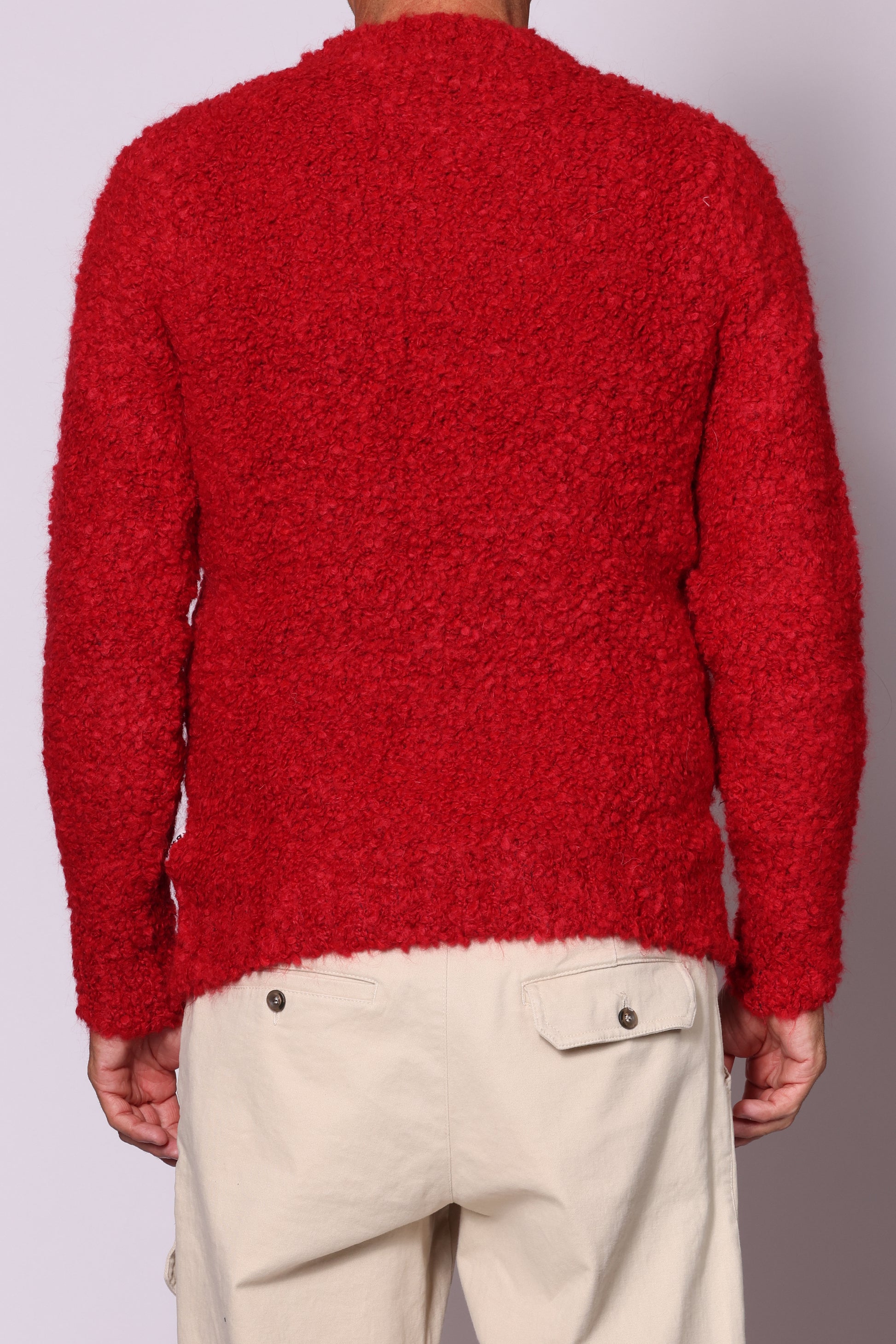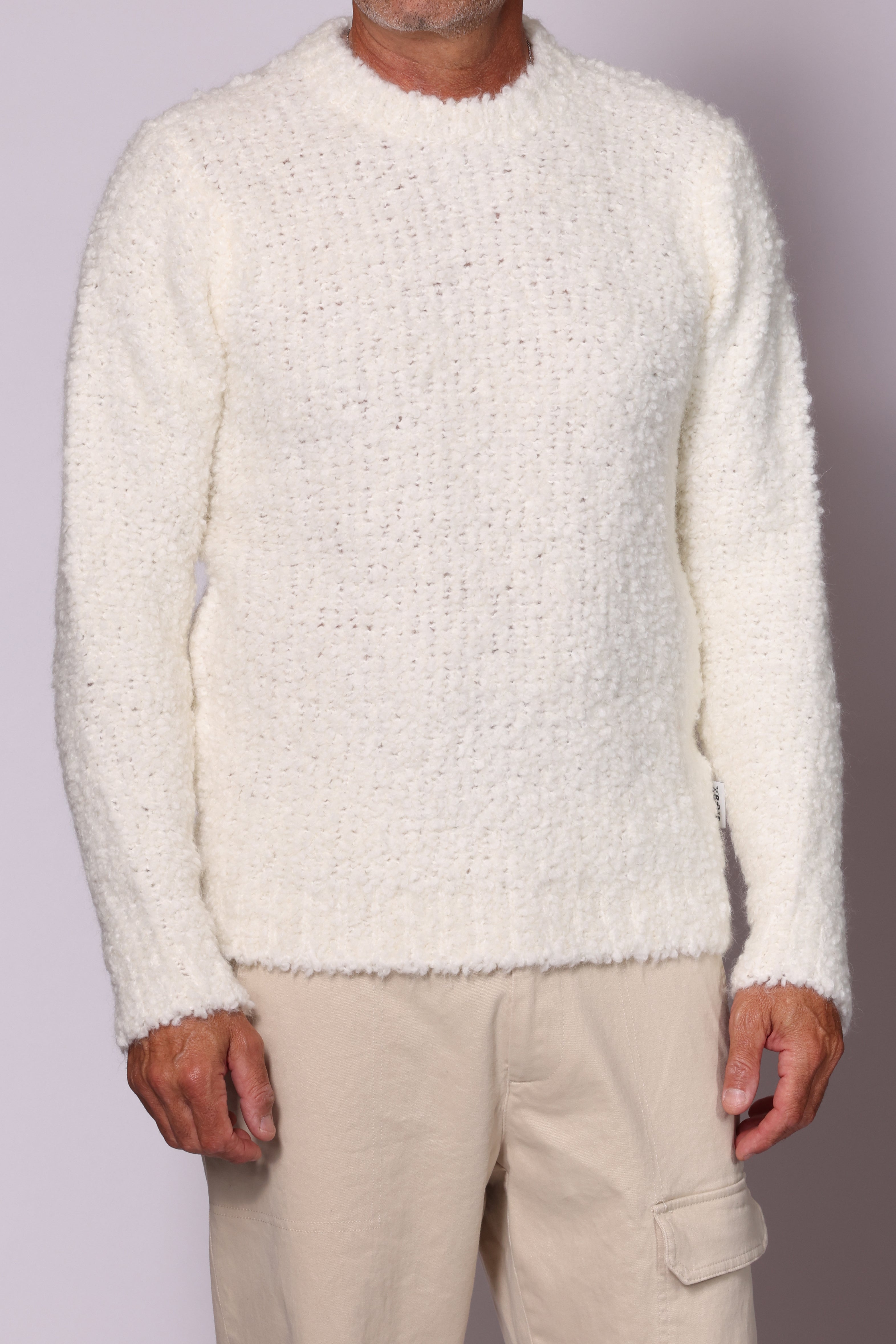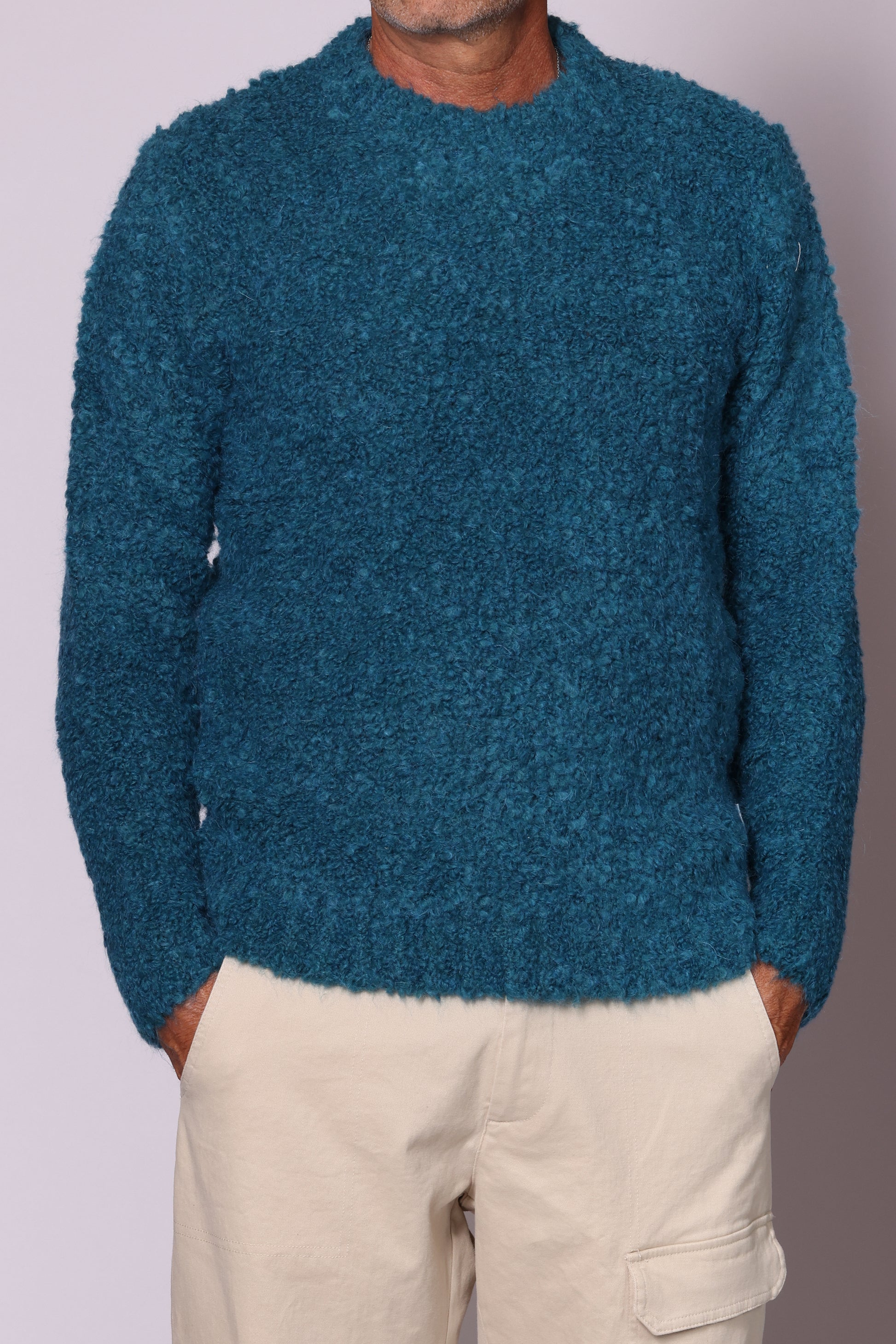 Maglia girocollo in misto lana effetto bouclé. Composizione: 50% lana, 25% mohair, 20% acrilico, 5% poliestere. Il modello è alto 180 cm pesa 74 kg indossa taglia M.