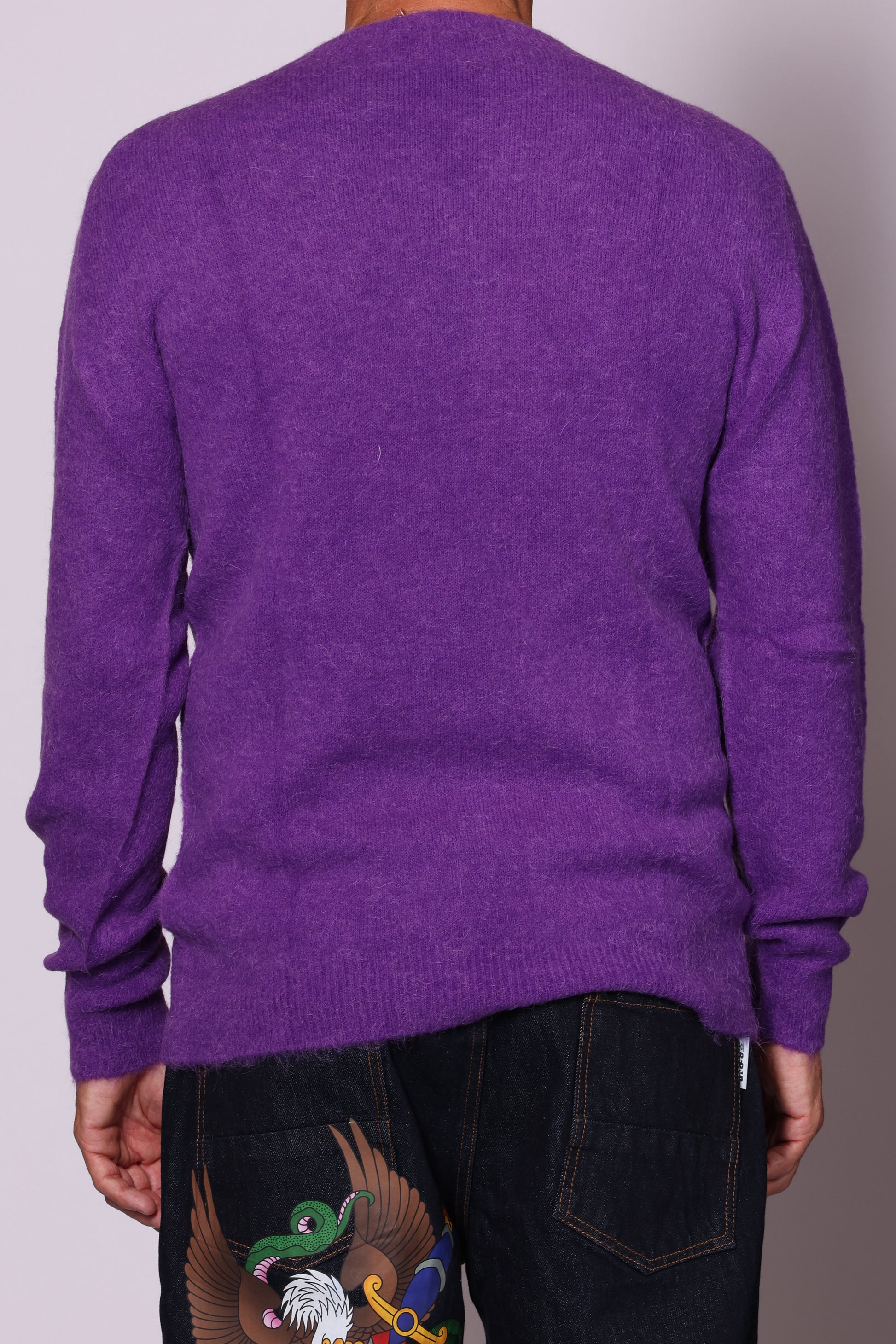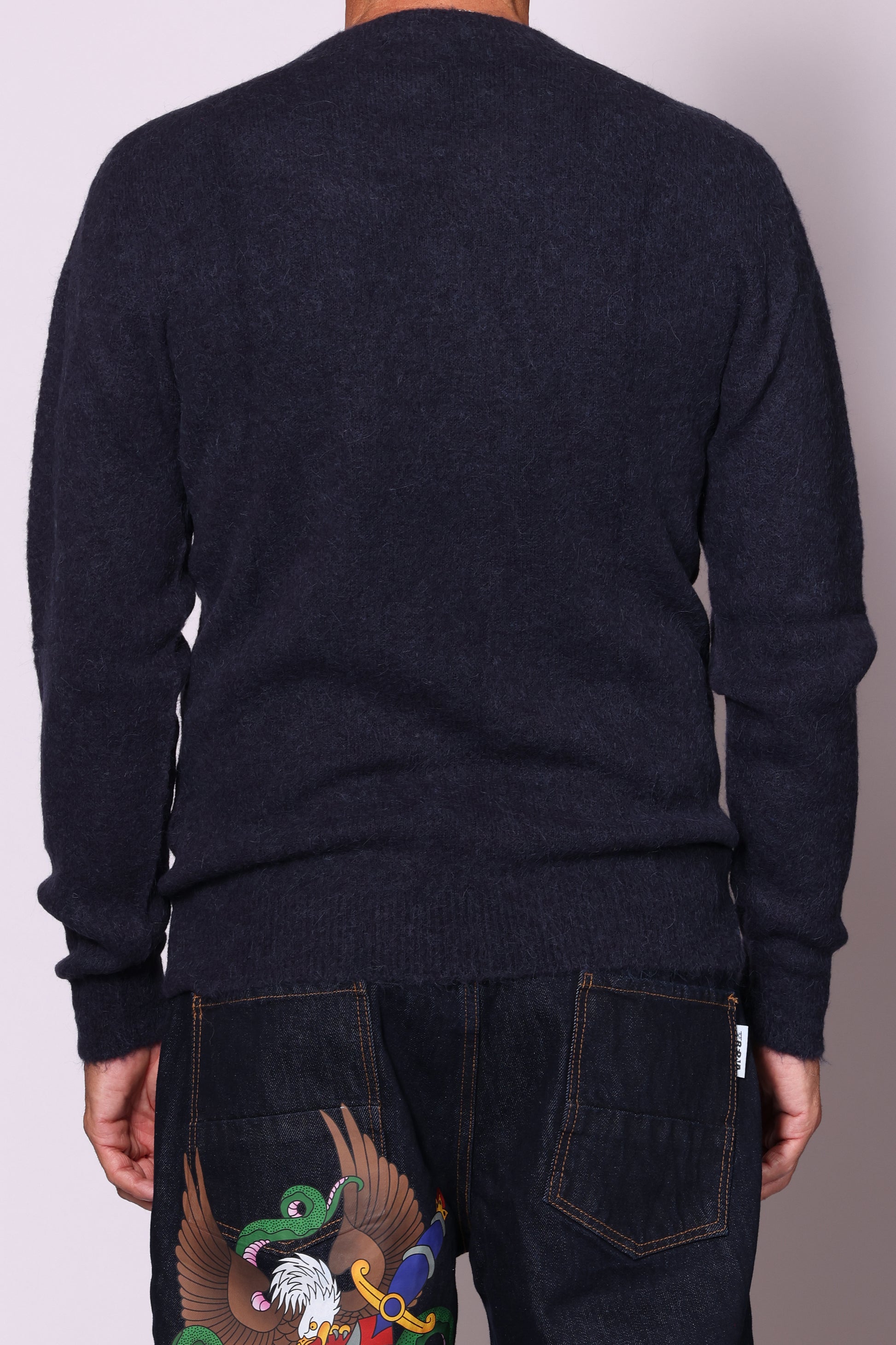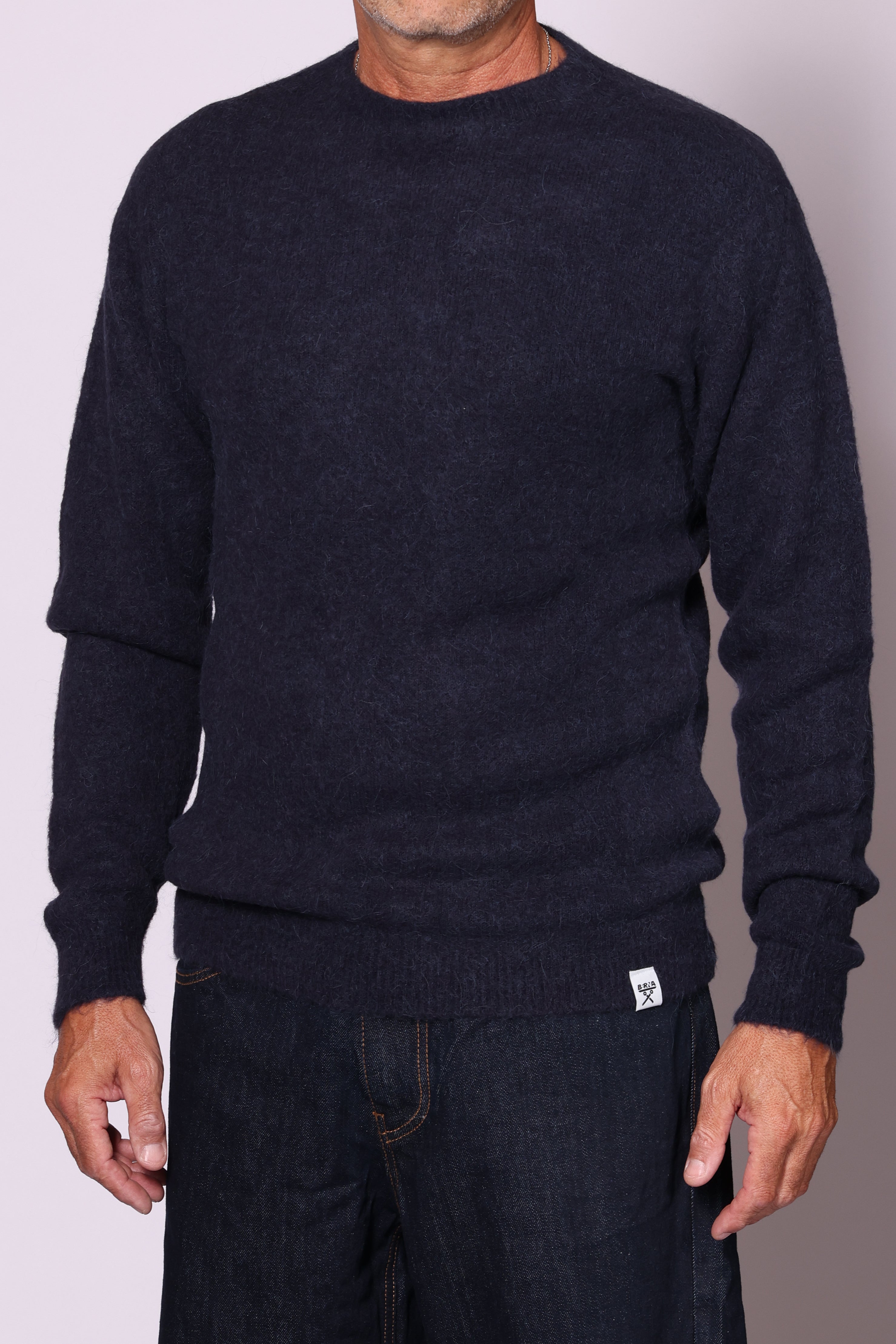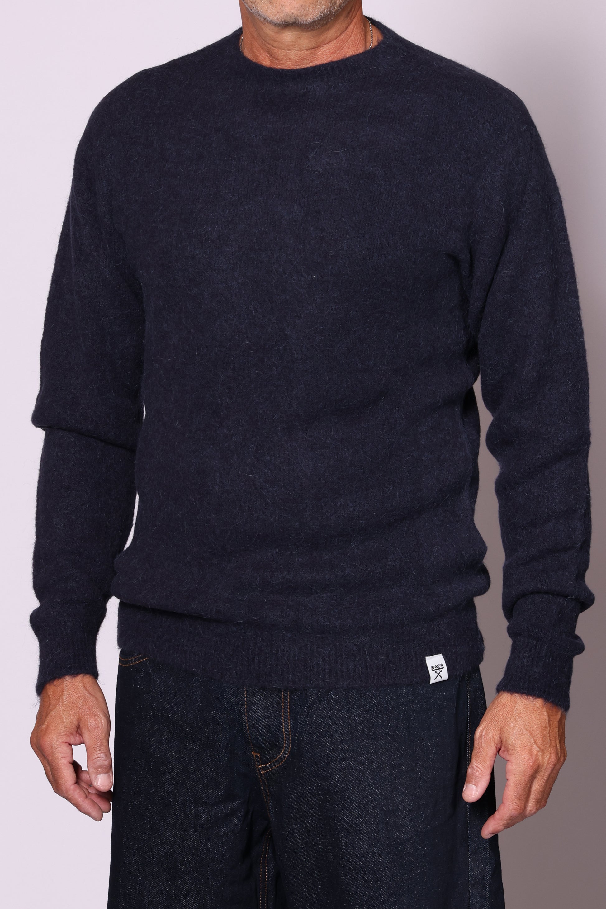 Maglia girocollo in misto lana. Composizione: 30% alpaca, 30% lana, 20% poliamide, 16% acrilico, 4% elastam. Il modello è alto 180 cm pesa 74 kg indossa taglia L.