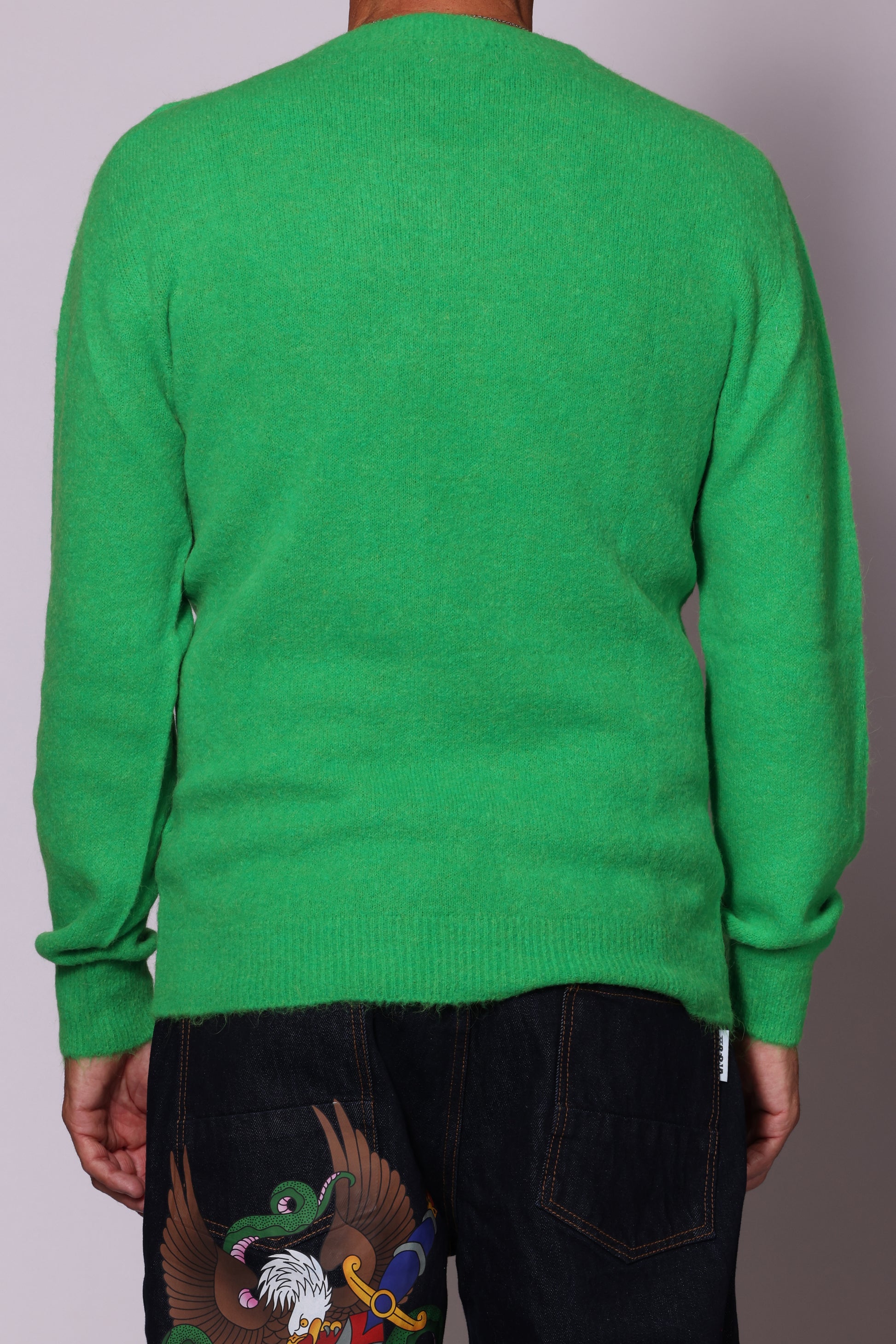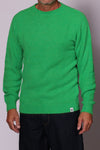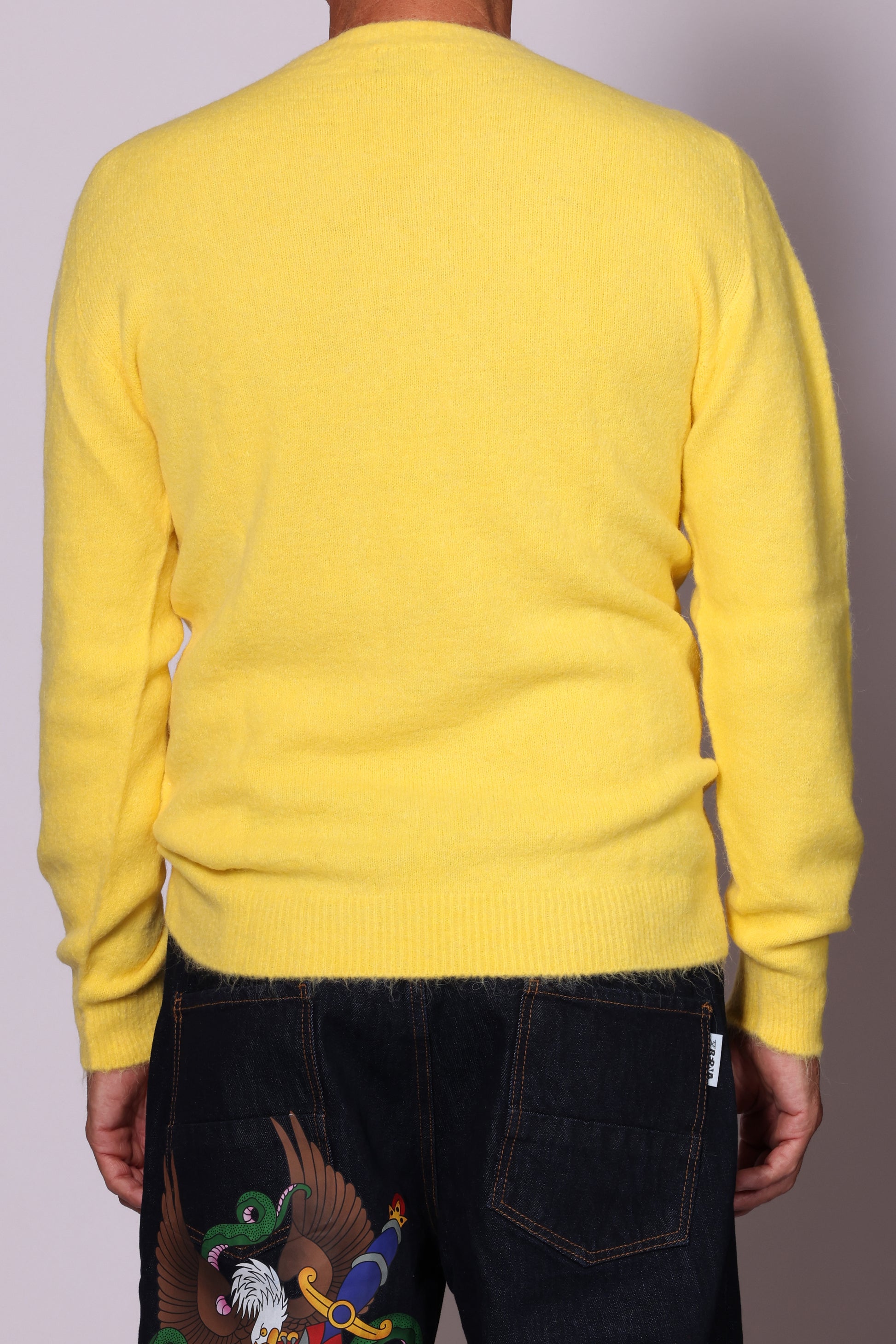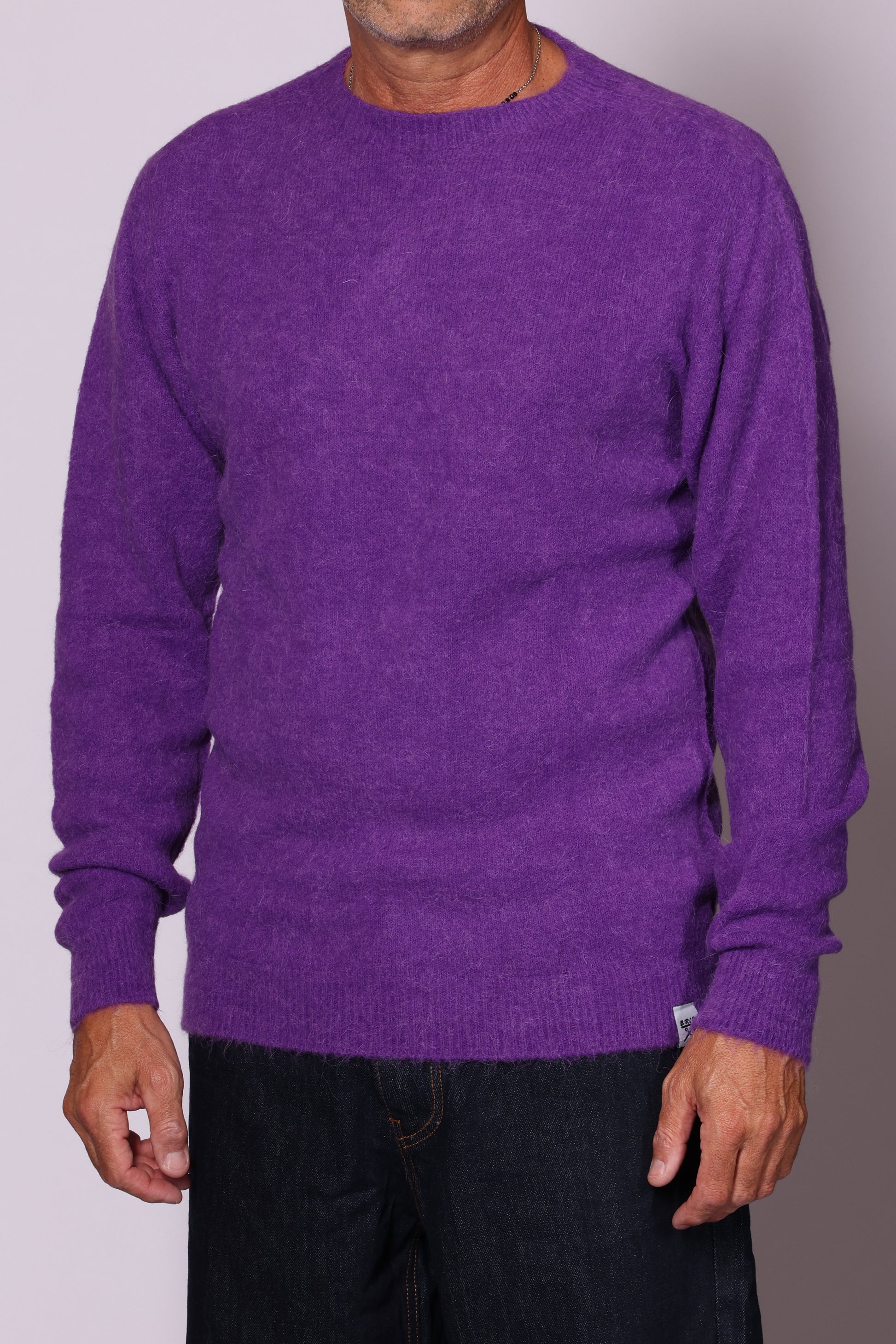 Maglia girocollo in misto lana. Composizione: 30% alpaca, 30% lana, 20% poliamide, 16% acrilico, 4% elastam. Il modello è alto 180 cm pesa 74 kg indossa taglia L.