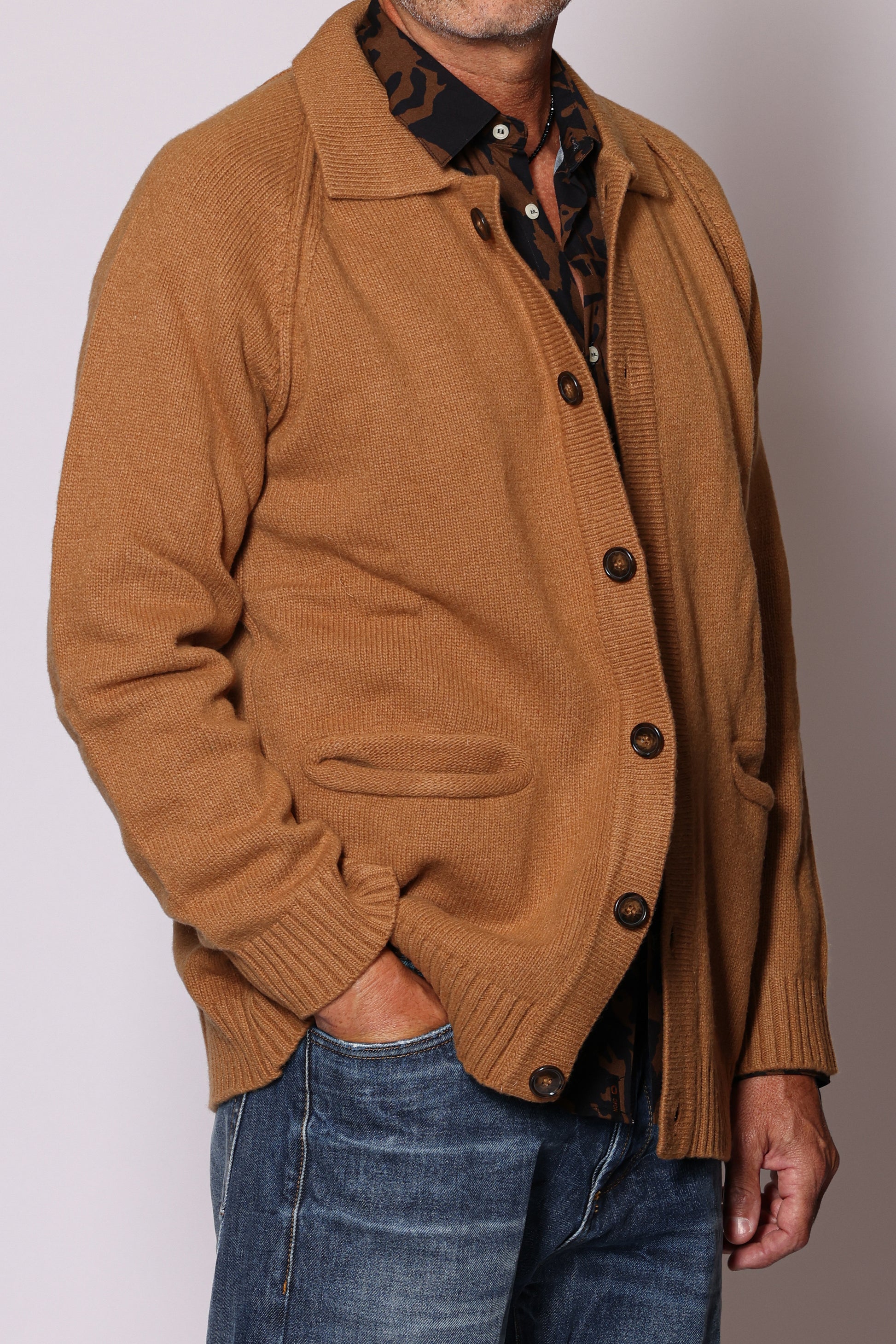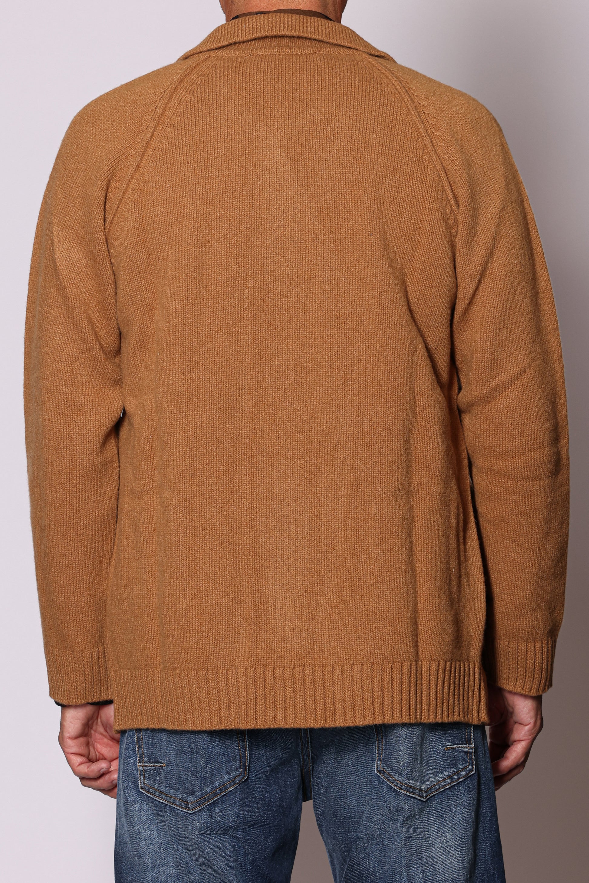 Shirt Jacket in maglia, chiusura centrale con bottoni; maniche raglan e tasche a filo sul davanti. Composizione: 80% lana, 20% poliammide. Il modello è alto 180 cm pesa 74 kg indossa taglia L.
