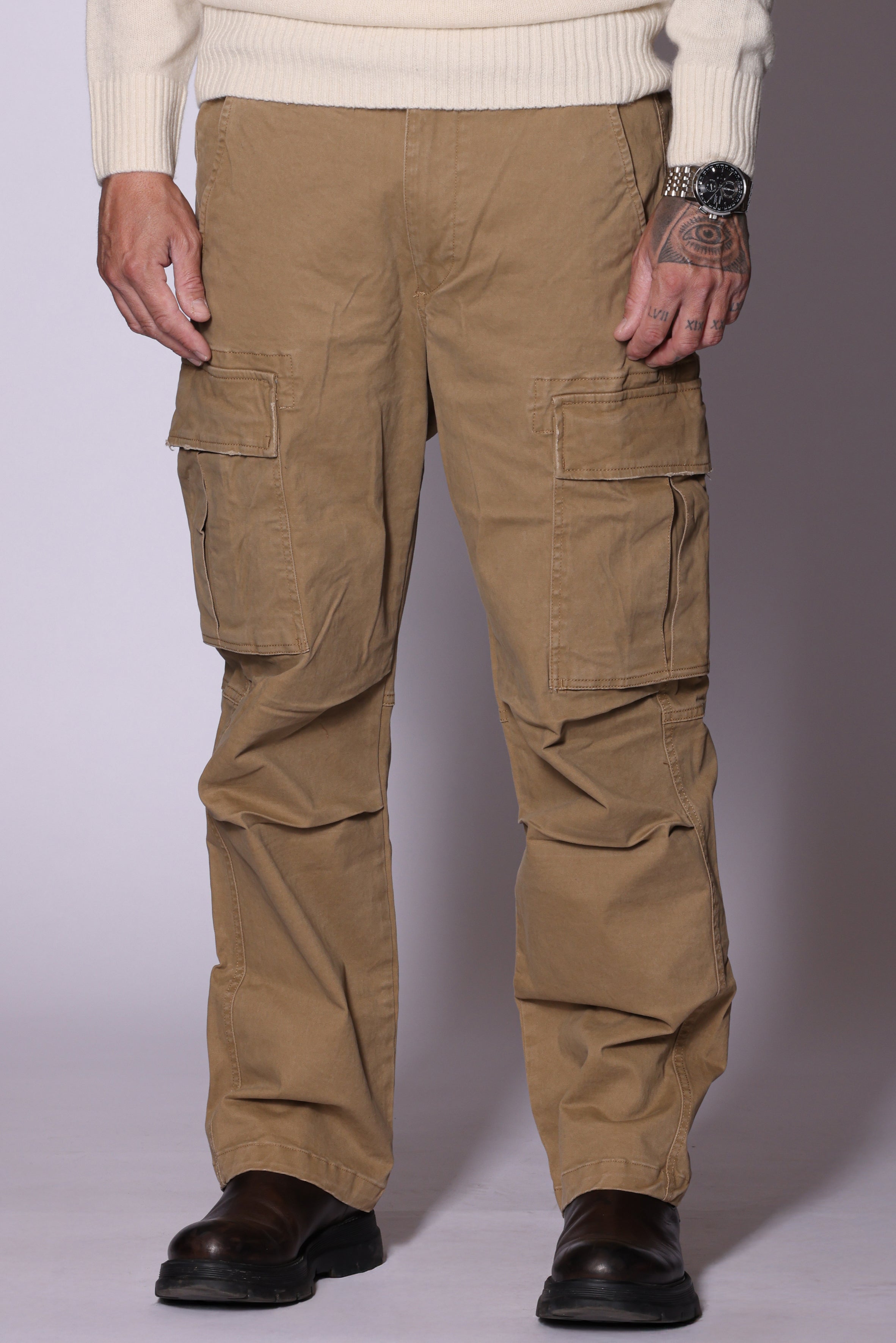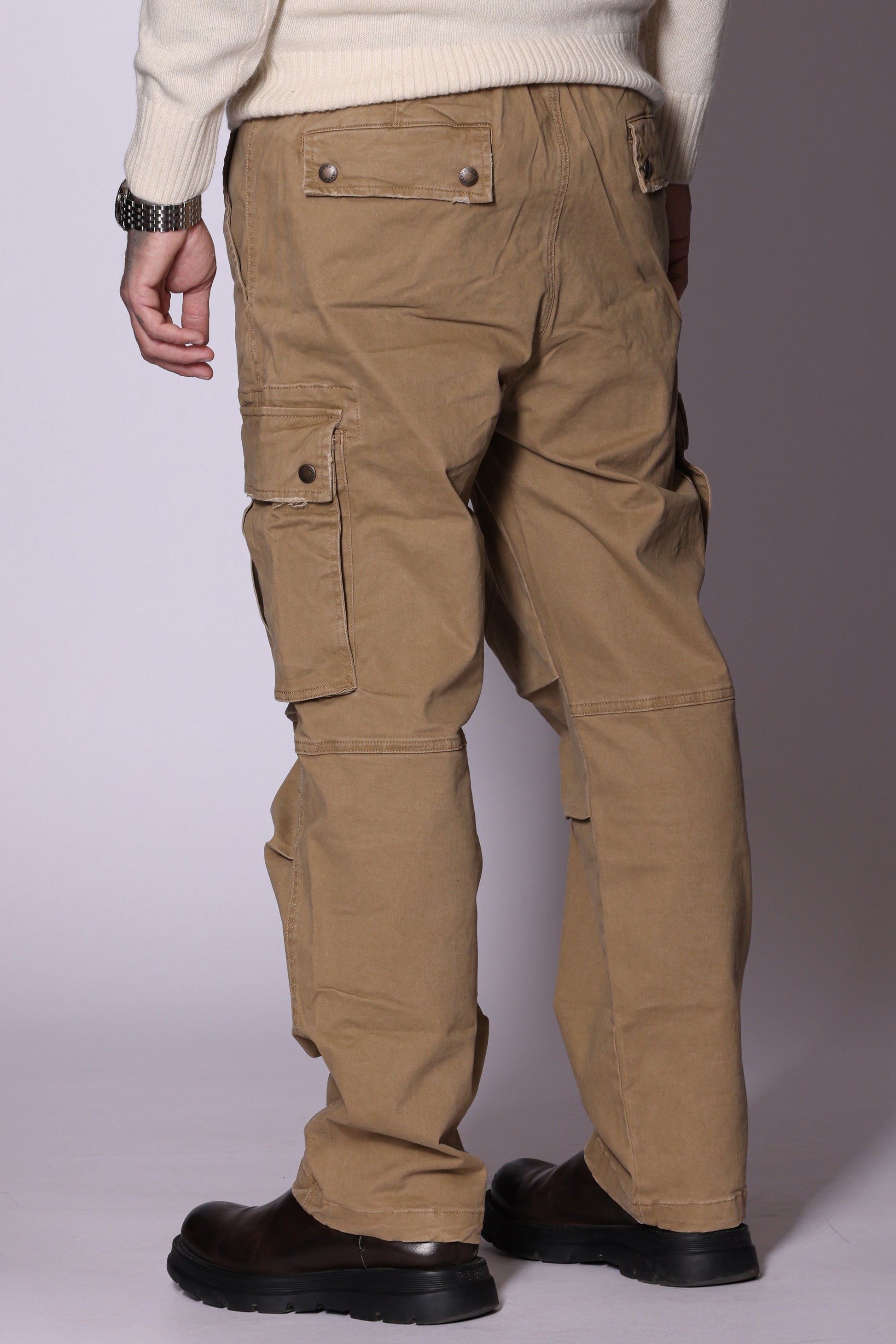 Pantalone cargo, chiusura centrale con bottone e zip, coulisse sul retro e  cinturini laterali regolabili. Tasche a filo laterali e posteriori con patta e bottoni a pressione; due tasconi a toppa con patta e bottone sul fronte. Spille decorative removibili. Composizione: 97% cotone, 3% elastam. Il modello è alto 180 cm pesa 74 kg indossa taglia 48.