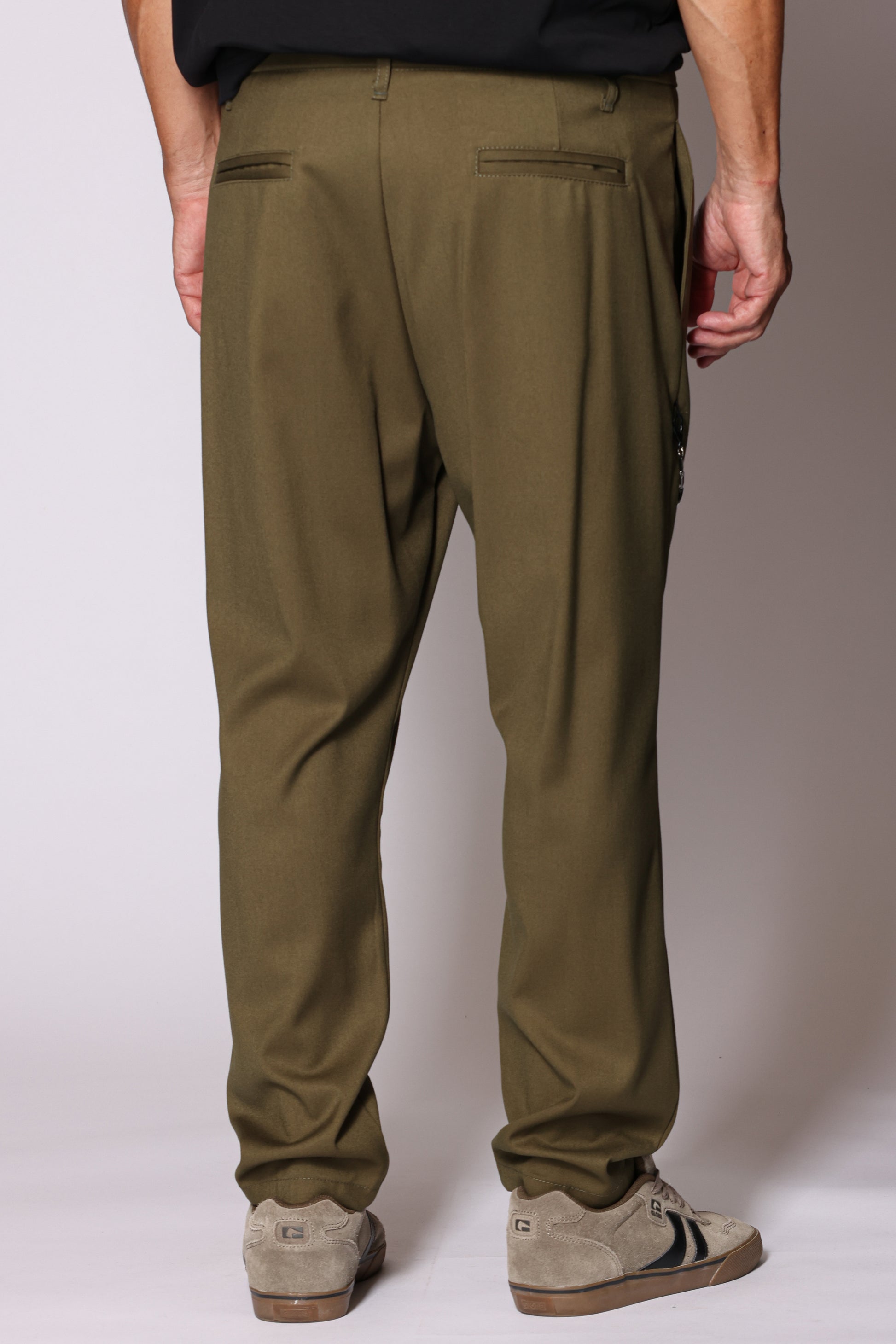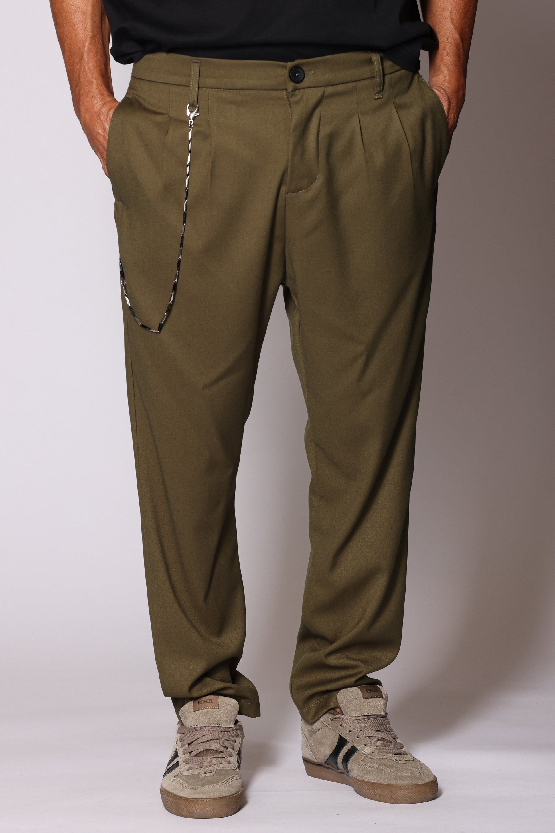 Pantalone modello carrot chiusura con zip e bottone. Doppia pence sul davanti, tasche a filo posteriori e sulle cuciture laterali . Catena decorativa removibile . Composizione: 63% poliestere, 34% viscosa, 3% elastam. Il modello è alto 180 cm pesa 74 kg indossa taglia 48.