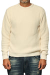 Maglia girocollo lavorata. Composizione: 70% acrilico, 30% lana. Il modello è alto 180 cm, pesa 74 kg indossa taglia L.