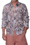 Camicia in lino fantasia con colletto, chiusura centrale con bottoni, fondo leggermente stondato. Composizione: 100% lino. Il modello è alto 180 cm pesa 74 kg indossa taglia L.