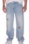 Jeans wide straight, fondo largo. Chiusura con zip e bottone, rotture sul davanti. Composizione: 100% cotone. Il modello è alto 180 cm pesa 74 kg indossa taglia 46.