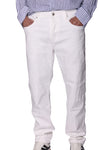 Pantalone bull denim con rammendi, chiusura centrale con bottoni. Composizione: 98% cotone, 2% elastam. Il modello è alto 180 cm pesa 74 kg indossa taglia 48