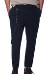Pantalone modello carrot chiusura con zip e bottone. Doppia pences sul davanti, tasche a filo posteriori e sulle cuciture laterali . Catena decorativa removibile. Composizione: 78% poliestere, 18% viscosa, 4% elastam. Il modello è alto 180 cm pesa 74 kg indossa taglia 46.