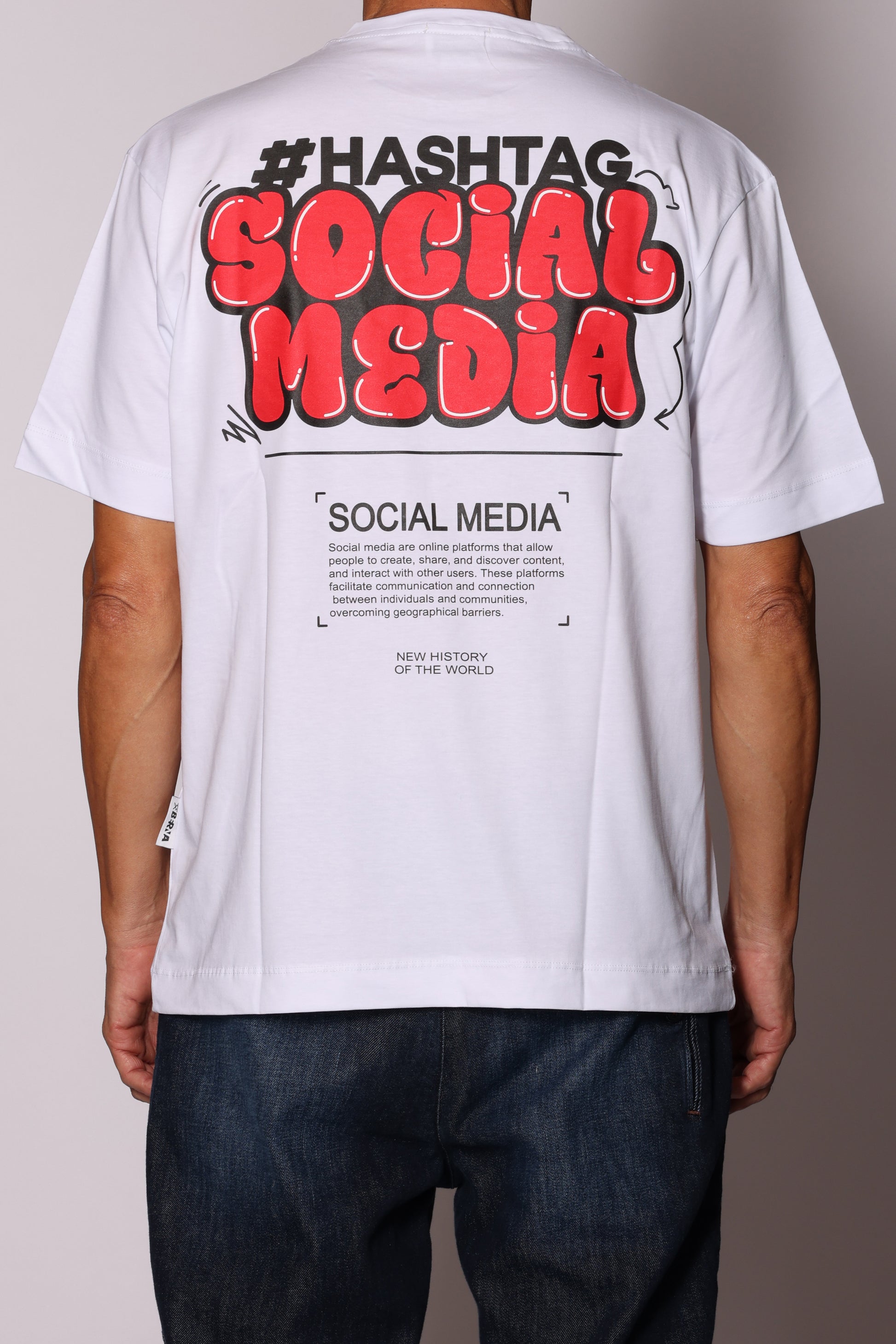 T-shirt girocollo con stampa fronte e retro. Composizione: 100% cotone. Il modello è alto 180 cm pesa 74 kg indossa taglia L.