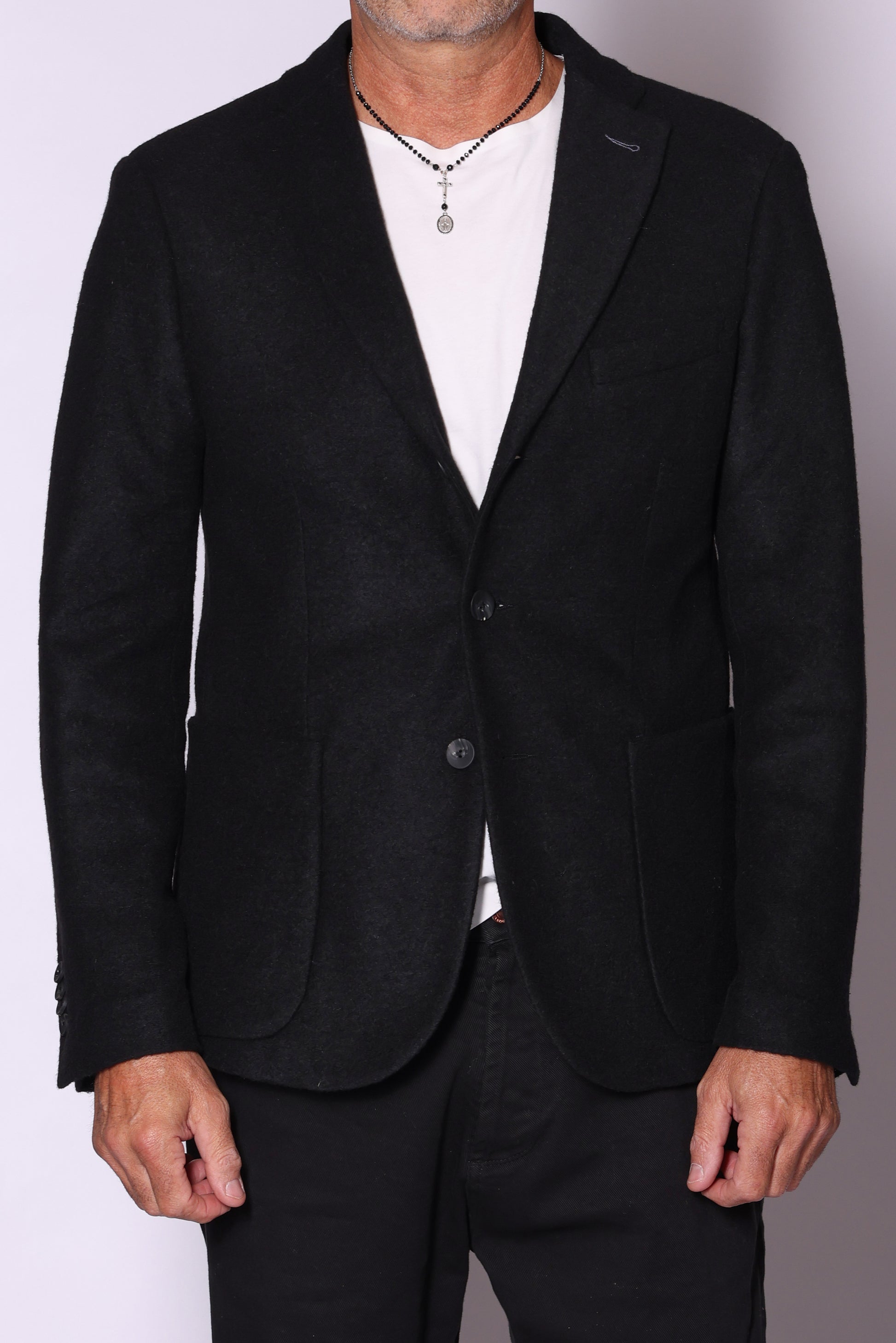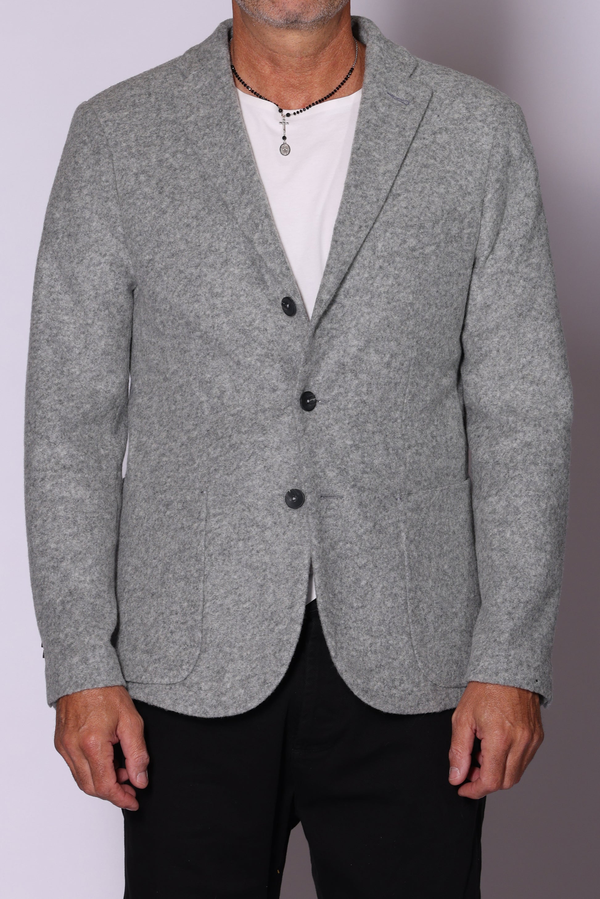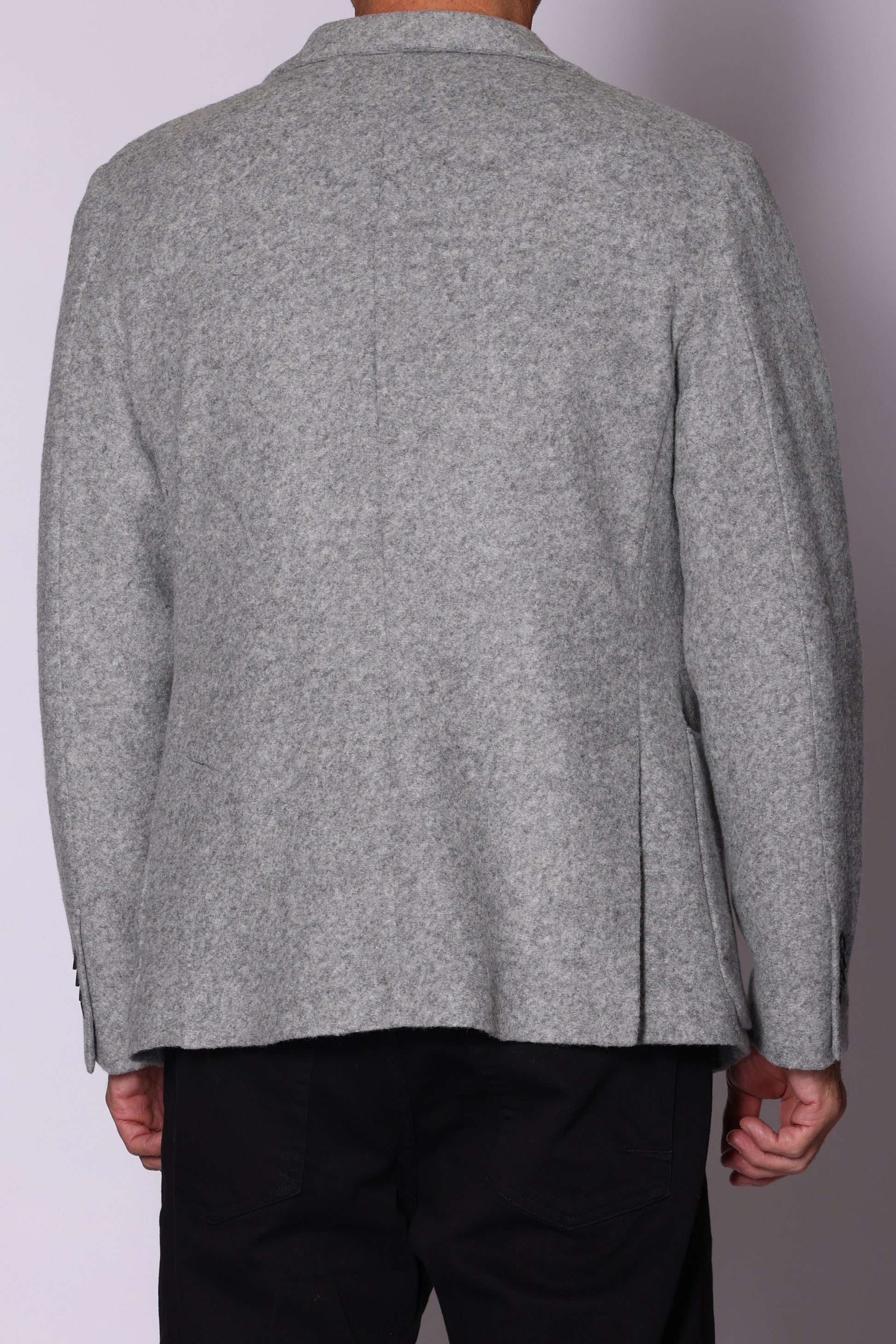 Giacca monopetto, tasche a toppa sul davanti, spacchetti laterali sul retro. Composizione: 50% poliestere, 32% lana, 18% acrilico. Il modello è alto 180 cm pesa 74 kg indossa taglia 48.