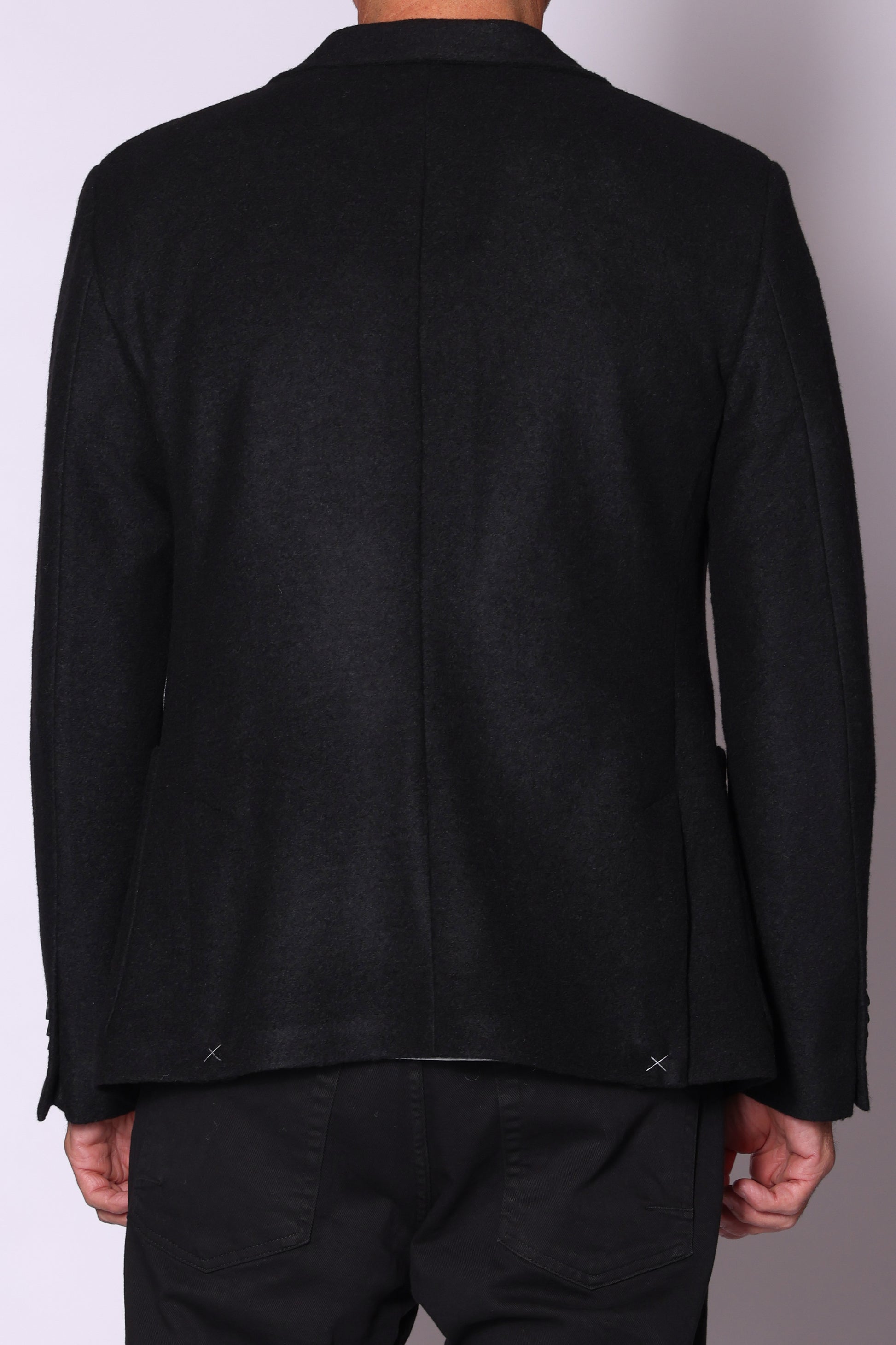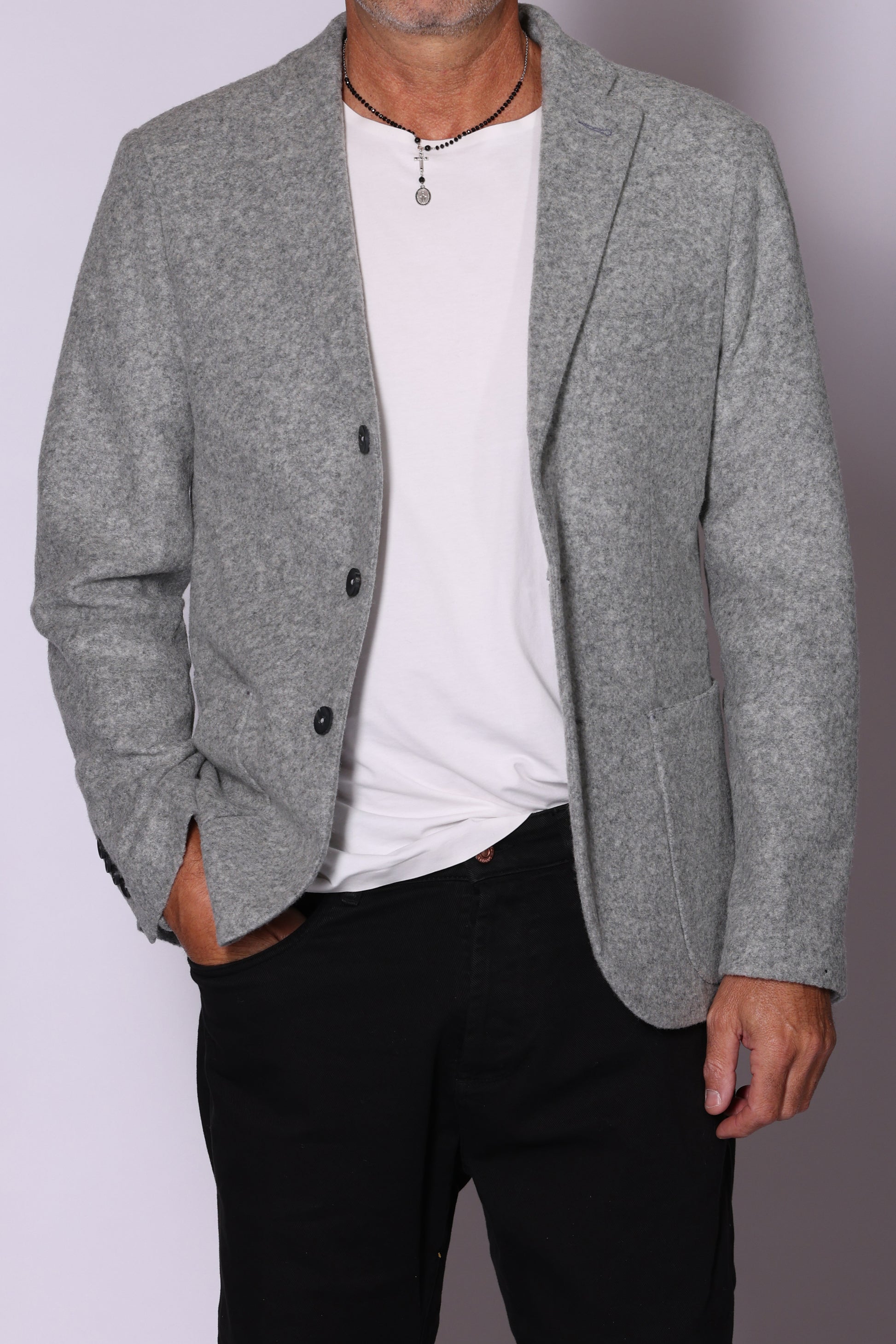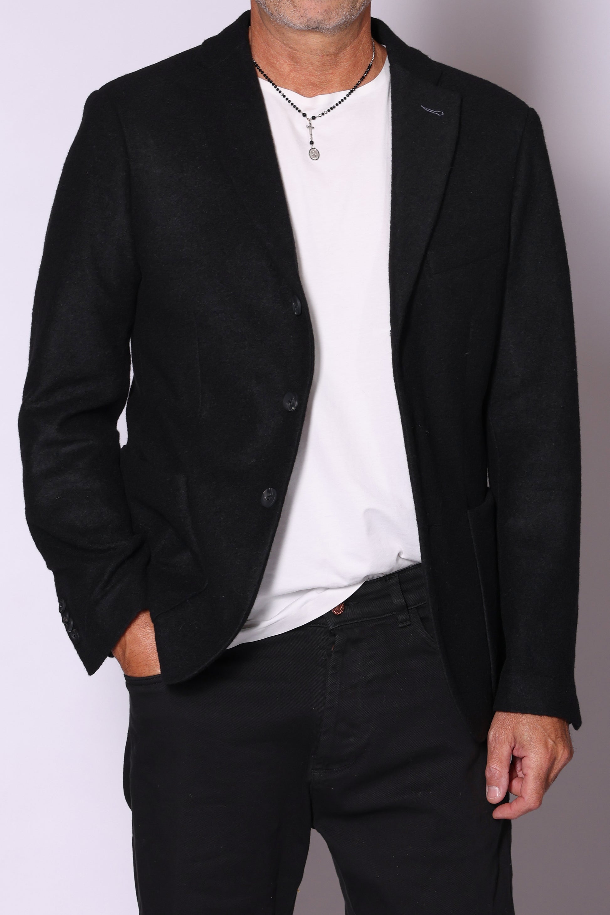 Giacca monopetto, tasche a toppa sul davanti, spacchetti laterali sul retro. Composizione: 50% poliestere, 32% lana, 18% acrilico. Il modello è alto 180 cm pesa 74 kg indossa taglia 48.