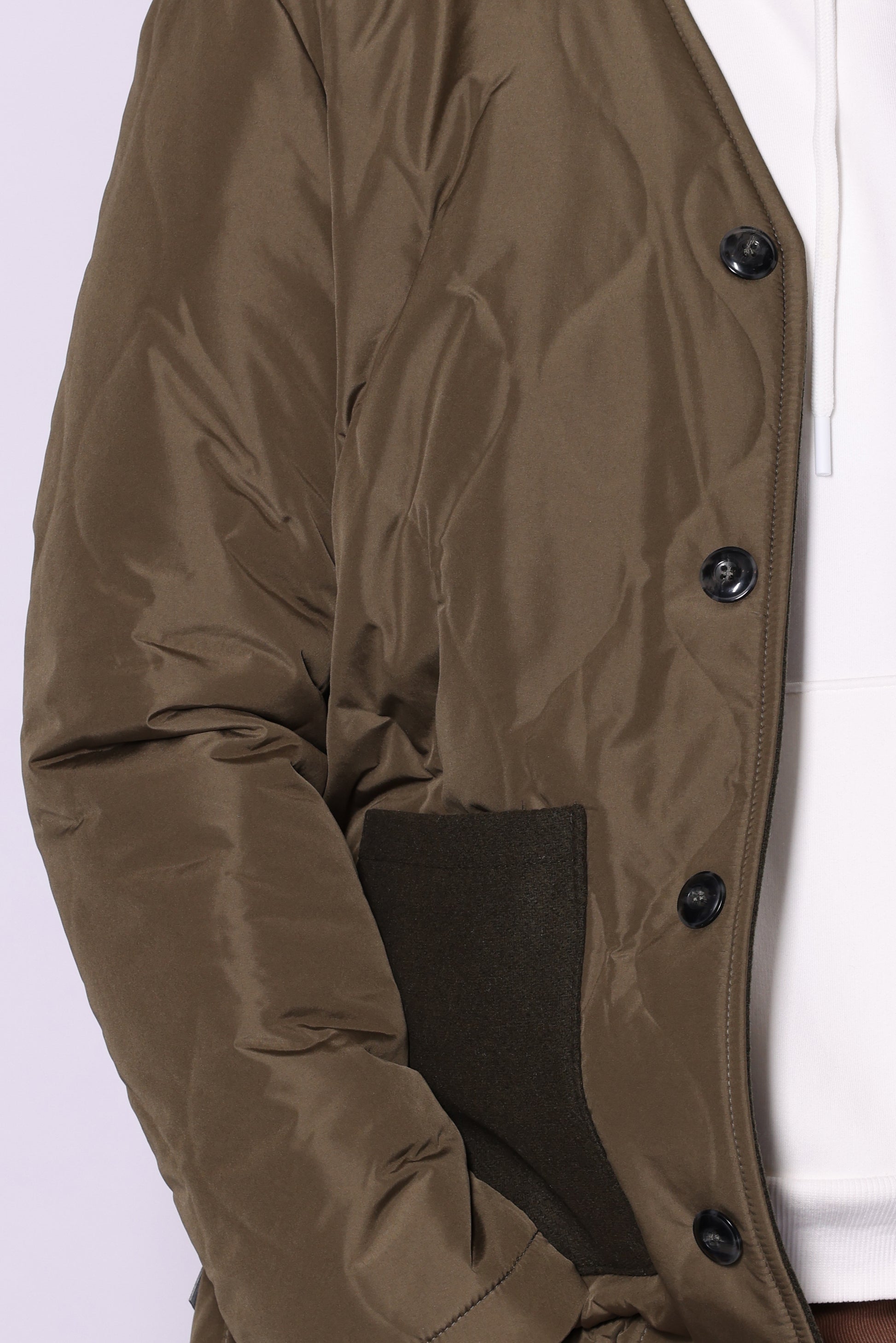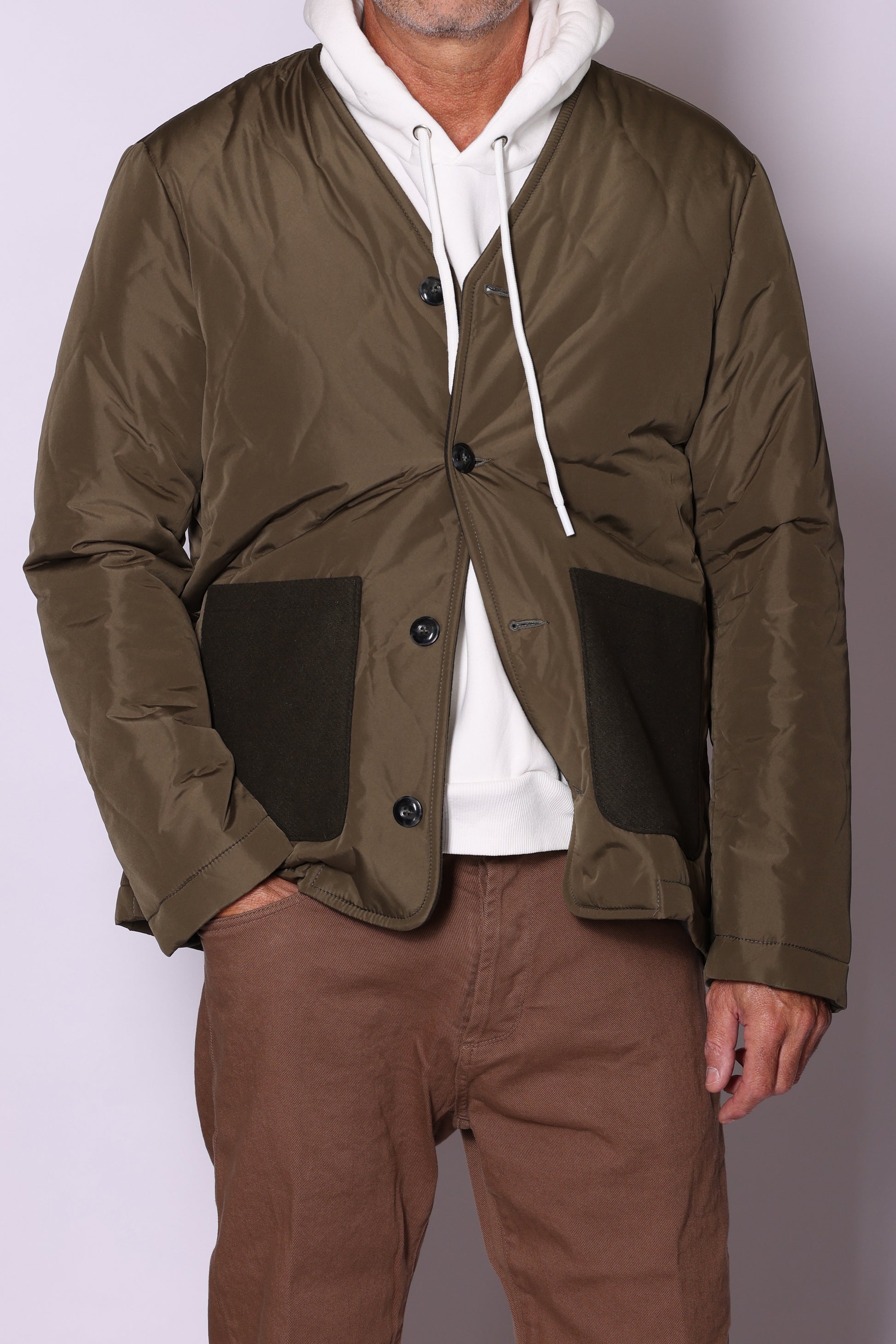 Giubbino tecnico trapuntato, scollo a V e chiusura centrale con bottoni. Tasche a toppa in tessuto a contrasto. Composizione: 54% poliestere, 46% cotone. Il modello è alto 180 cm pesa 74 kg indossa taglia L.