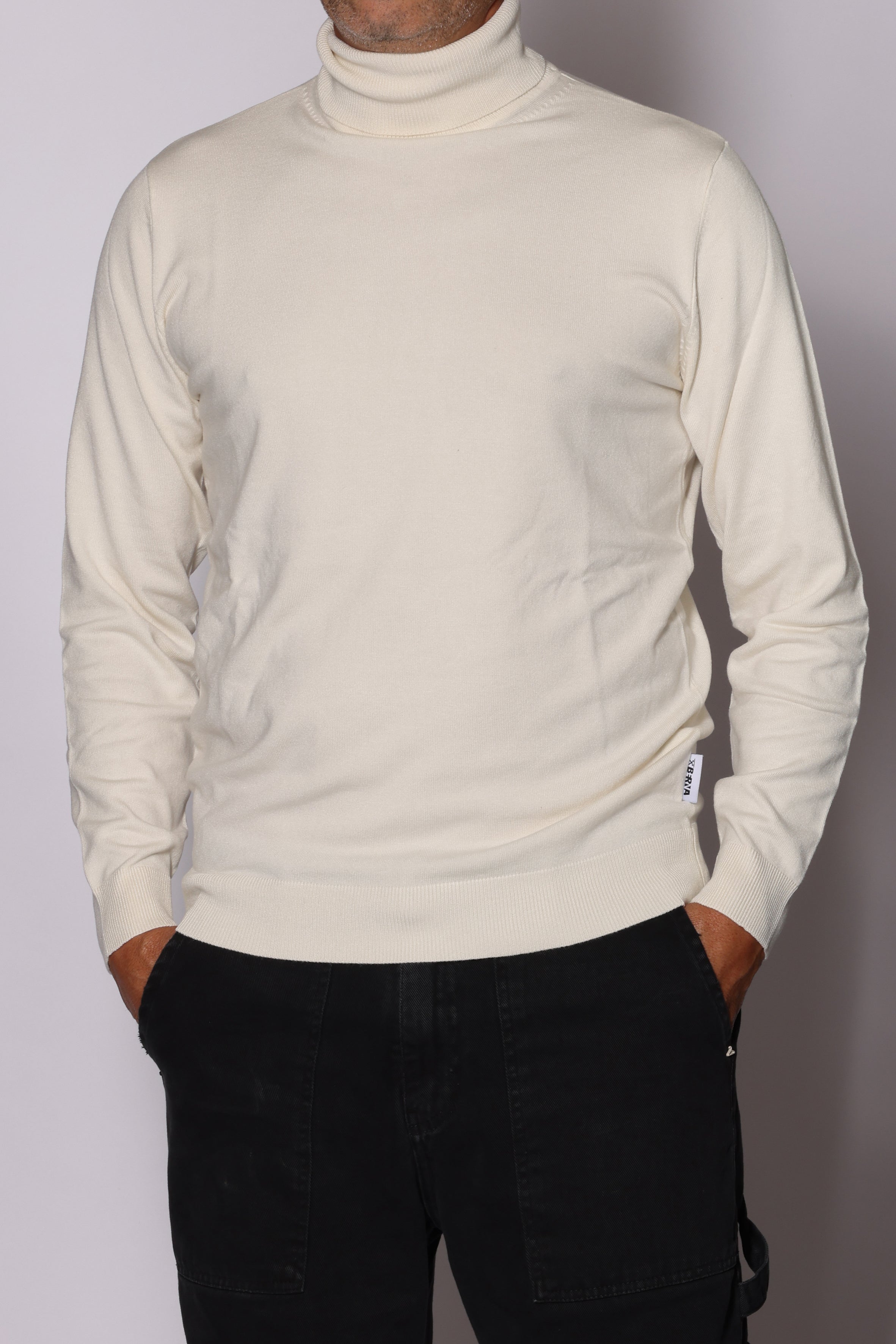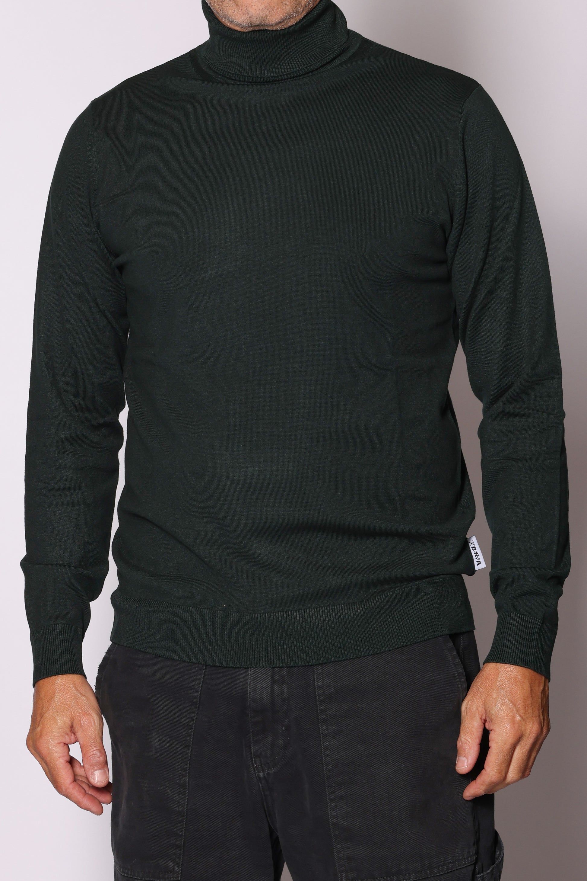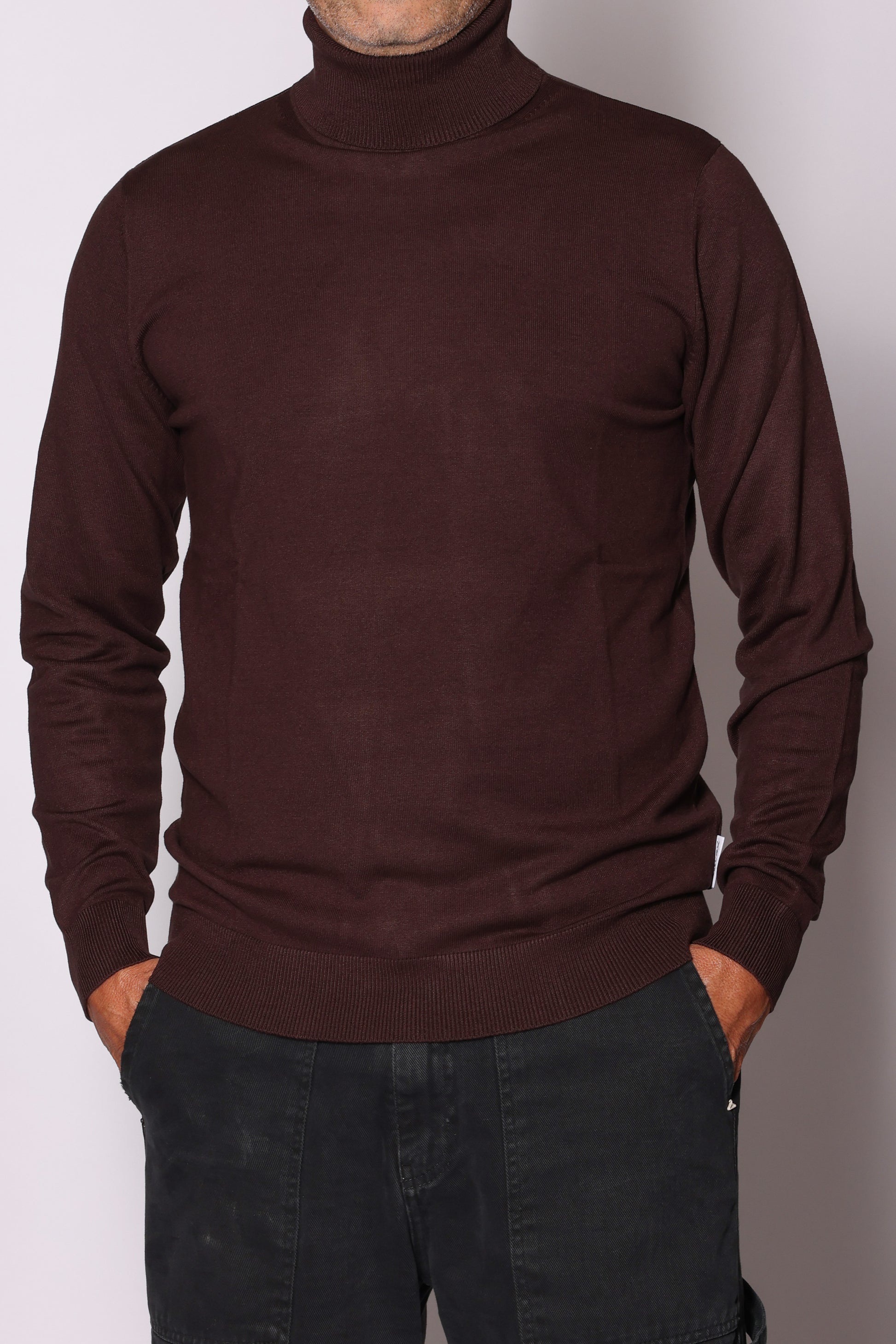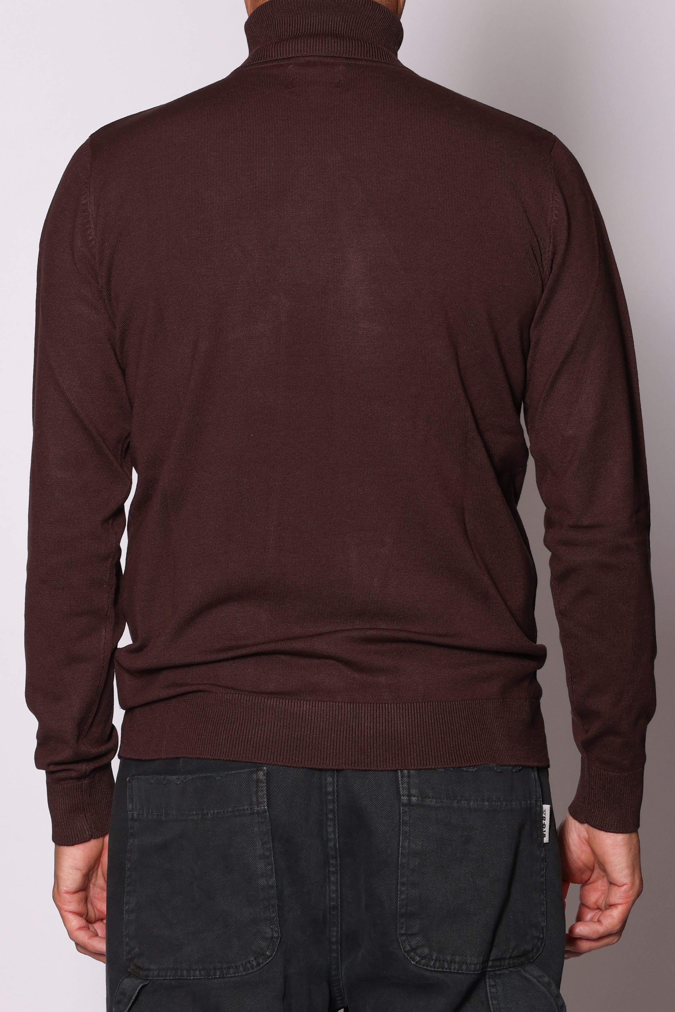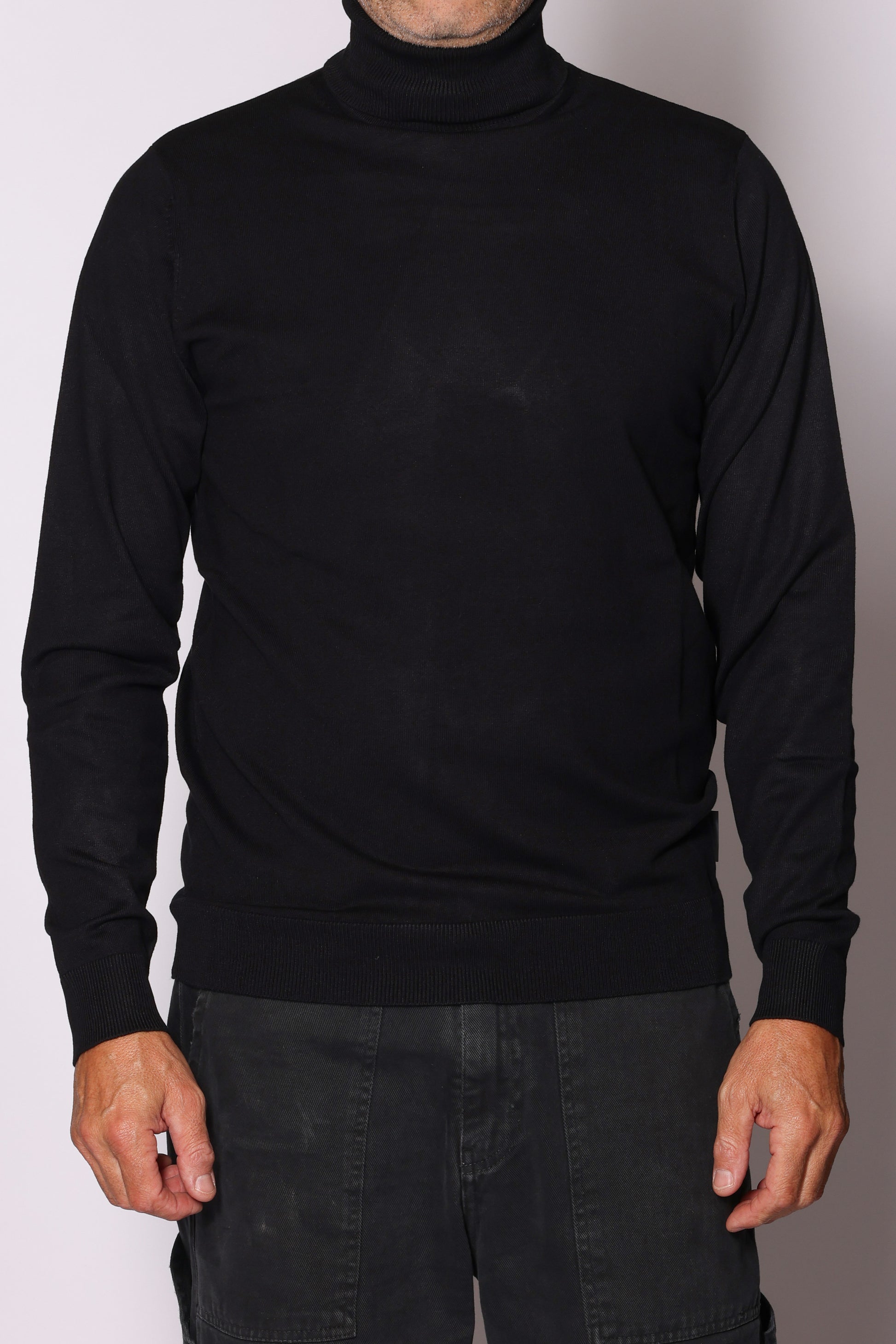 Maglia in viscosa dolcevita. Composizione: 70% viscosa, 30% poliamide. Il modello è alto 180 cm pesa 74 kg indossa taglia L.