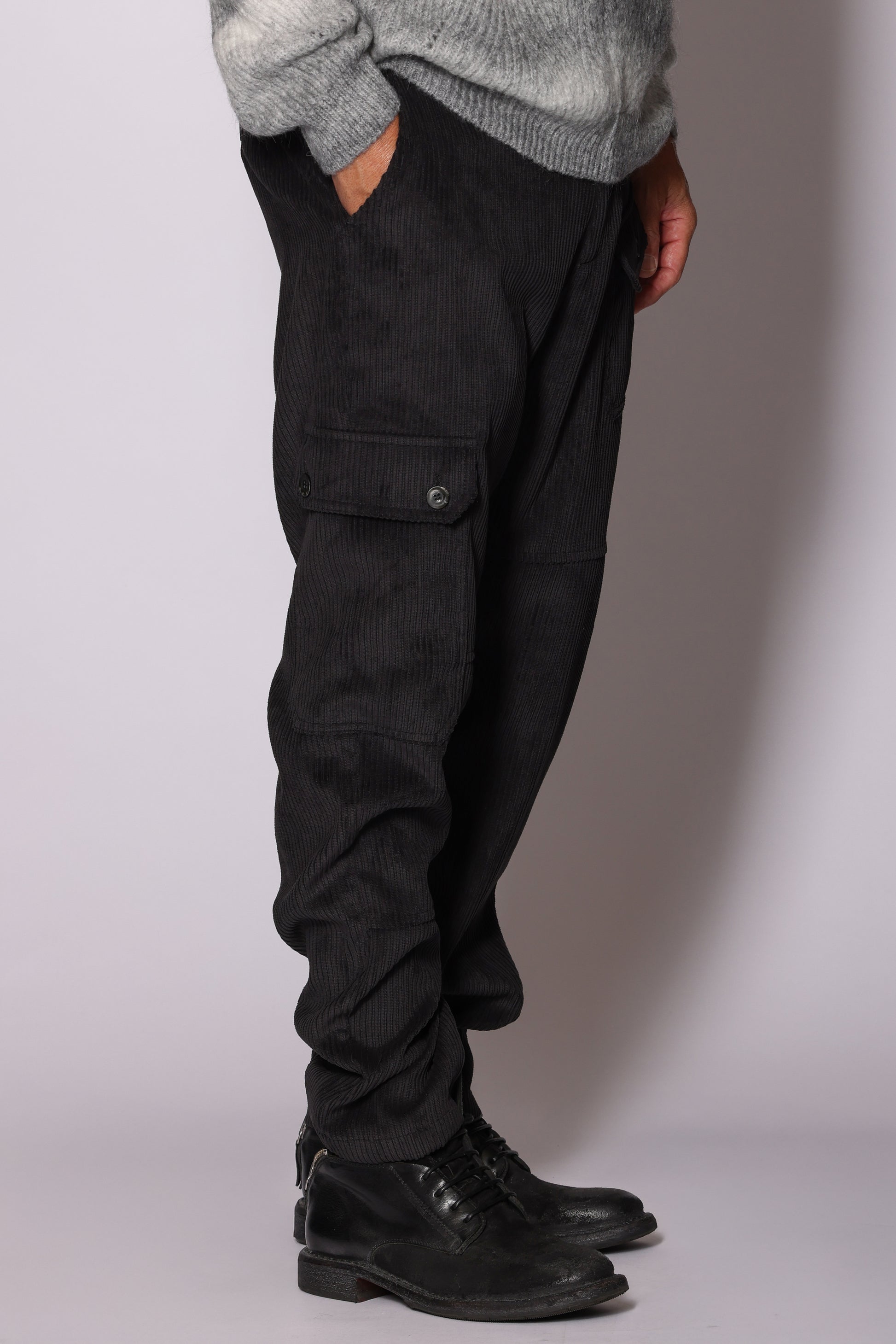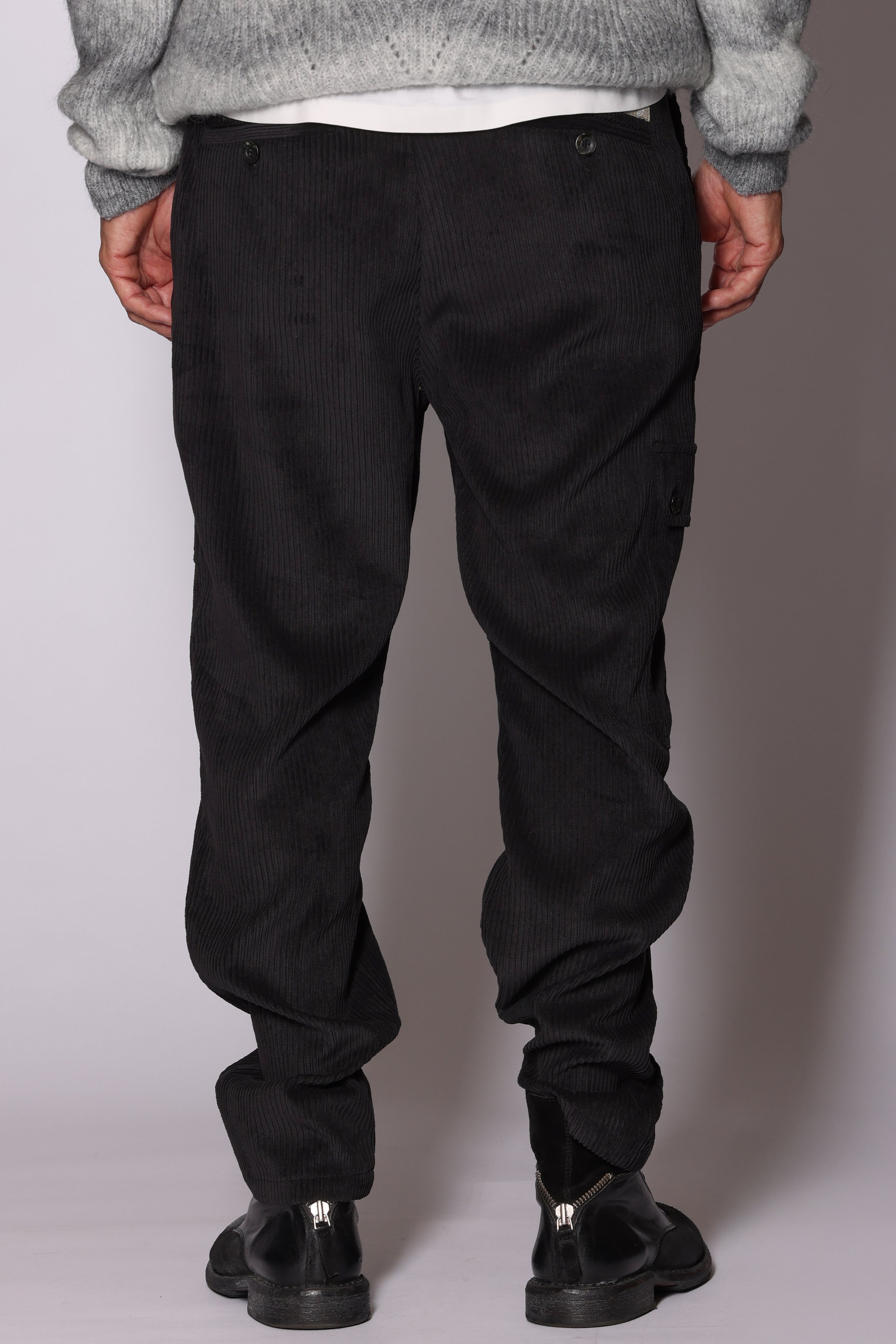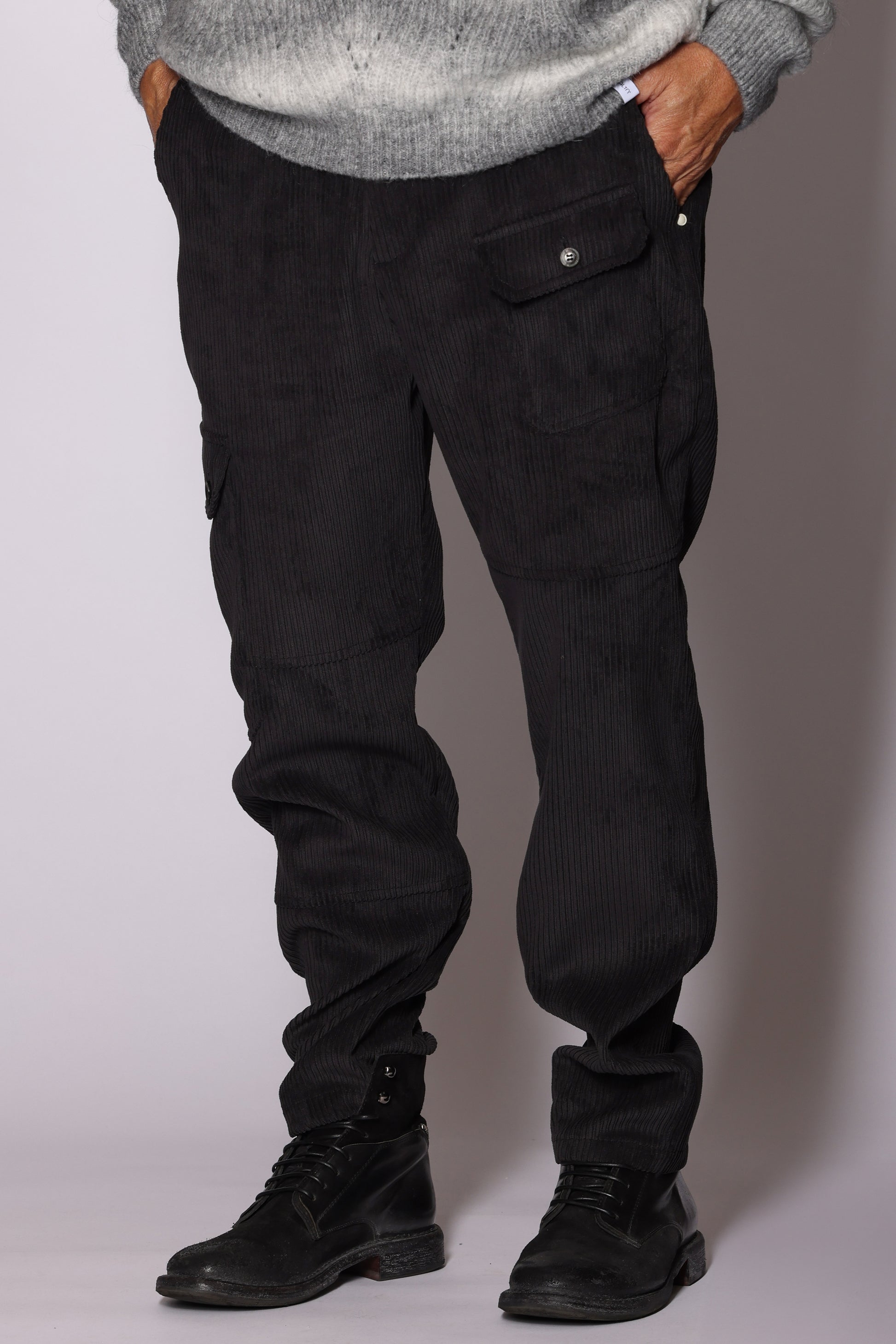 Pantalone in velluto a coste, chiusura centrale con bottone e zip, tasche a toppa con patta sul davanti, tasche a filo laterali e sul retro. Composizione: 90% poliestere, 8% nylon, 2% elastam. Il modello è alto 180 cm pesa 74 kg indossa taglia 48