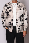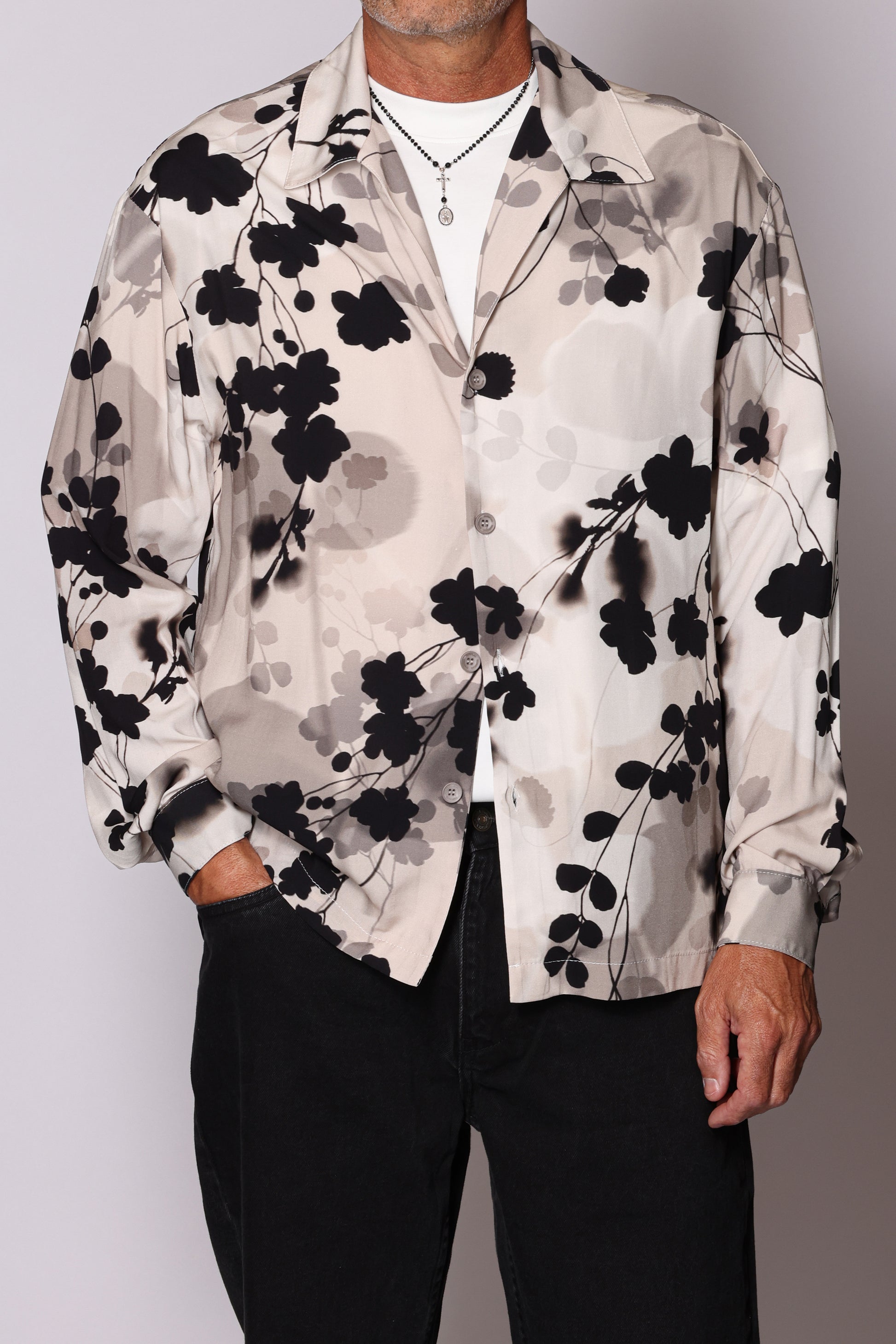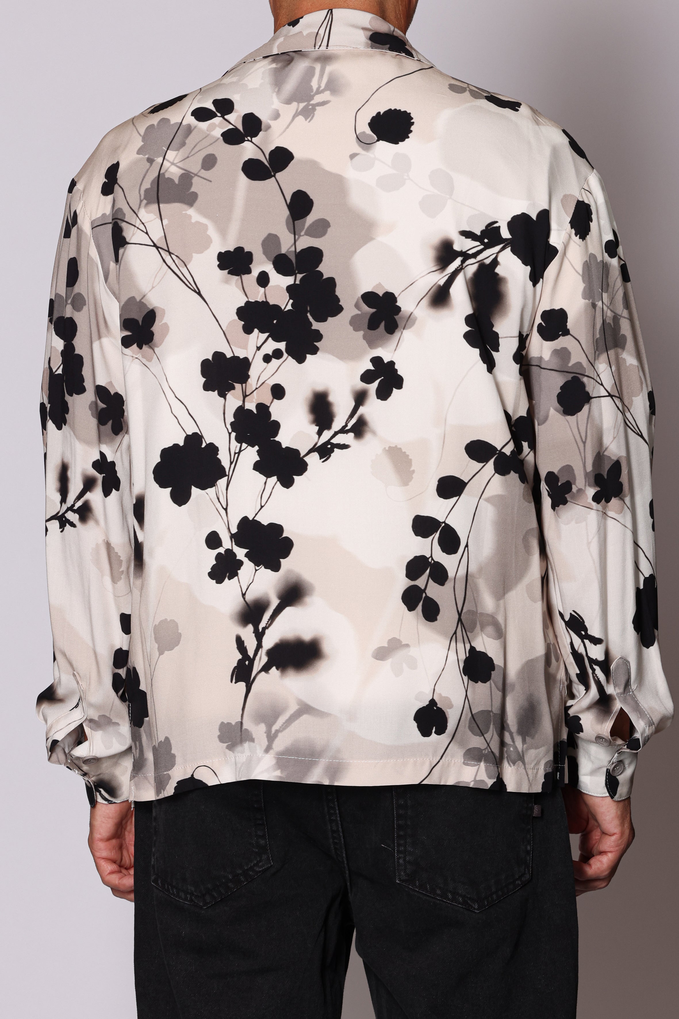 Camicia collo bowling fantasia fiori, chiusura centrale con bottoni, spacchetti laterali sul fondo. Composizione: 100% viscosa. Il modello è alto 180 cm pesa 74 kg indossa taglia L.