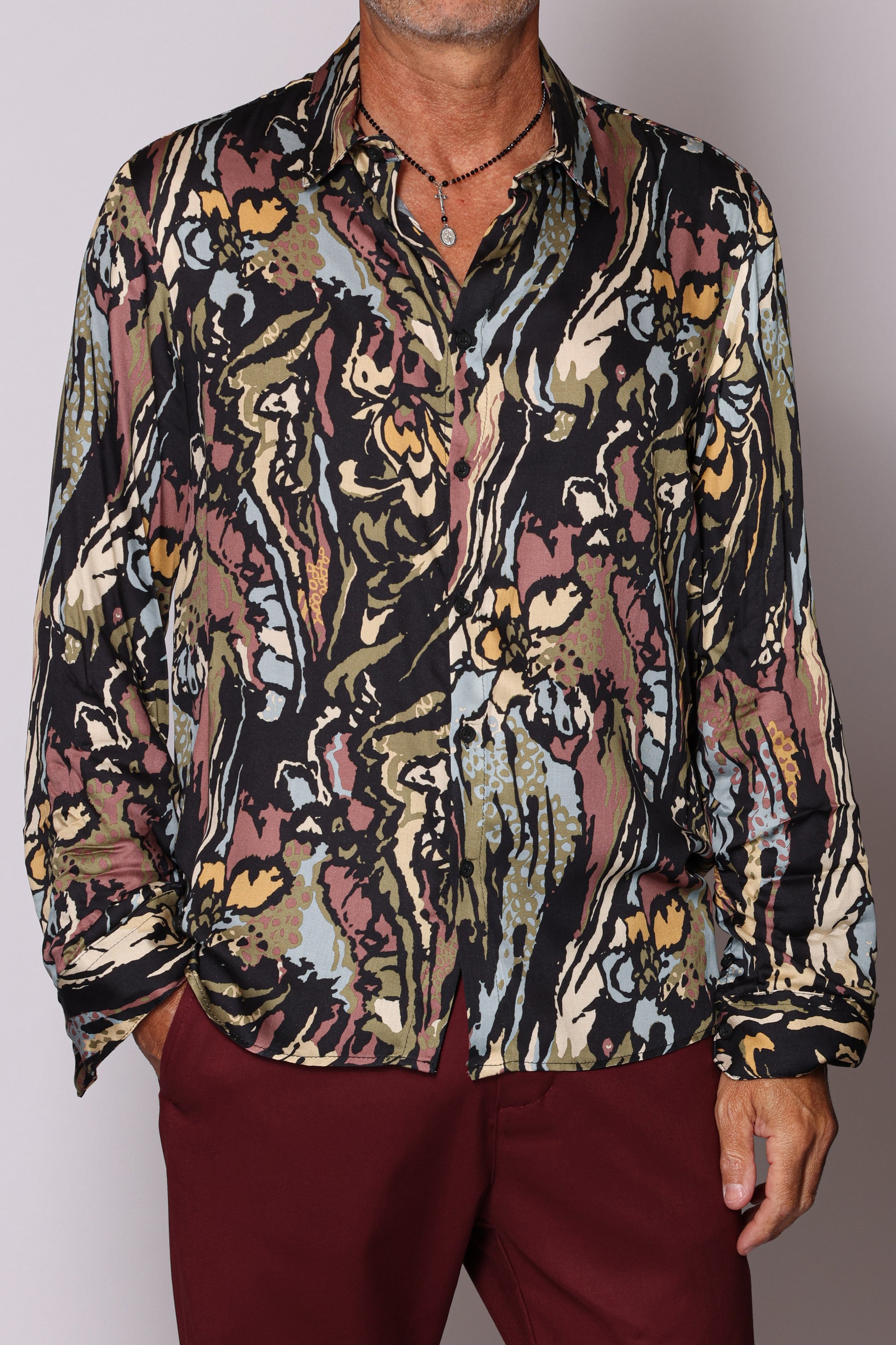 Camicia fantasia, chiusura centrale con bottoni, spacchetti laterali sul fondo. Composizione: 100% viscosa. Il modello è alto 180 cm pesa 74 kg indossa taglia L.