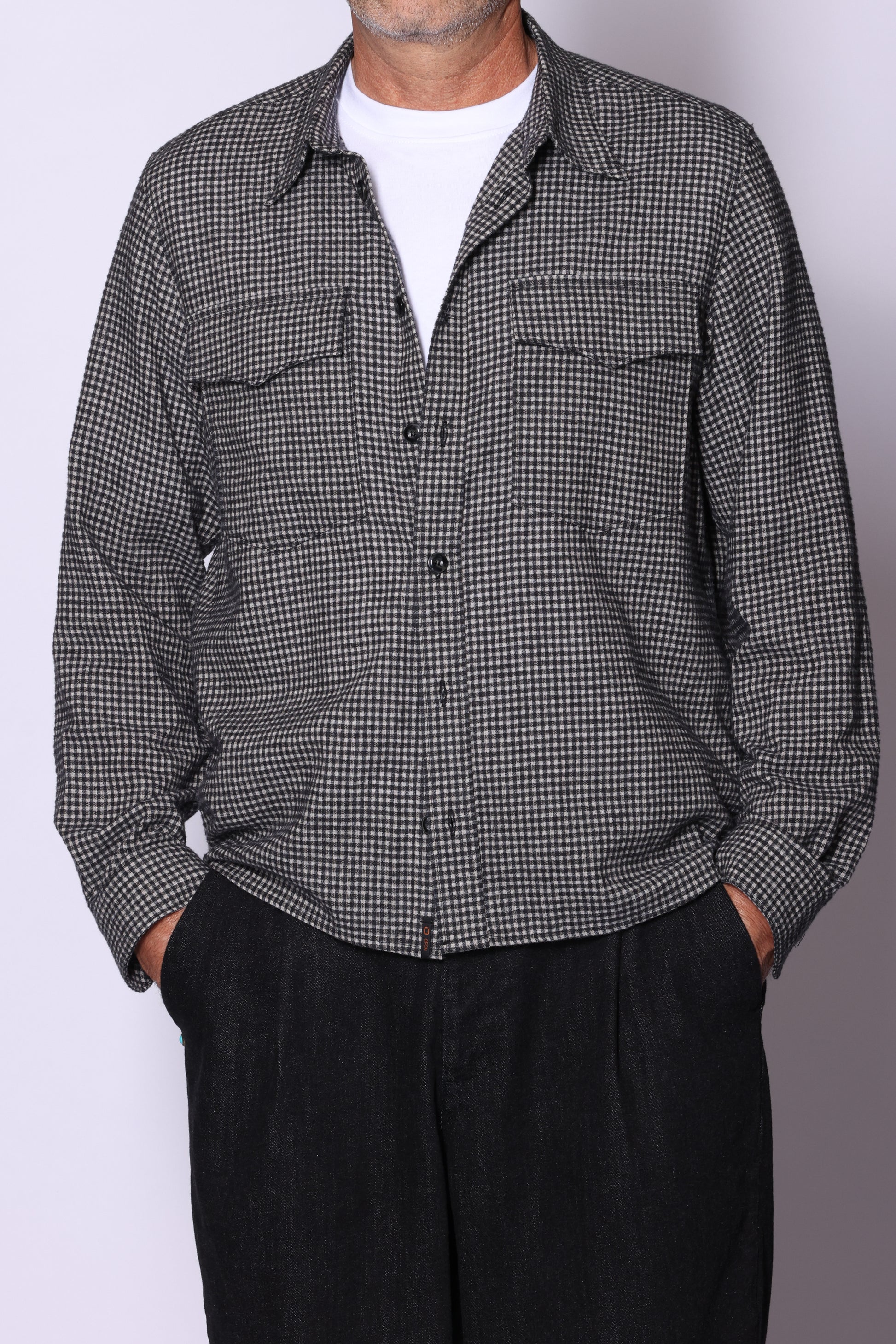 Camicia fantasia quadri, chiusura centrale con bottoni, tasche a toppa con patta fondo leggermente stondato. Composizione: 48% cotone, 32% viscosa, 18% poliestere, 2% altre fibre. Il modello è alto 180 cm pesa 74 kg indossa taglia L.