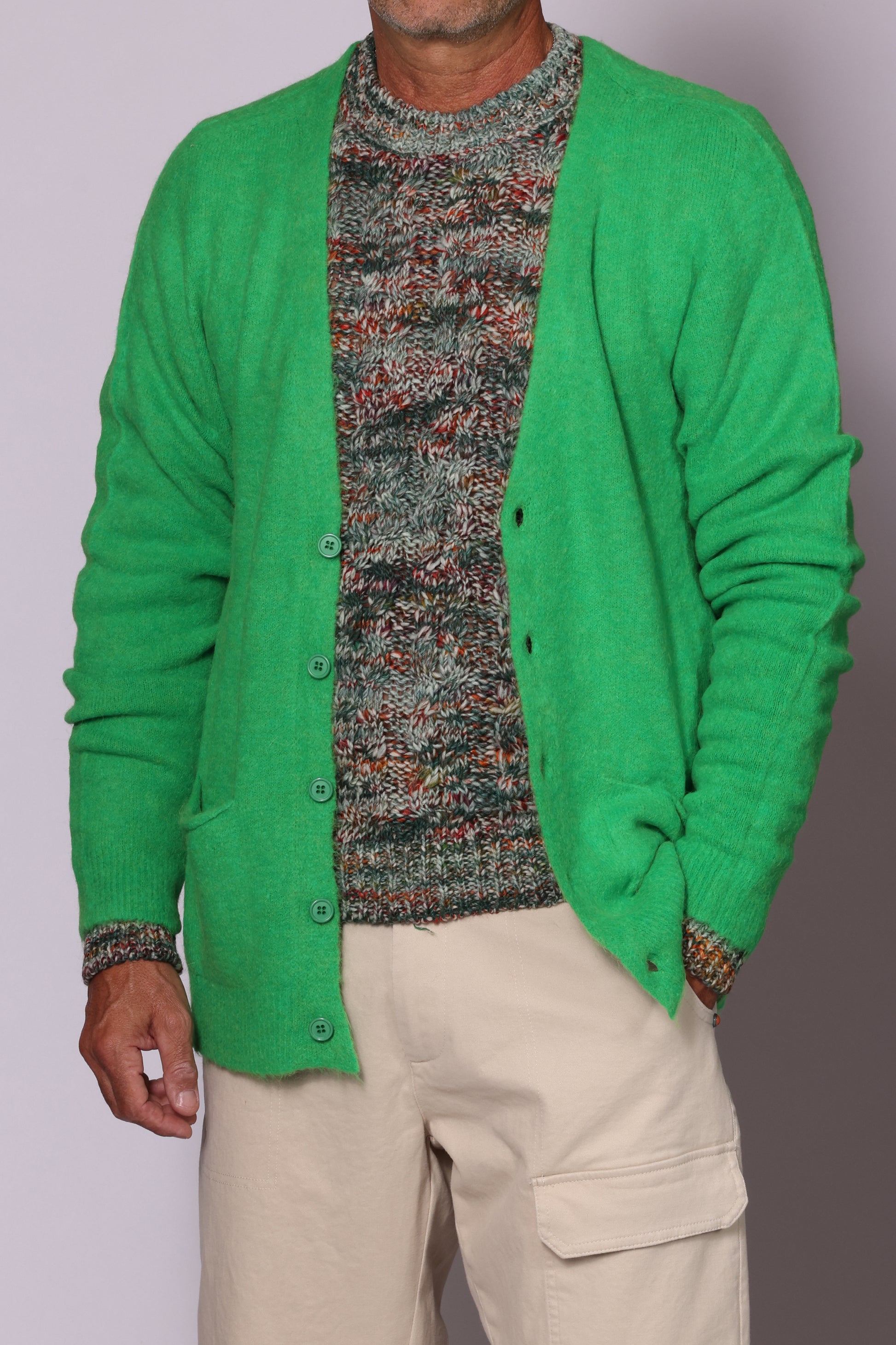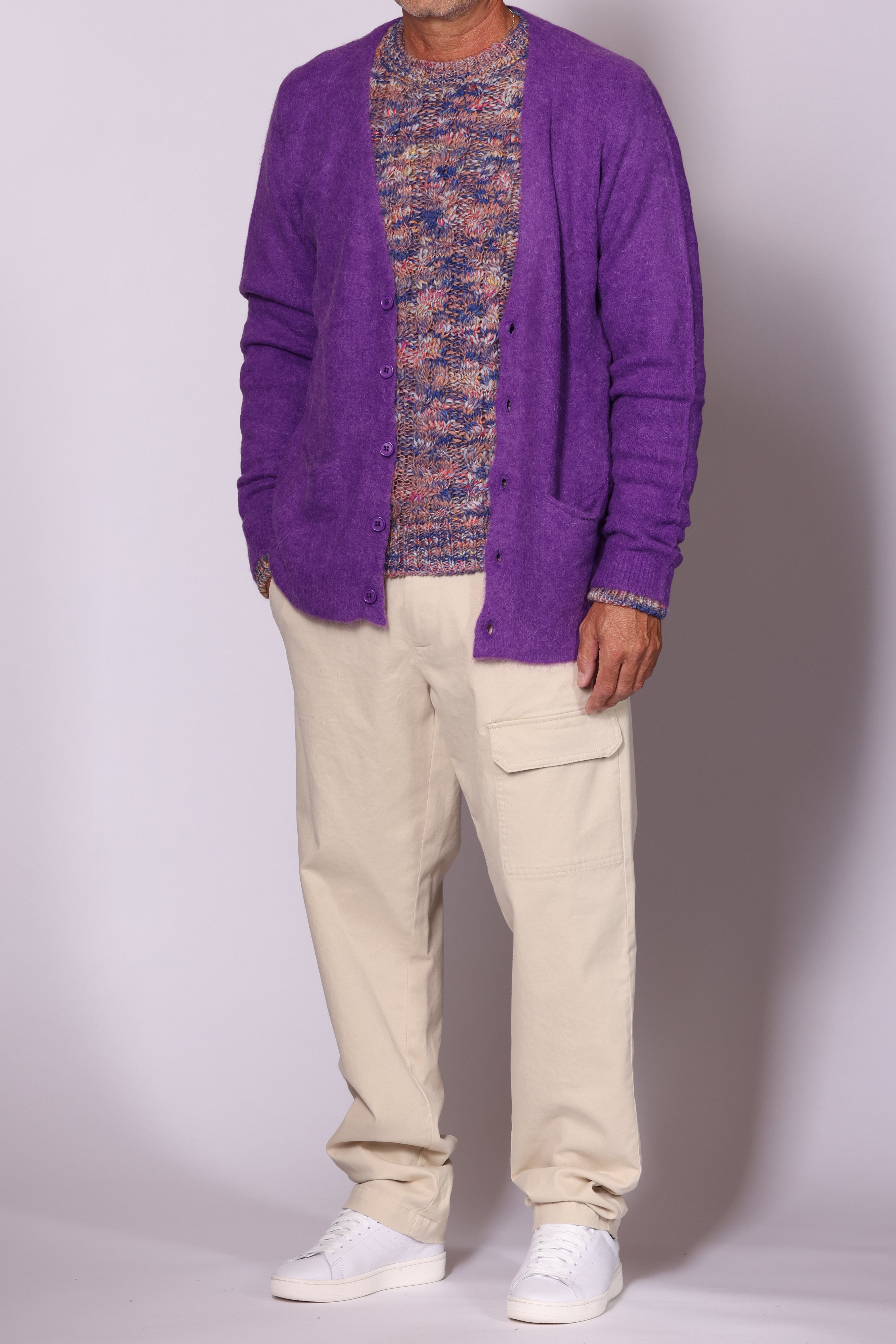 Cardigan in misto lana con scollo a V, chiusura centrale con bottoni, vestibilità regolare. Composizione: 30% alpaca, 30% lana, 20% poliamide, 16% acrilico, 4% elastam. Il modello è alto 180 cm pesa 74 kg indossa taglia L.