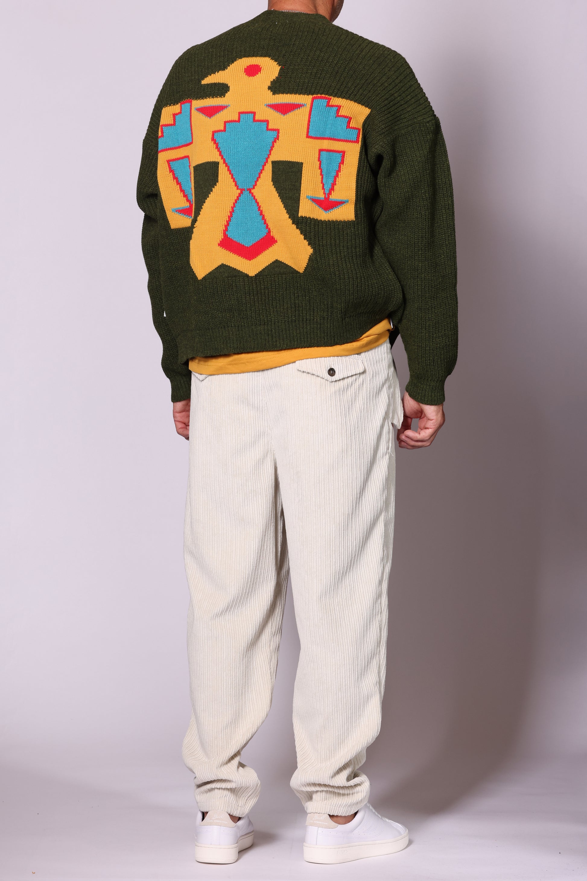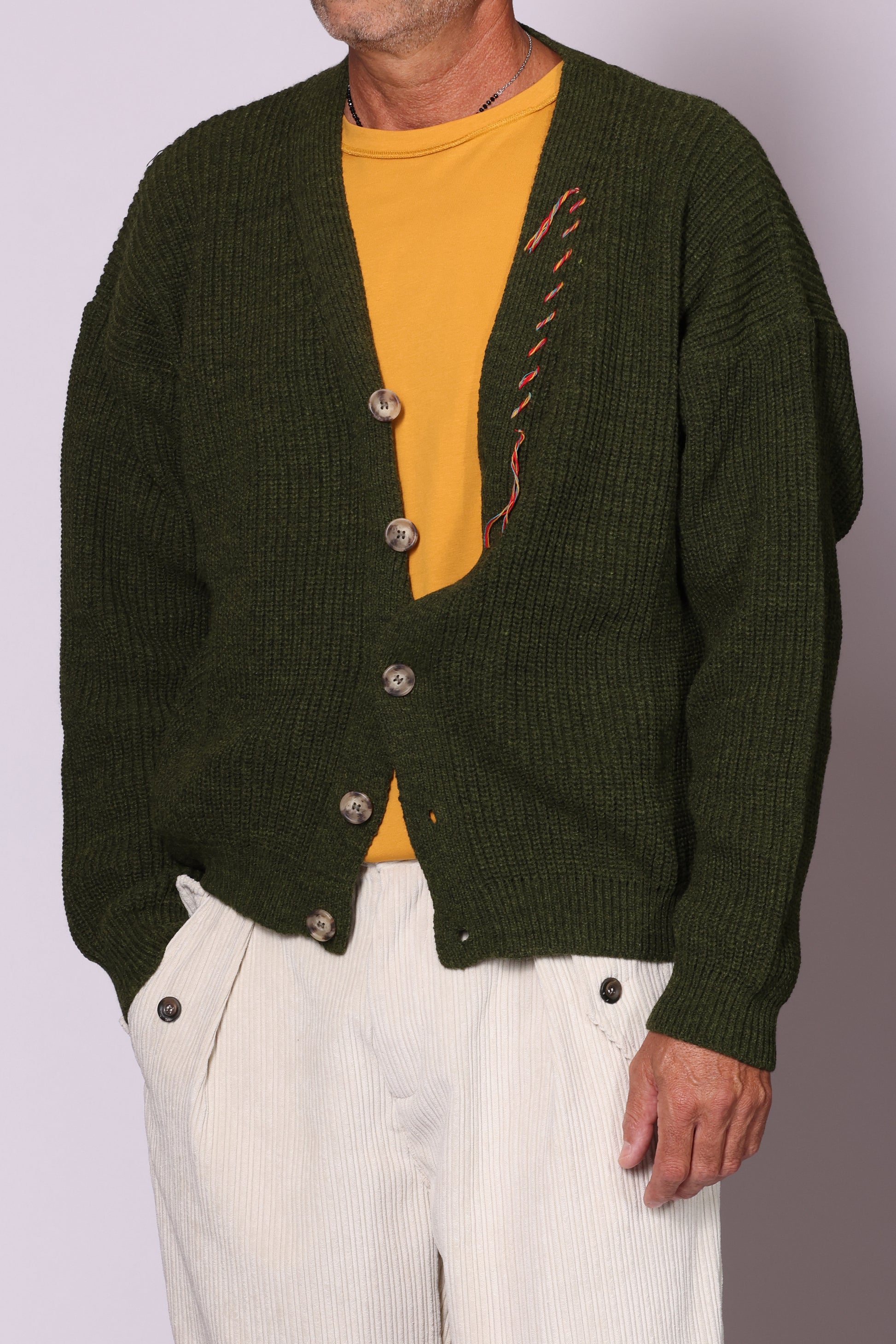 Cardigan jacquard con scollo a V, chiusura centrale con bottoni, maxi disegno sul retro. Vestibilità Over. Composizione: 100% dralon. Il modello è alto 180 cm pesa 74 kg indossa taglia M.