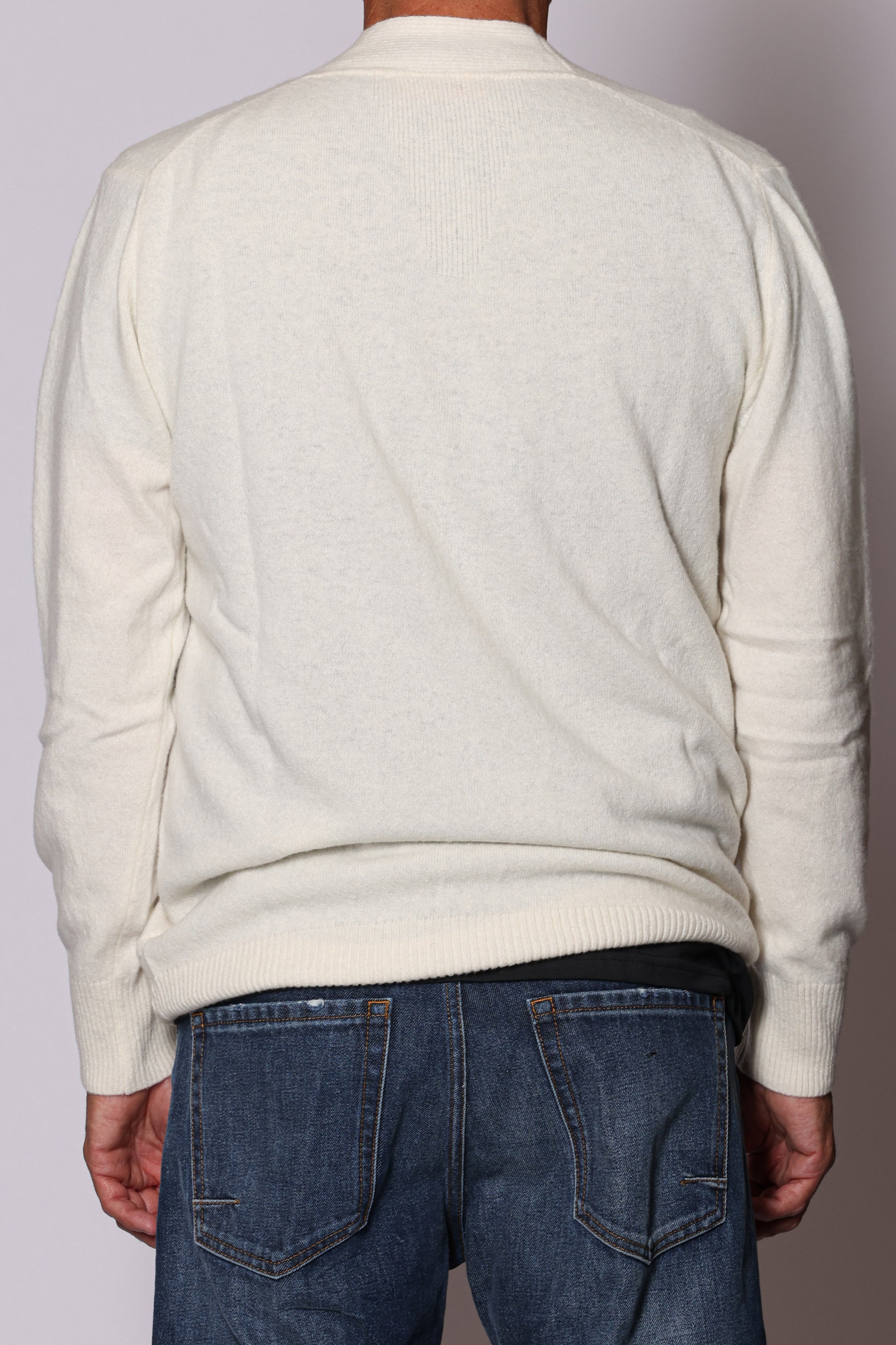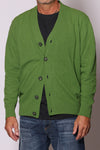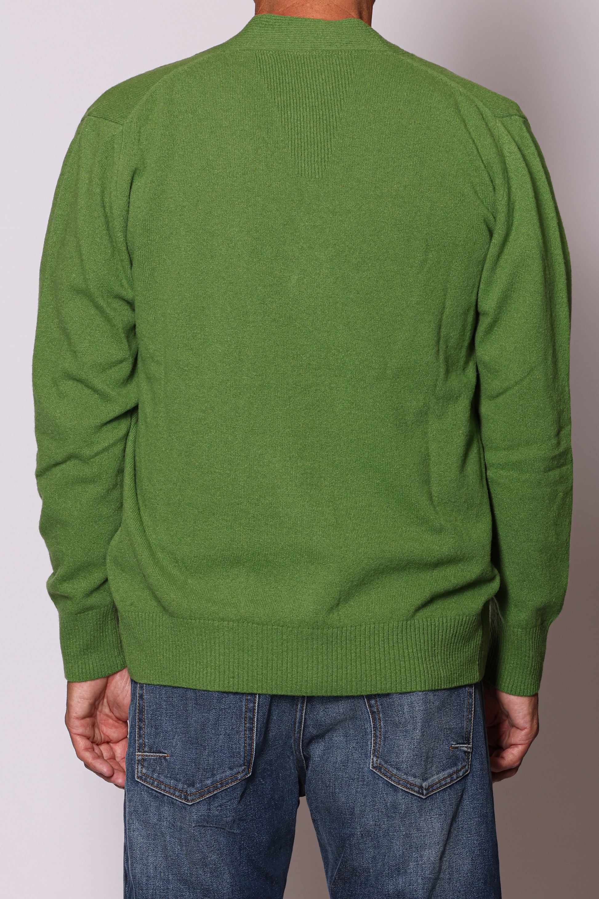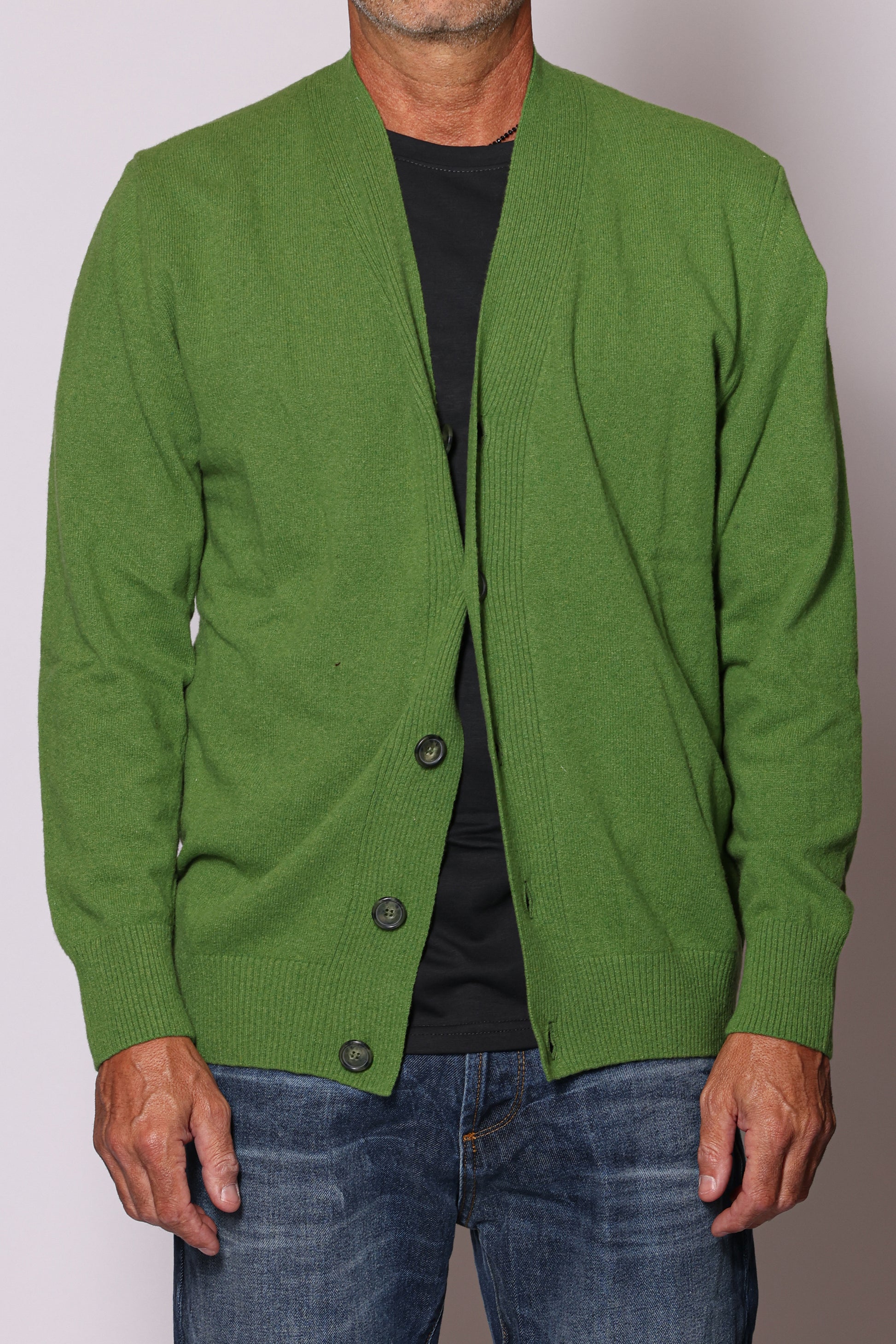Cardigan scollo a V, chiusura centrale con bottoni. Composizione: 80% lana, 20% poliammide. Il modello è alto 180 cm pesa 74 kg indossa taglia L.
