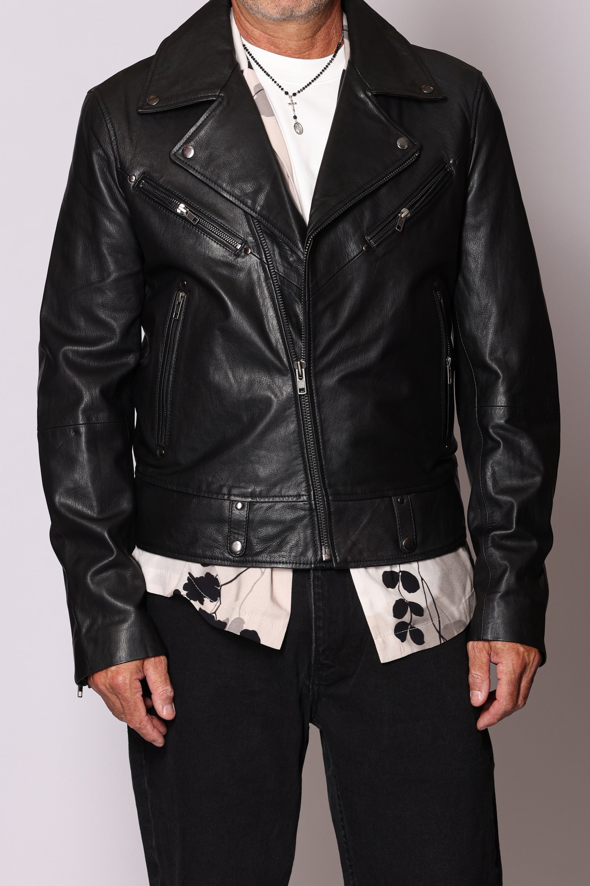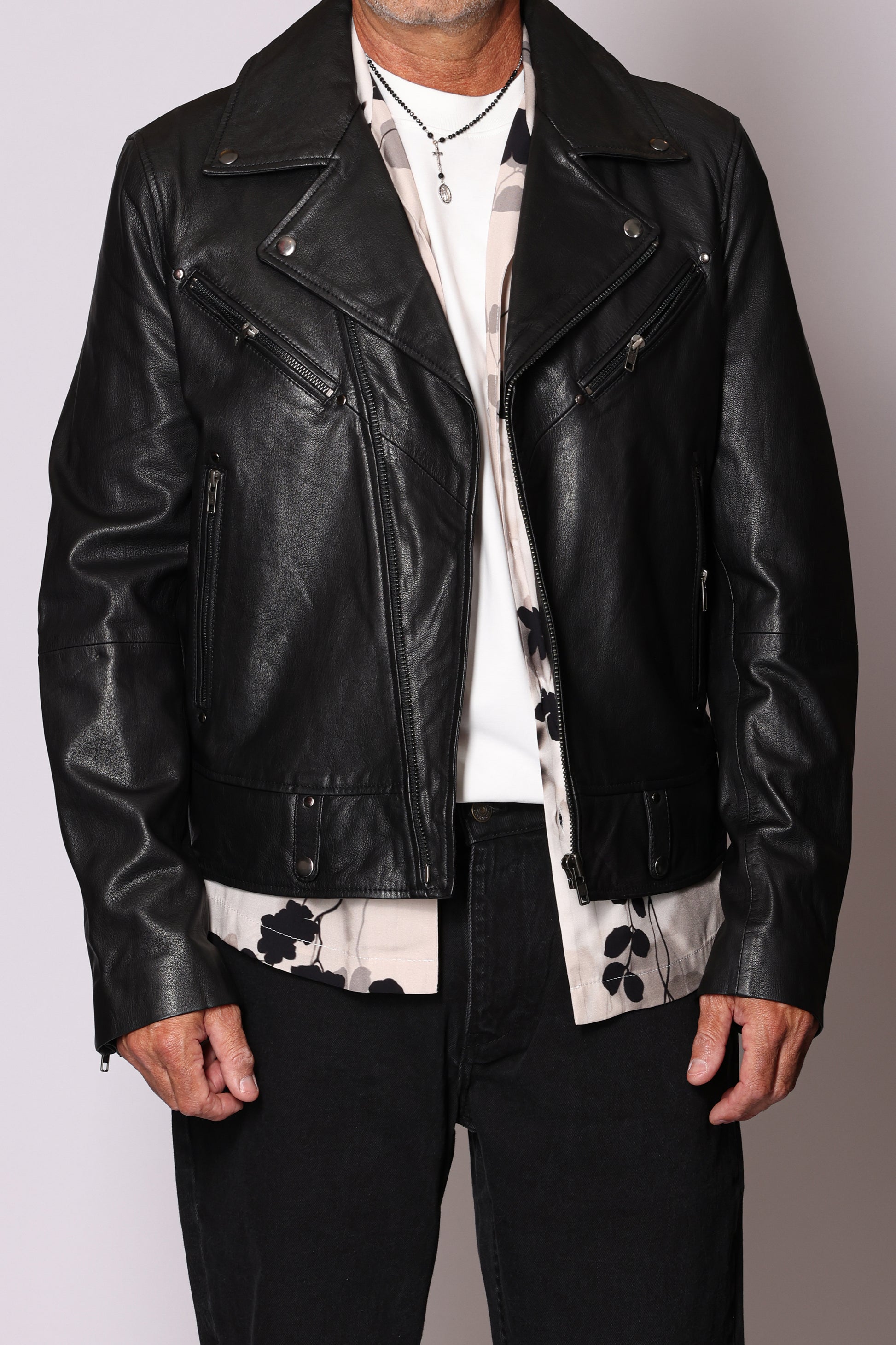 Chiodo in vera pelle, chiusura asimmetrica con zip. Composizione: 100% vera pelle. Il modello è alto 180 cm pesa 74 kg indossa taglia L.