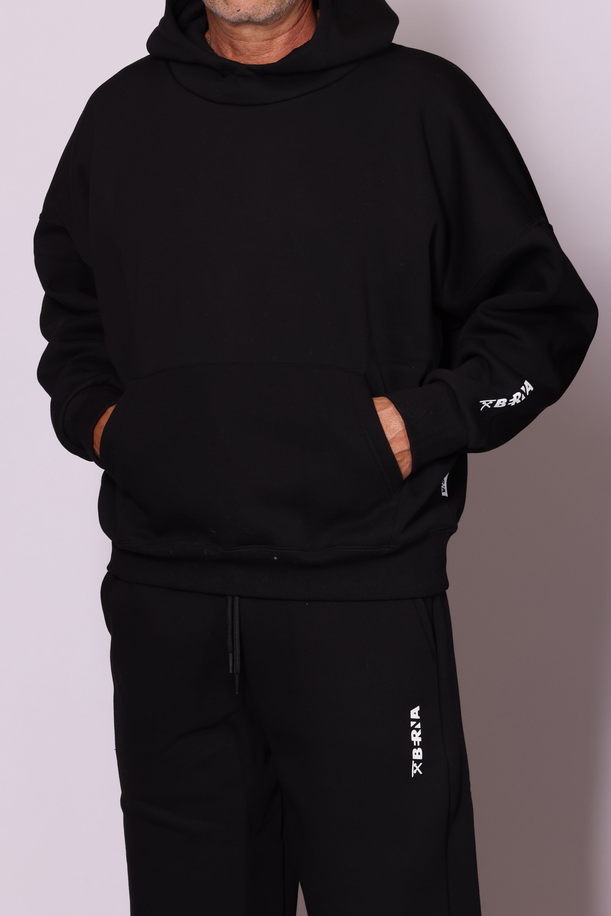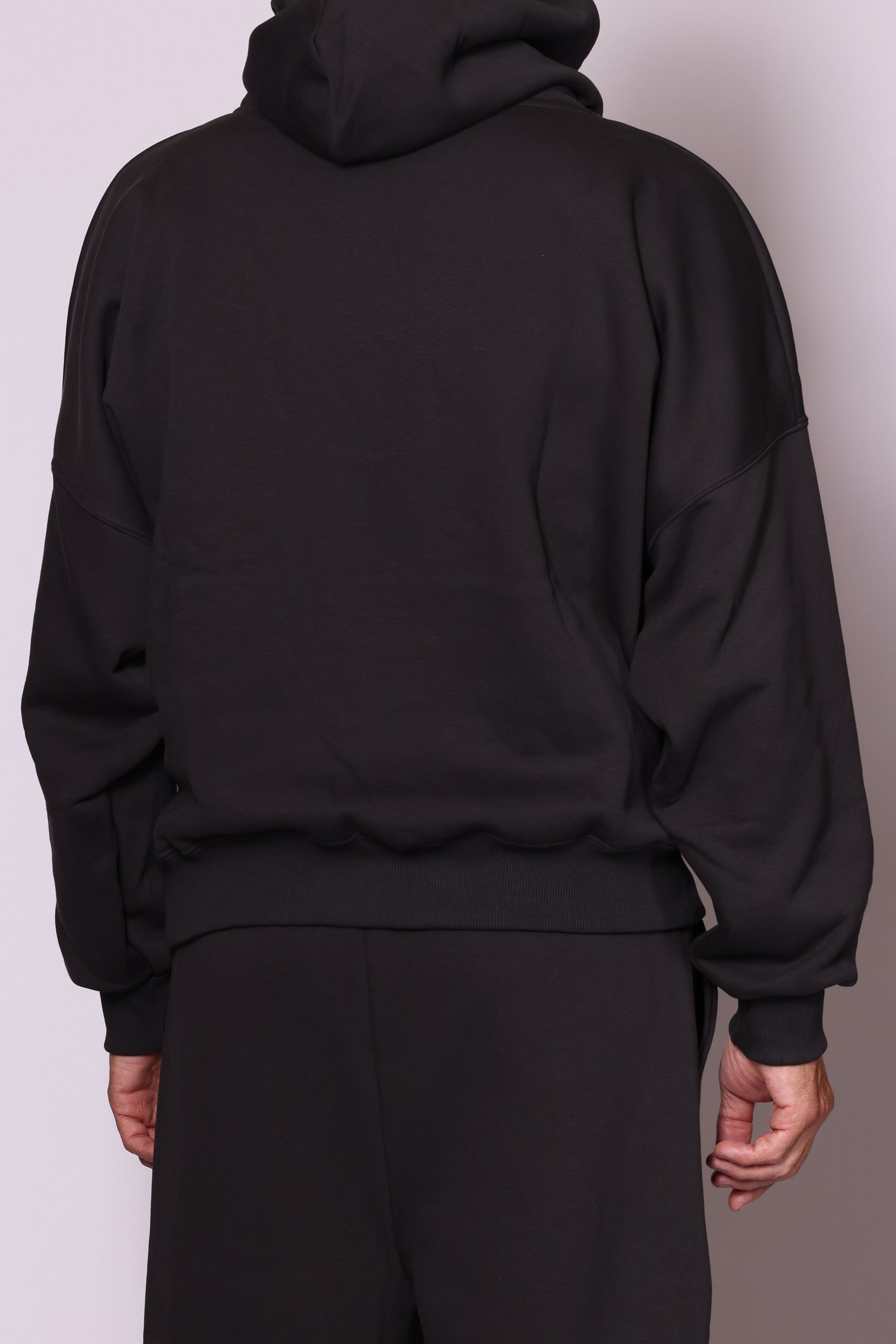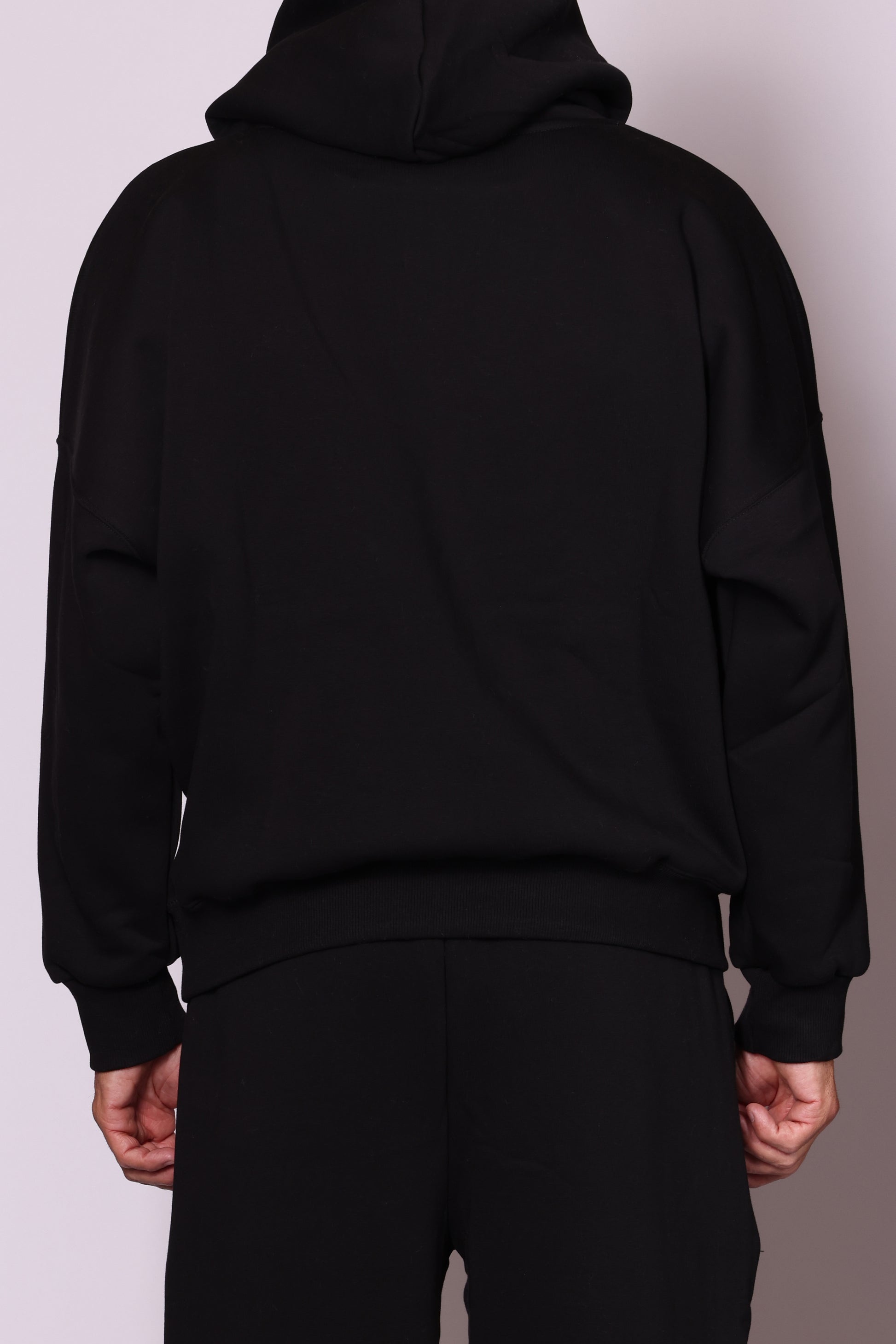 Felpa cappuccio oblò, tasca a marsupio sul davanti e logo stampato sulla manica. Interno pile. Composizione: 65% cotone, 35% poliestere. Il modello è alto 180 cm pesa 74 kg indossa taglia L.