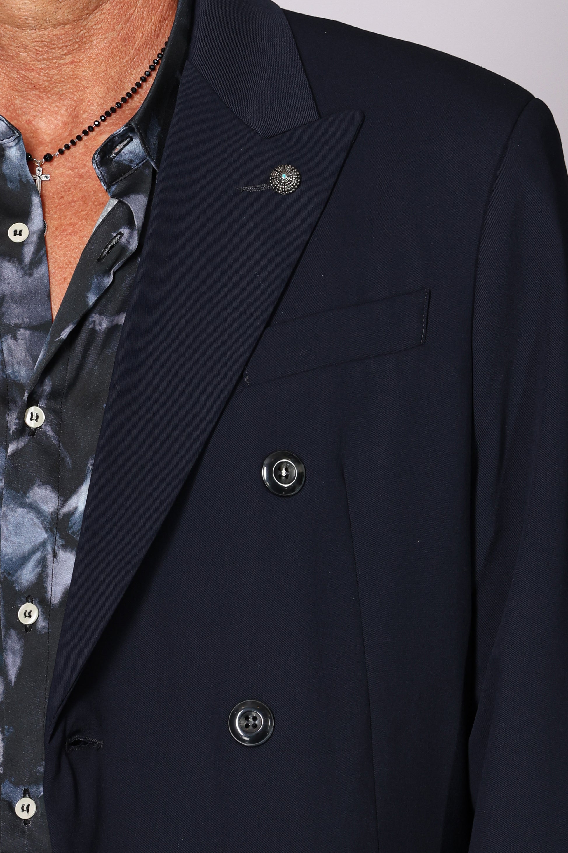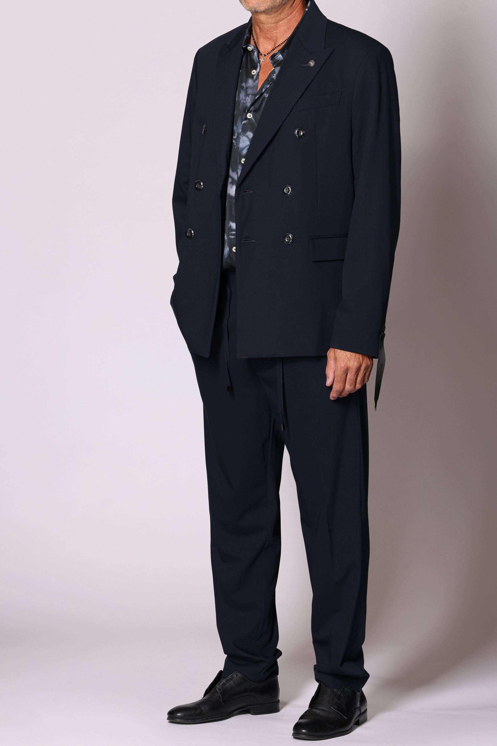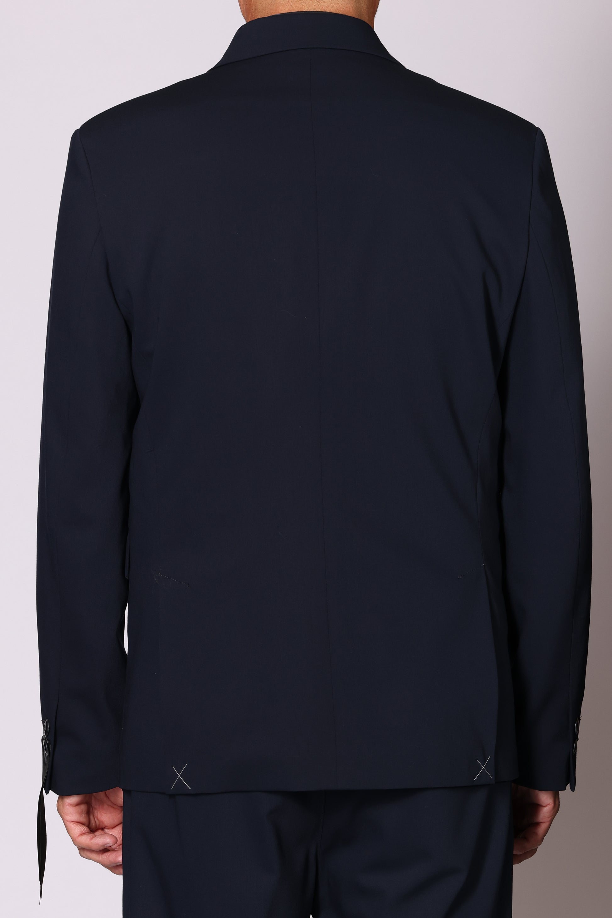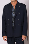Giacca doppiopetto collo a lancia, tasche a filo con patta sul davanti, spacchetti laterali sul retro. Composizione: 62% poliestere, 25% viscosa, 8% lana, 5% elastam. Il modello è alto 180 cm pesa 74 kg indossa taglia 48.