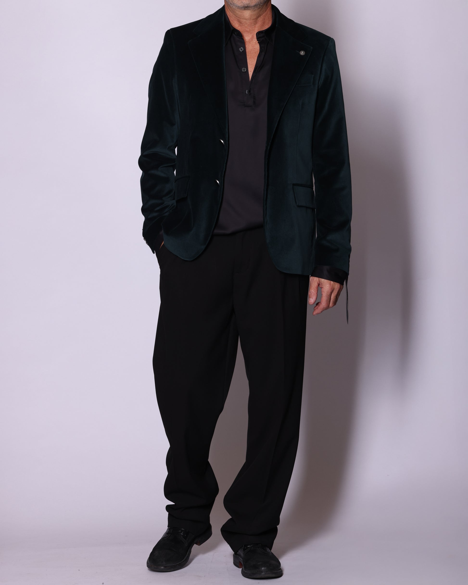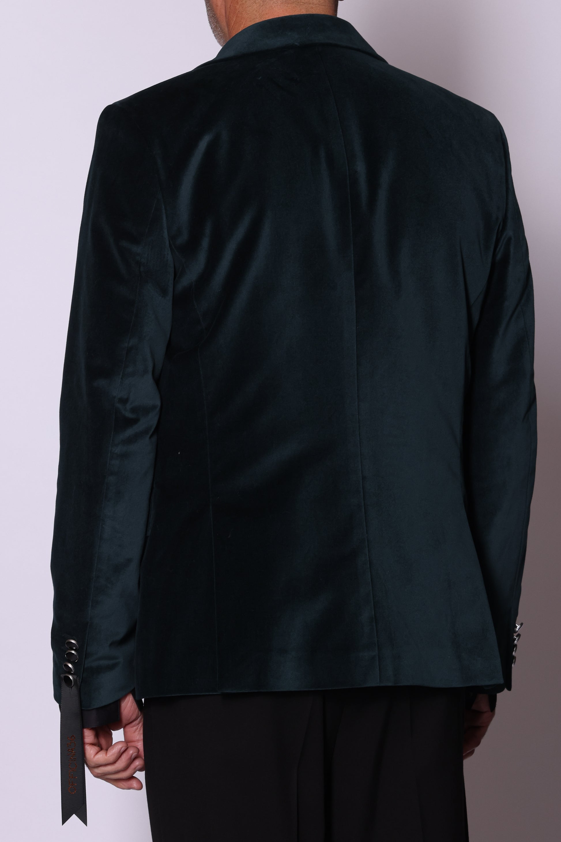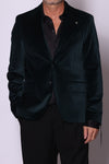 Giacca monopetto in velluto liscio. Tasche a filo con patta sul davanti, due spacchetti laterali sul retro. Composizione: 100% cotone. Il modello è alto 180 cm pesa 74 kg indossa taglia 48.