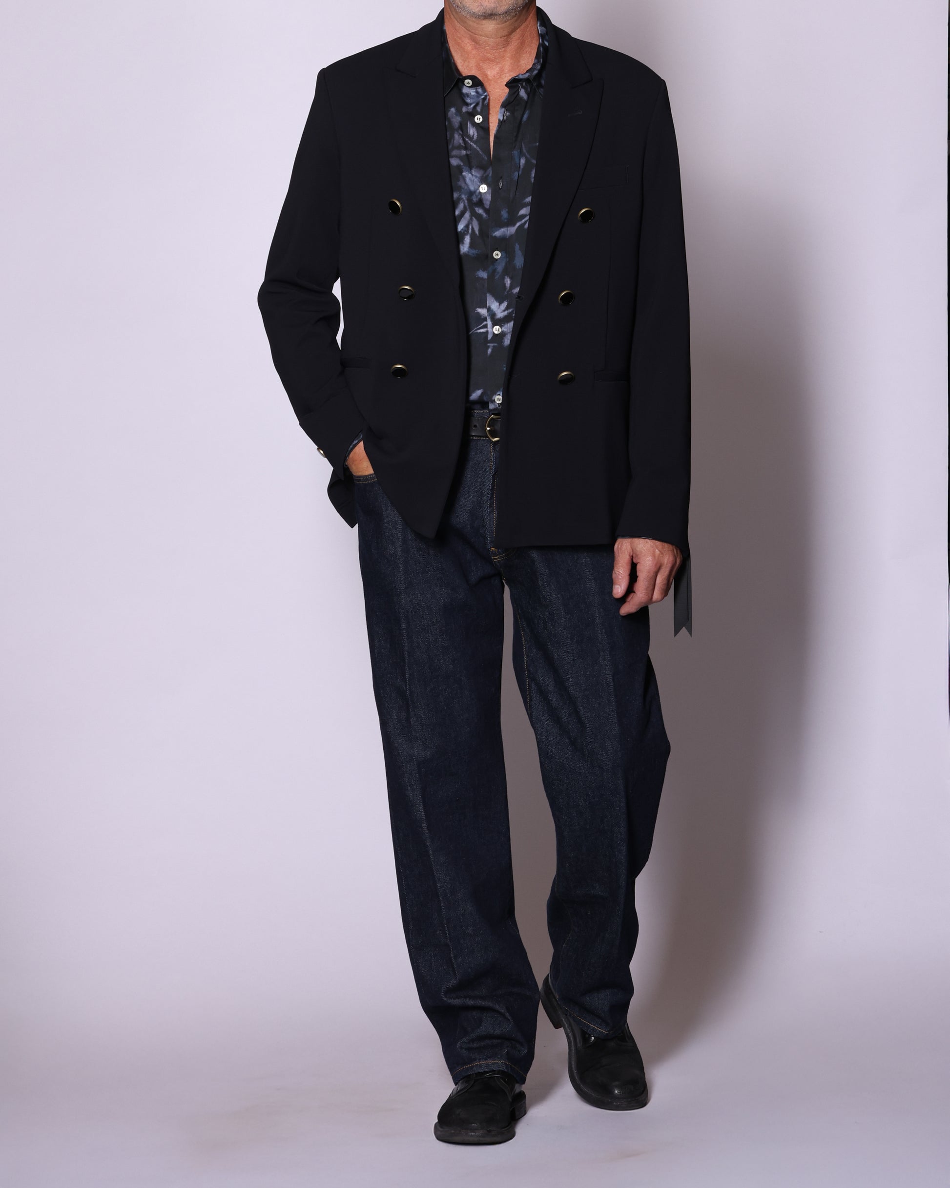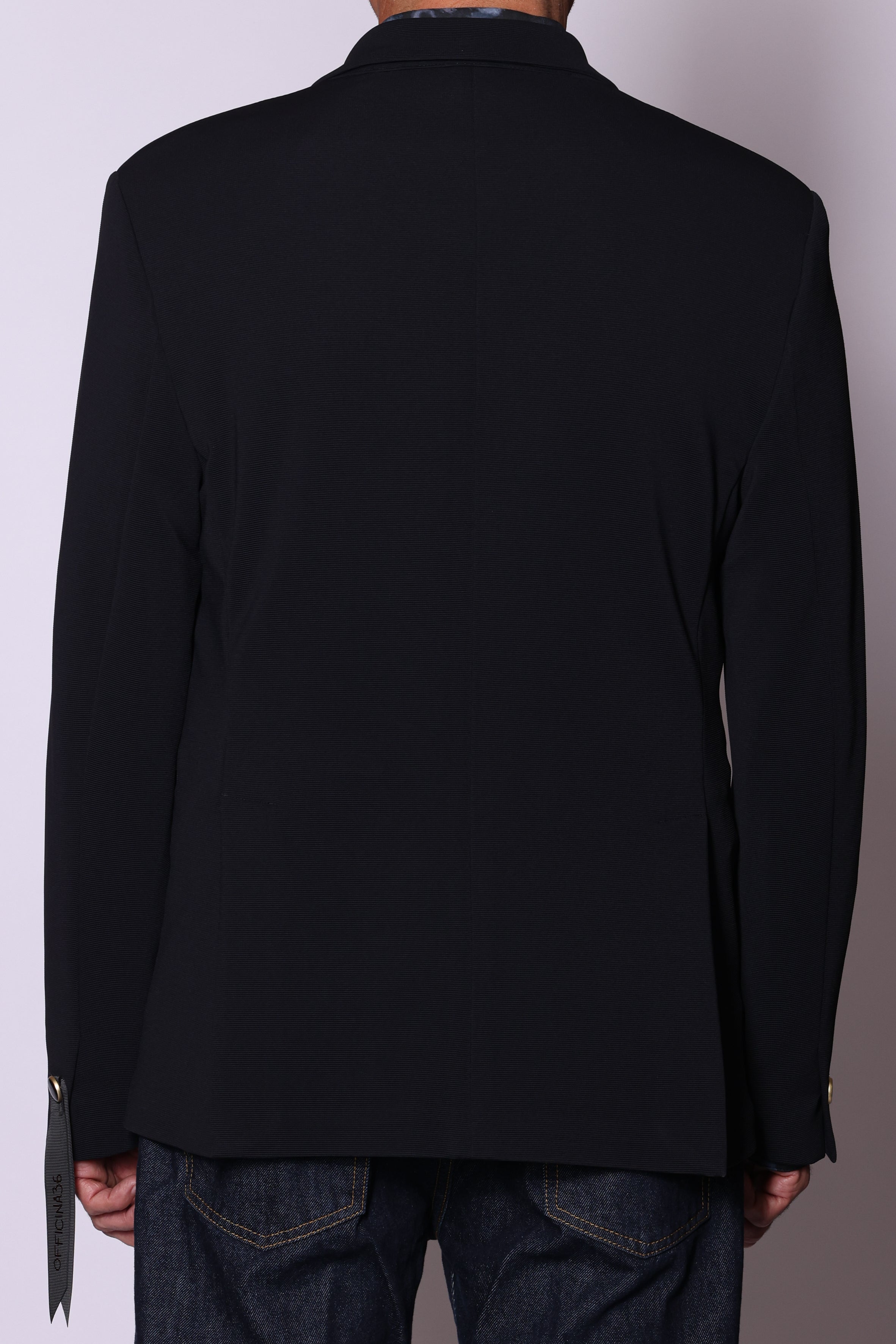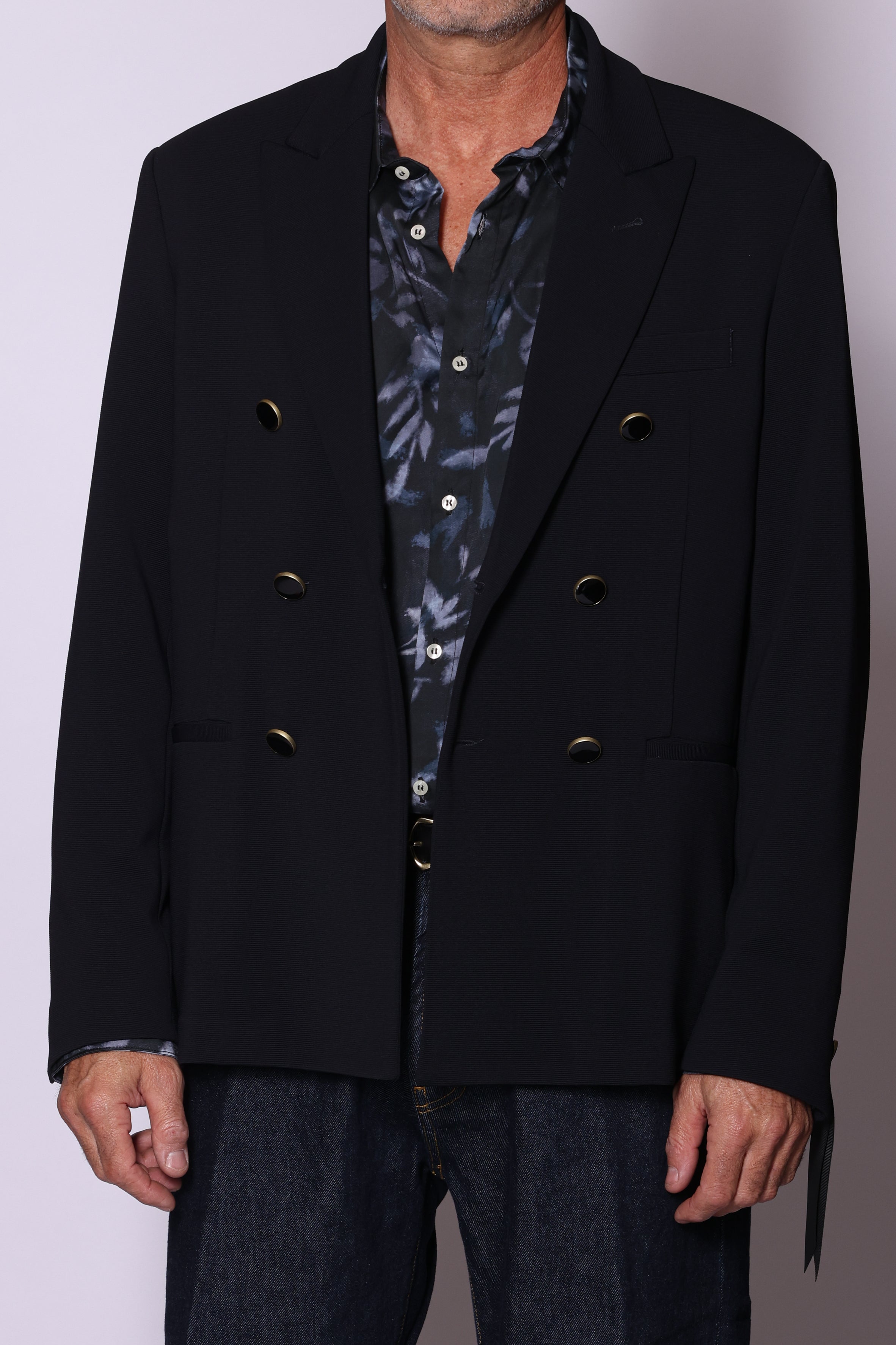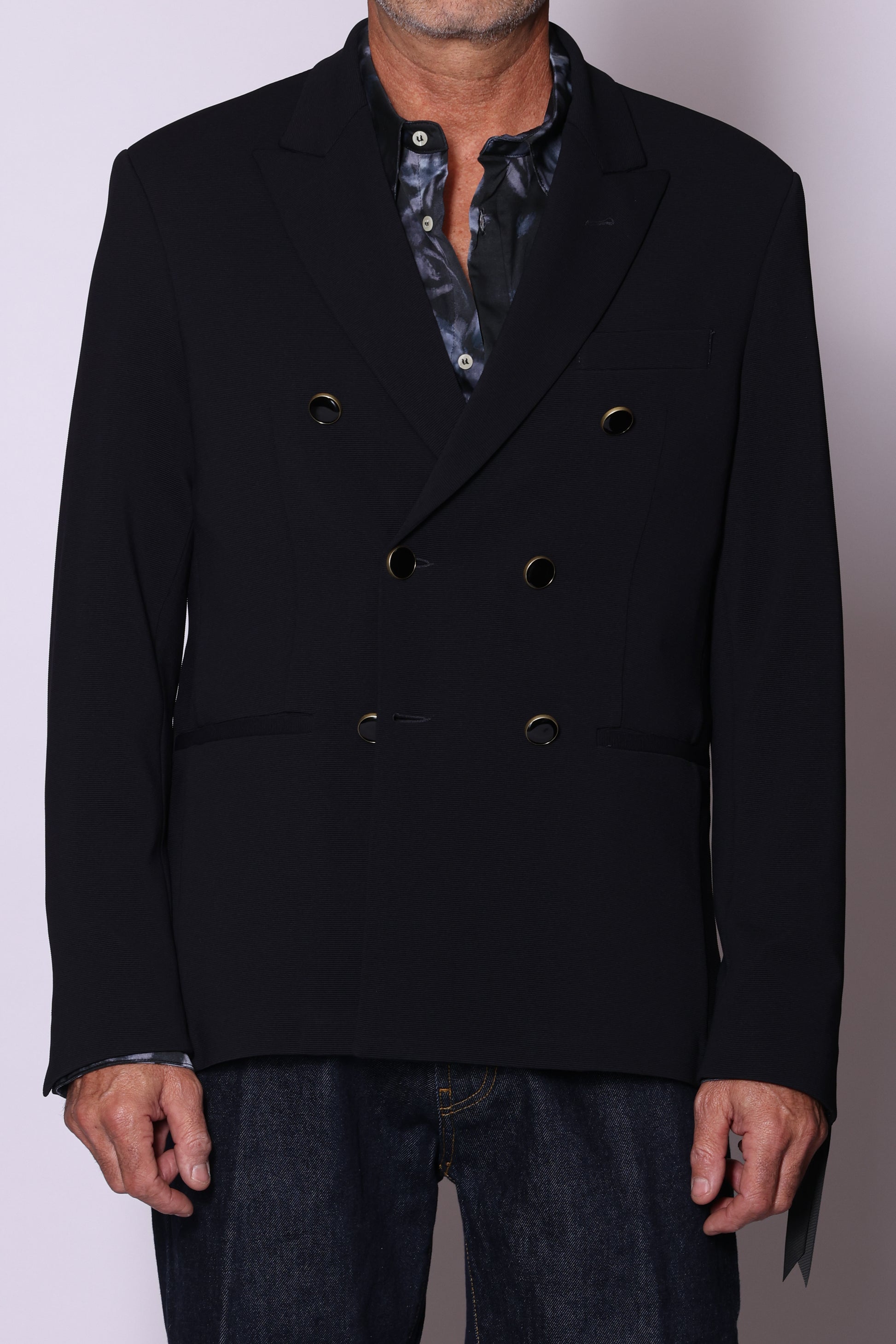 Giacca doppiopetto . Tasche a filo sul davanti, spacchetti laterali sul retro. Composizione: 97% poliammide, 3% elastam. Il modello è alto 180 cm pesa 74 kg indossa taglia 48.