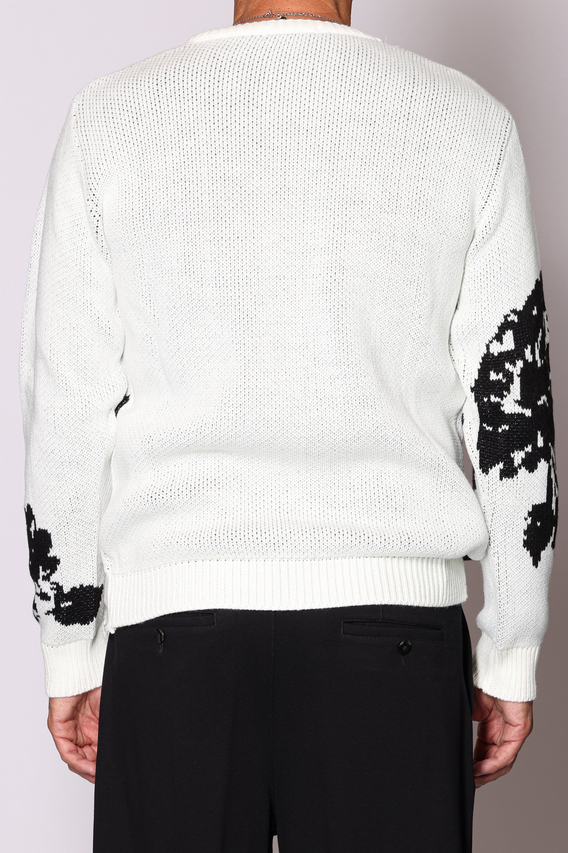 Maglia girocollo fantasia fiore. Composizione: 70% acrilico, 30% lana. Il modello è alto 180 cm pesa 74 kg indossa taglia M.