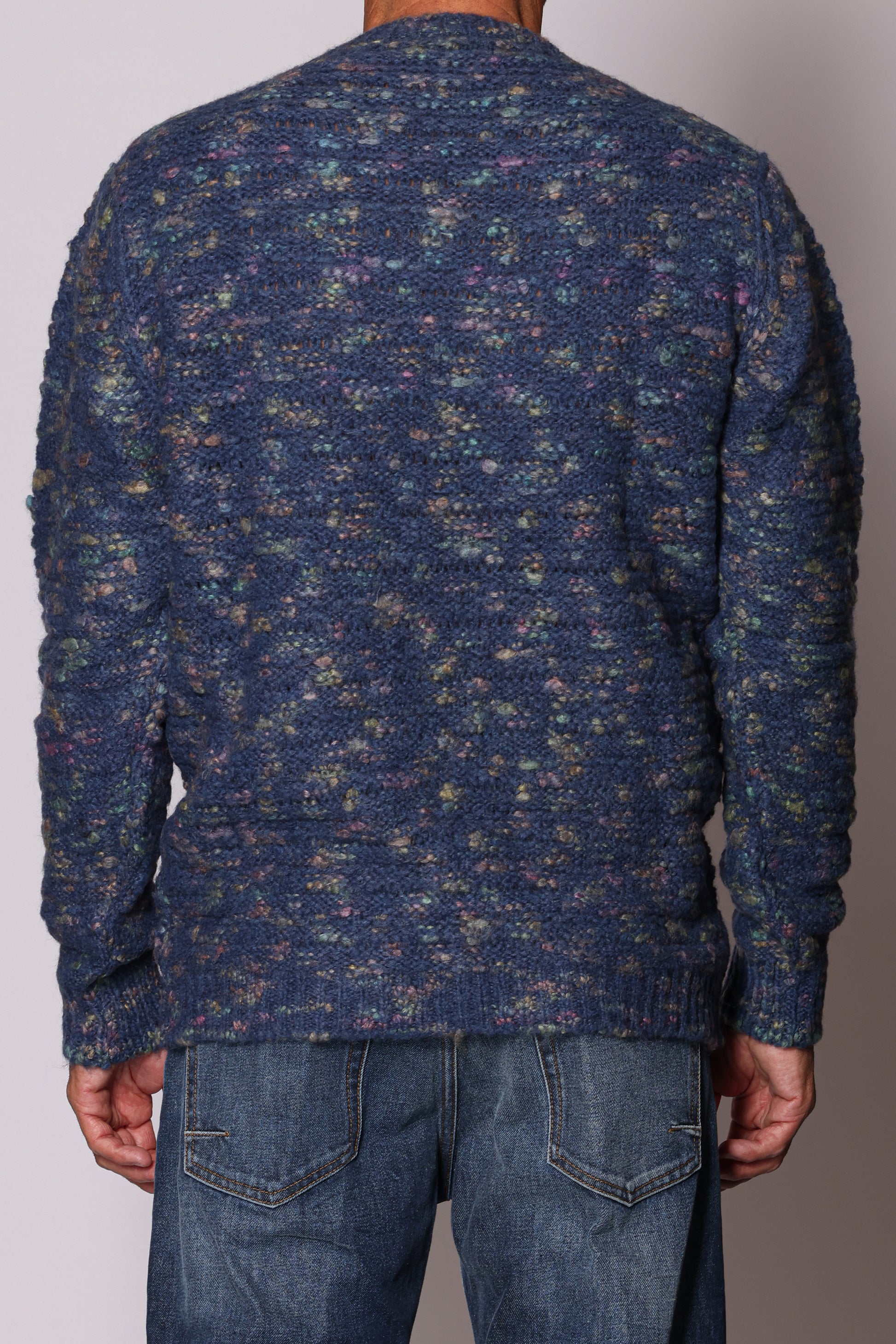 Maglia girocollo multicolor jeans. Composizione: 64% acrilico, 19% poliestere, 17% lana. Il modello è alto 180 cm pesa 74 kg indossa taglia L.