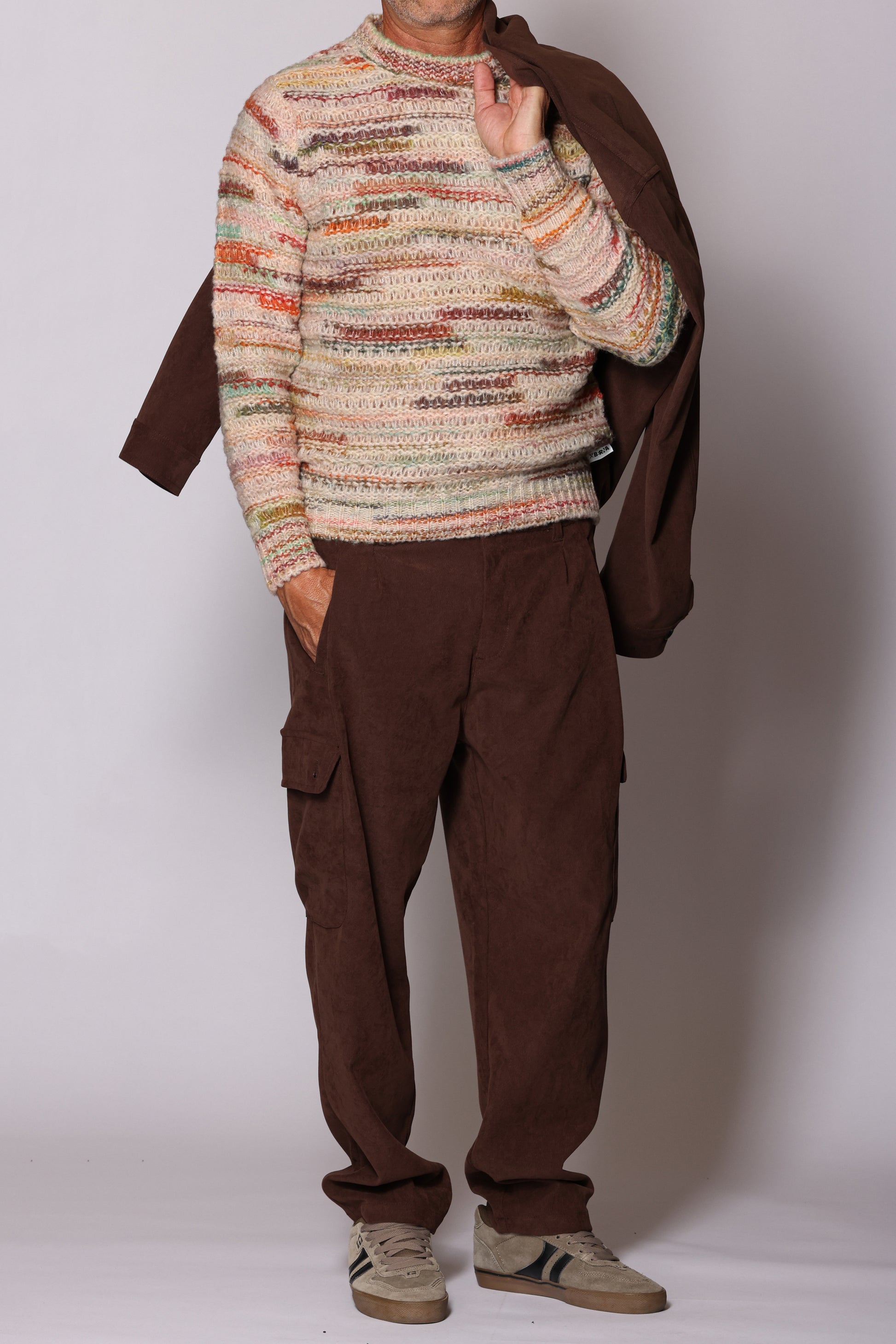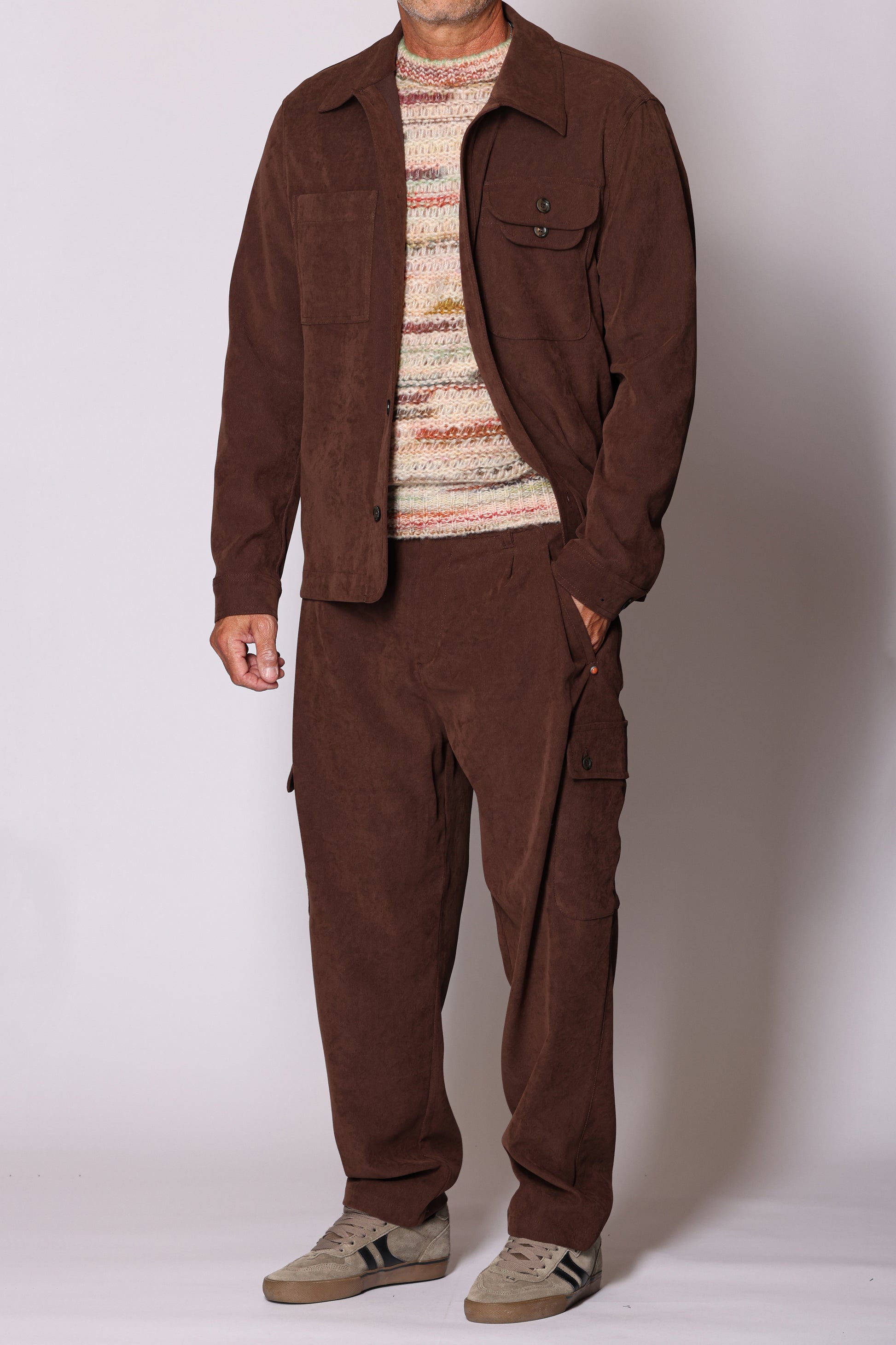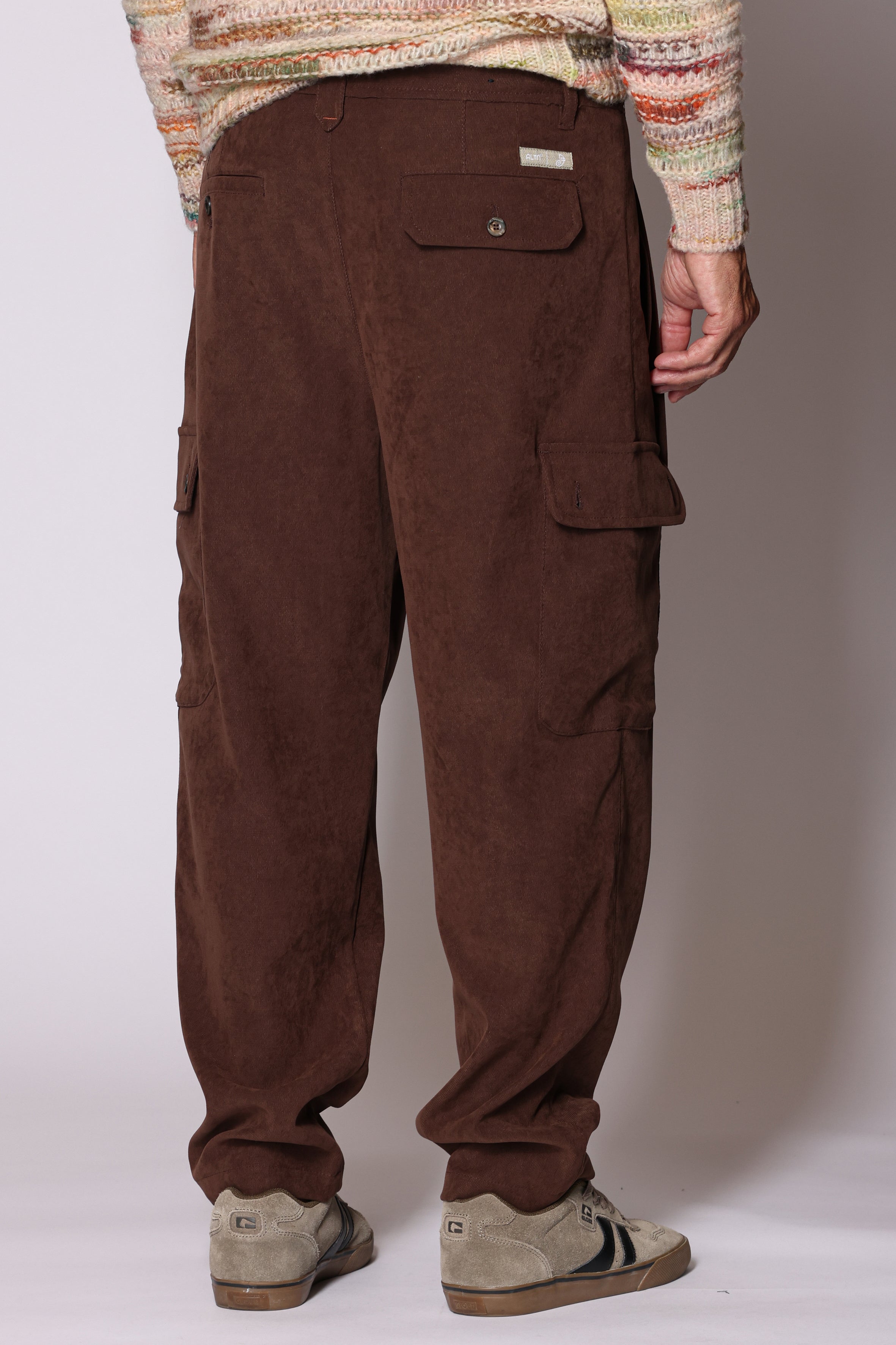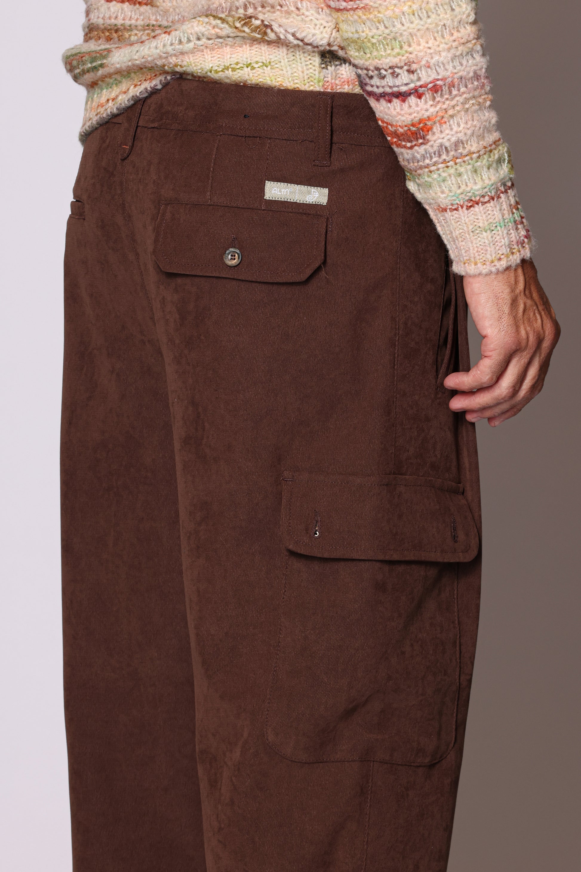 Pantalone japan in velluto a coste strette,  chiusura zip e bottone. Tasche a filo laterali e posteriori di cui una con patta; bordi di rifinitura taglio vivo in vita. Pences sul davanti e tasconi a toppa con patta e bottone laterali. Composizione: 97% poliestere, 3% elastam. Il modello è alto 180 cm pesa 74 kg indossa taglia 48.