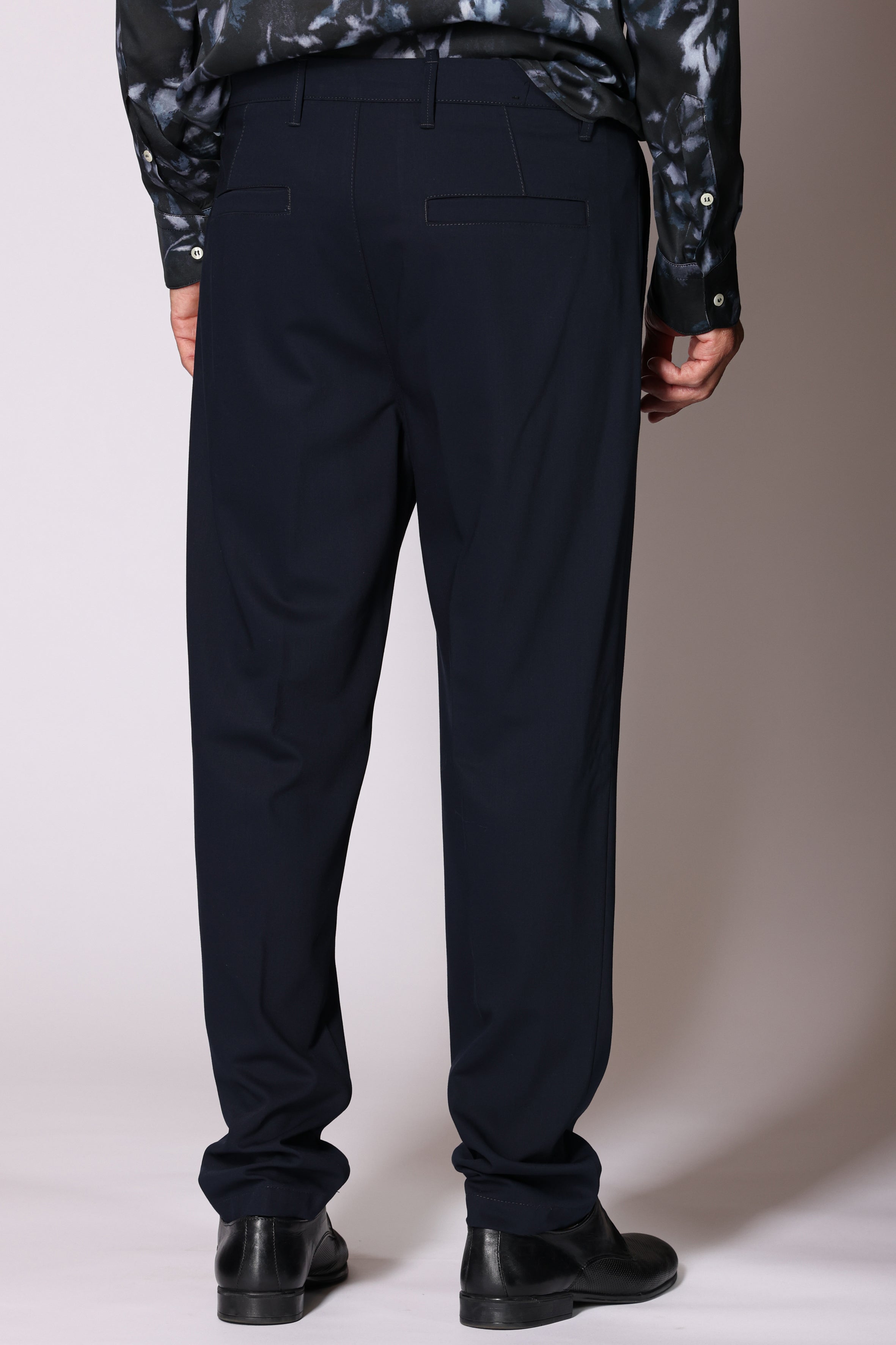 Pantalone chiusura cerniera bottone e laccetto. Tasche a filo laterali e posteriori. Piccola pences sul davanti; cavallo leggermente basso, vestibilità comoda. Composizione: 62% poliestere, 25% viscosa, 8% lana, 5% elastam. Il modello è alto 180 cm pesa 74 kg indossa taglia 48.